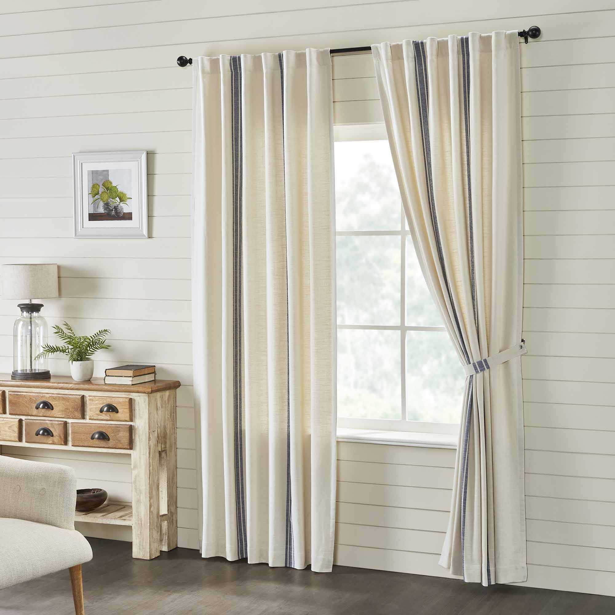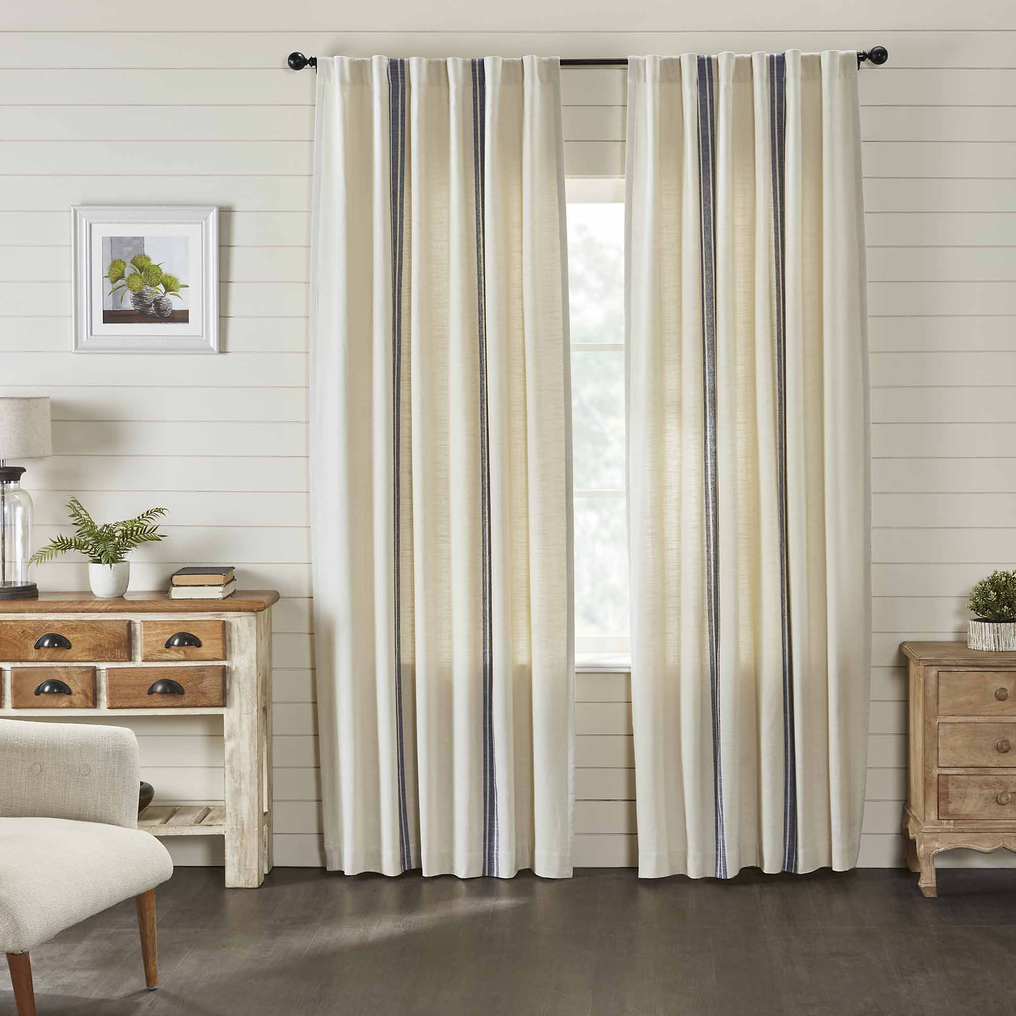 These days we can’t seem to get enough of grain sack fabrics, so this collection is one of our all-time favorites! It’s the perfect look for a fresh farmhouse style home! We chose a beautifully textured cotton fabric with a substantial weight, yet soft touch for the Market Place Fabrics. The woven grain sack stripes in denim blue make a striking contrast to the natural cream base. Two coordinating fabric options in the Market Place Collection offer an easy mix-and-match solution. Panels are lined with white cotton, feature a 3.25″ rod pocket with fabric loops for an alternate hanging option, and they measure 96″L x 50″W. Sold as a set of 2, total width is 100″.