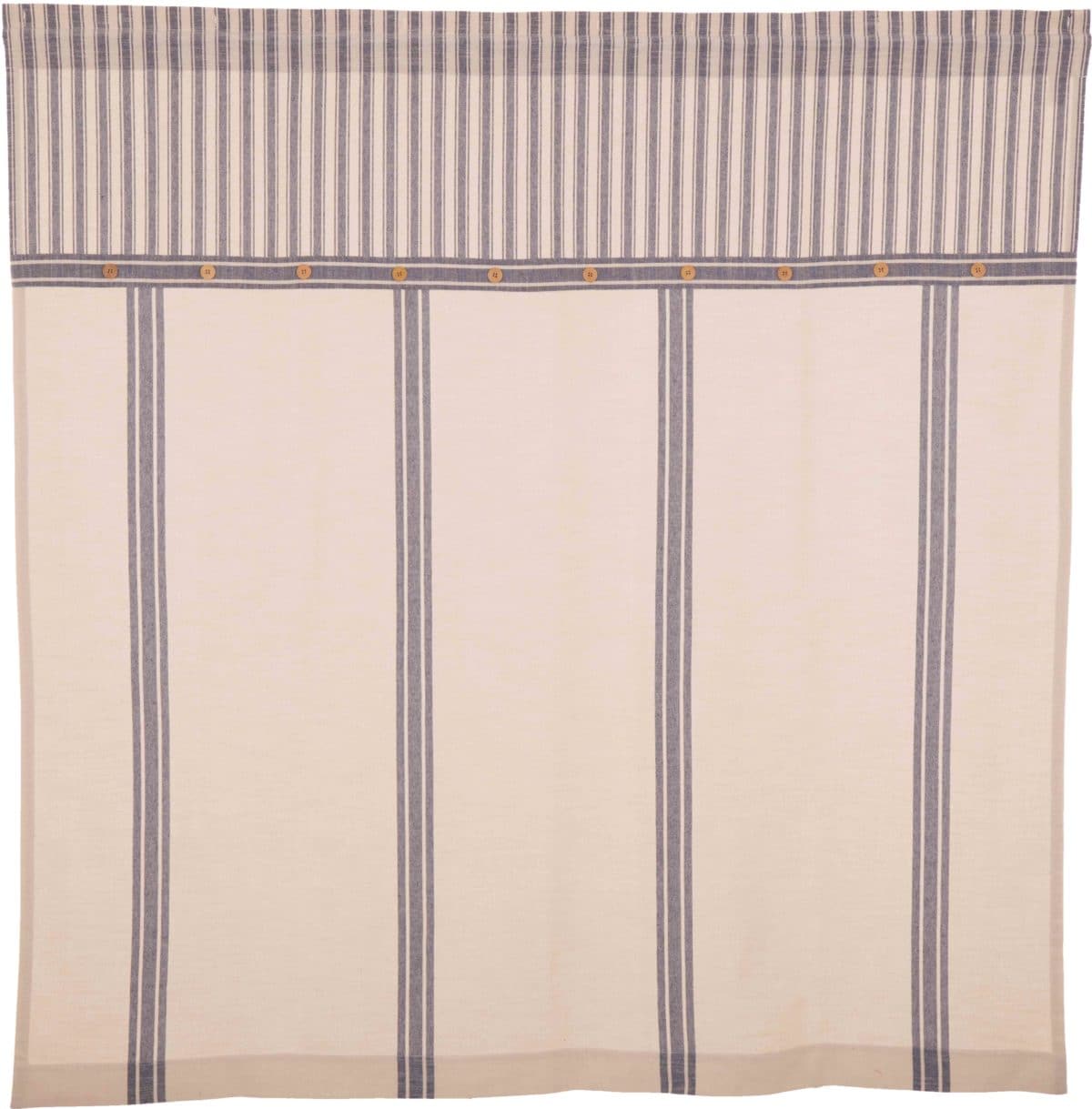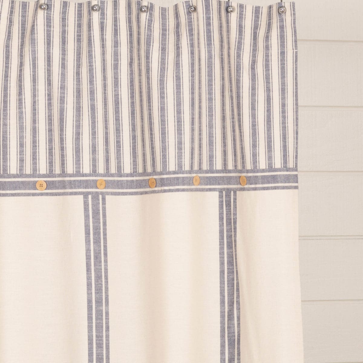 These days we can’t seem to get enough of ticking stripes and grain sack fabrics, so this shower curtain is one of our all-time favorites! It’s the perfect look for a fresh farmhouse style bathroom. We chose a beautifully textured cotton fabric with a substantial weight, yet soft touch for the Market Place Blue Fabrics. The blue denim grainsack stripes contrast beautifully against the natural cream background and ticking stripes in denim blue accent the top of the shower curtain. A row of wooden buttons adds extra detailing. Lined with white cotton. Features 1.5″ header with 1″ buttonholes and 3″ rod pocket. Coordinate your whole bath with any of the curtains in the Market Place Blue Collection.