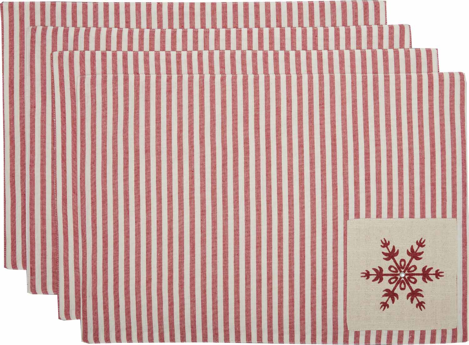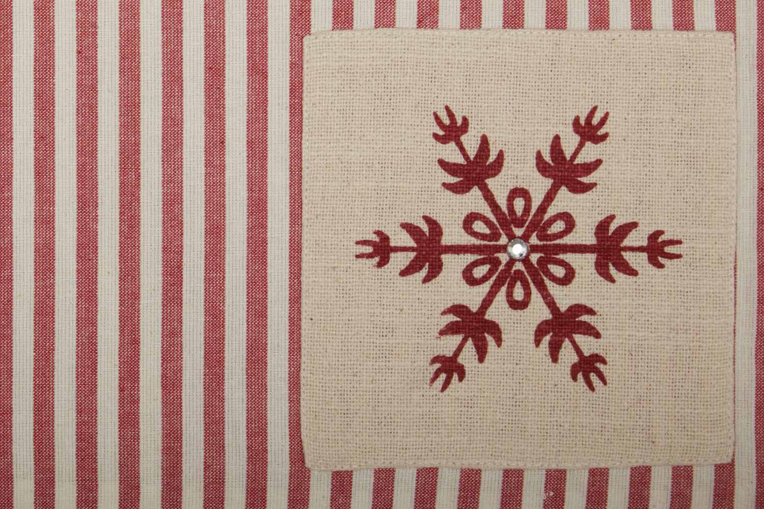 The Market Place Natural Snowflake Collection is one of the most exciting and unique lines we’ve ever created!! It combines the best of farmhouse fabrics in one exciting collection. Featuring lovely bold red and white ticking stripes, the placemat brings a classic vintage pattern to the tabletop. A cream square patch in grain-sack style, textured cotton is beautifully accented with a finely detailed, red stenciled snowflake. The snowflake has a crystal center, bringing holiday sparkle and sophisticated style to the placemat. Reverses to white cotton sheeting fabric which adds a layer of stability and durability. Sold as a Set/4