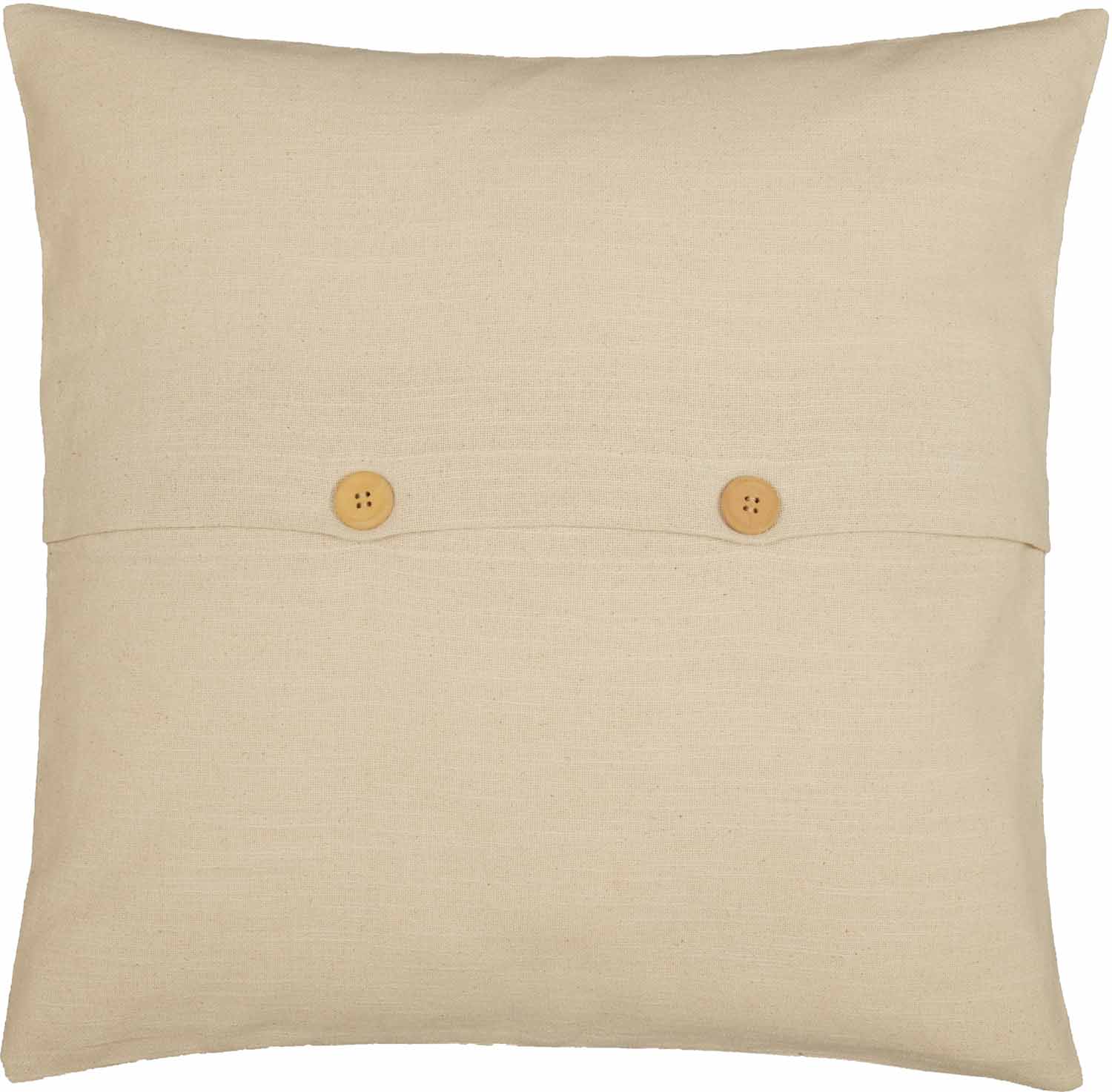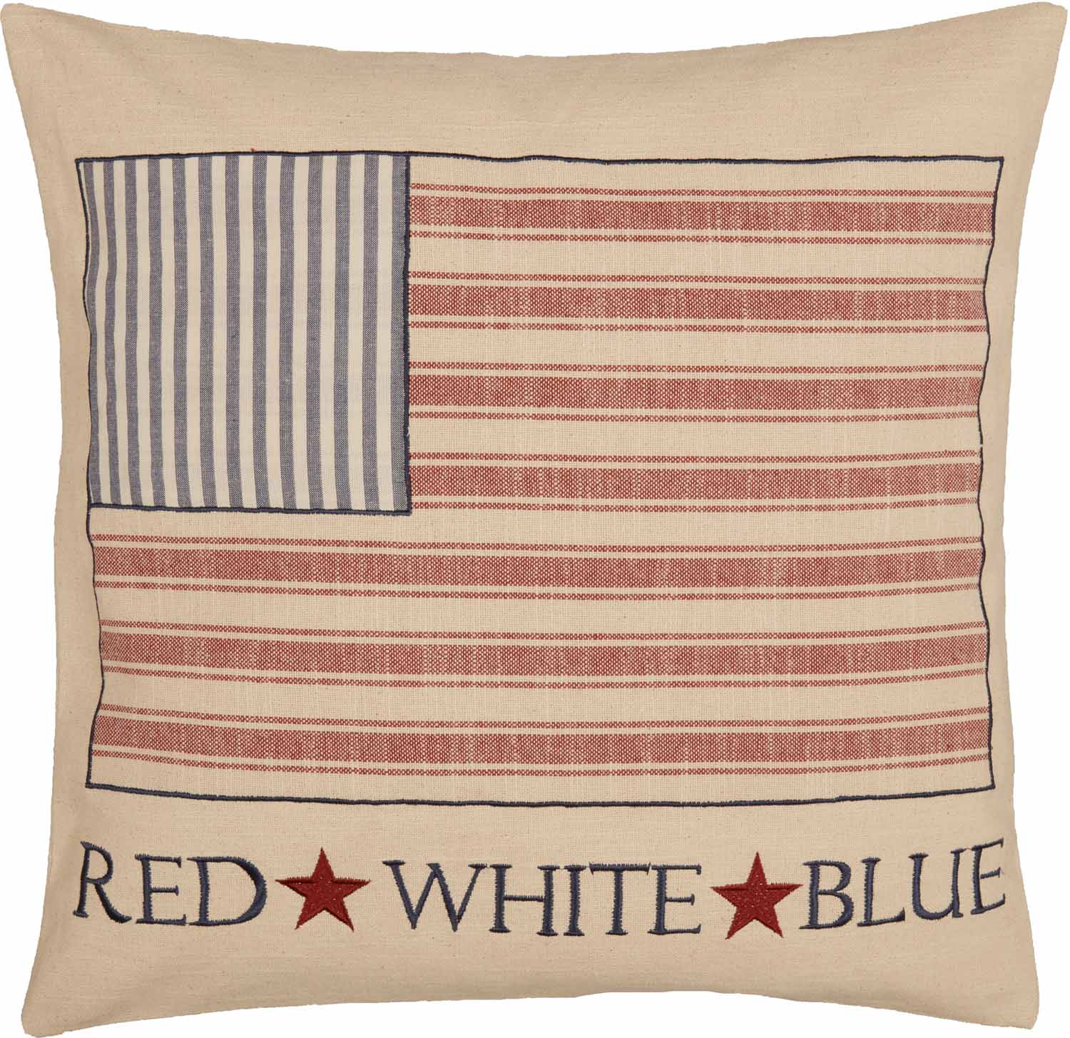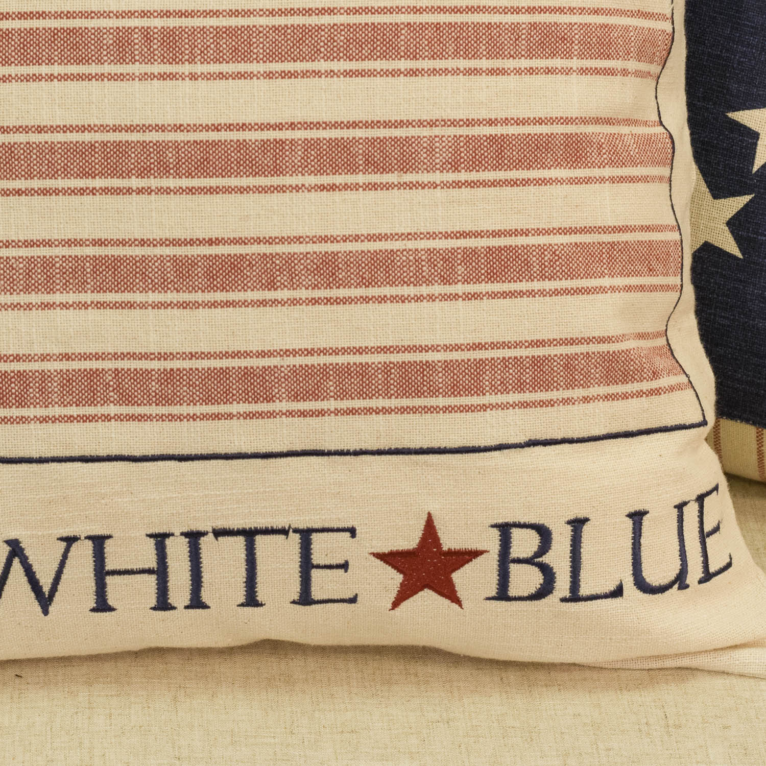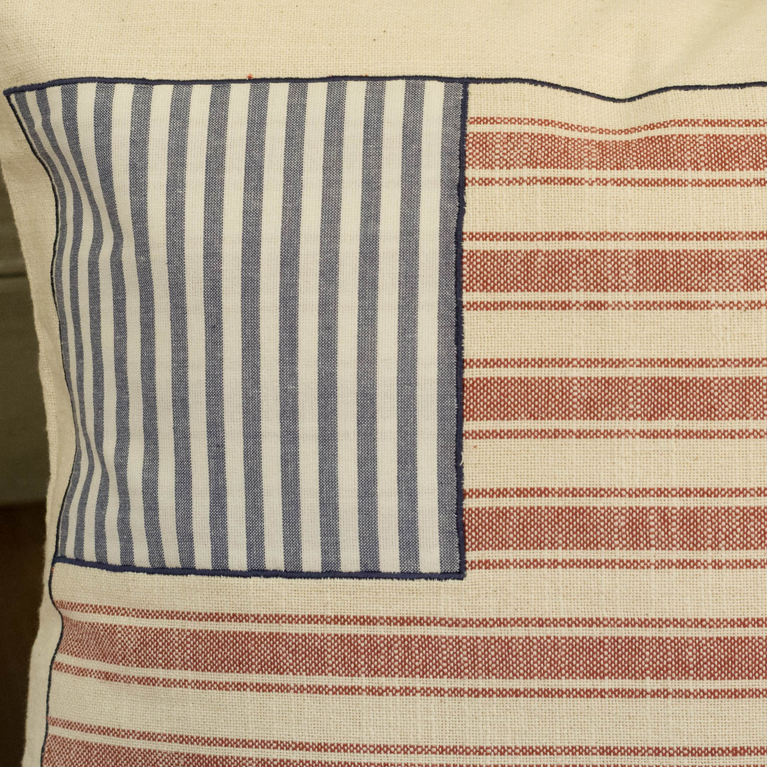 In the delightful Flag Collection, the cotton fabric has a wonderful texture and substantial weight with a surprisingly soft hand feel. A large appliqued patch of Market Place Red and Cream stripes are accented with Farmhouse Ticking Blue and White stripes, in our updated, modern salute to the original American flag, just right for farmhouse styles today. Other details include a rich blue embroidered frame around the flag as well as the words “RED, WHITE, BLUE”. Two deep red embroidered stars bring additional punctuation to the look. Pillow cover reverses to solid cream fabric with 2 natural wooden buttons to secure pillow insert. (1 extra button sewn inside).