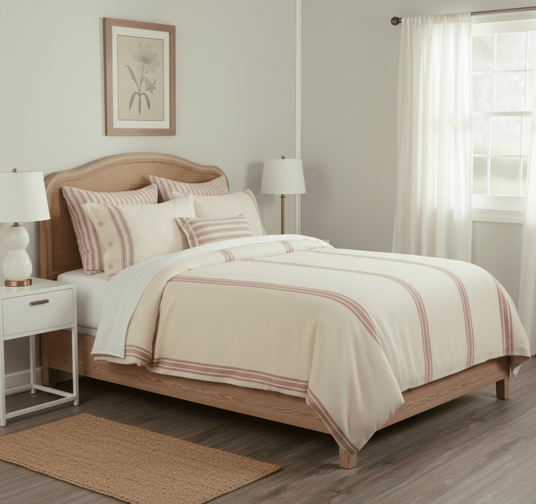 The duvet cover features sets of wide woven stripes in muted brick red that run vertically, making a delightful contrast against the natural cream base, and the rustic weave of the fabric brings a lovely textural appeal to the bedding. The Duvet Cover has multiple wooden buttons to keep the insert secure within and there are 2 extra hidden buttons inside. Twill tape ties are sewn inside the duvet, in the center and four corners, so that you can fasten the insert securely in place and prevent it from bunching up.