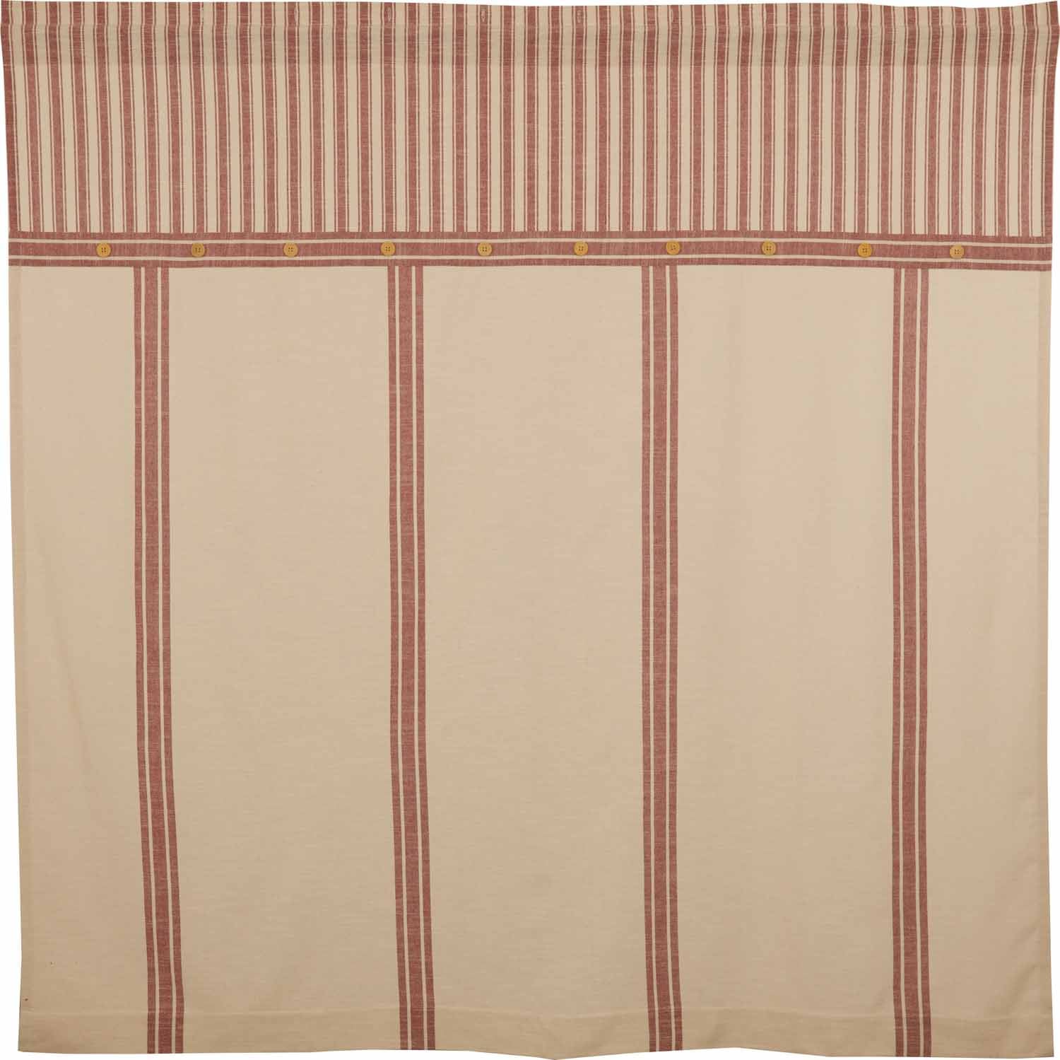 For this collection, we chose a beautifully textured, substantial weight cotton with a surprisingly soft hand feel. The two coordinating fabrics in the Market Place Collection were joined together to create a unique and visually interesting shower curtain. The main part of the curtain features a warm cream fabric with four sets of woven red stripes running vertically down the accent. An 18″ valance of ticking fabric in matching colors adds contrast, dimension and energy to the curtain. Natural wooden buttons offer an organic element and warm texture. The curtain has a header of 1.5″ and a 3″ rod pocket as well as button holes for different hanging options. We suggest use of a vinyl shower liner to protect your floor and the curtain.
