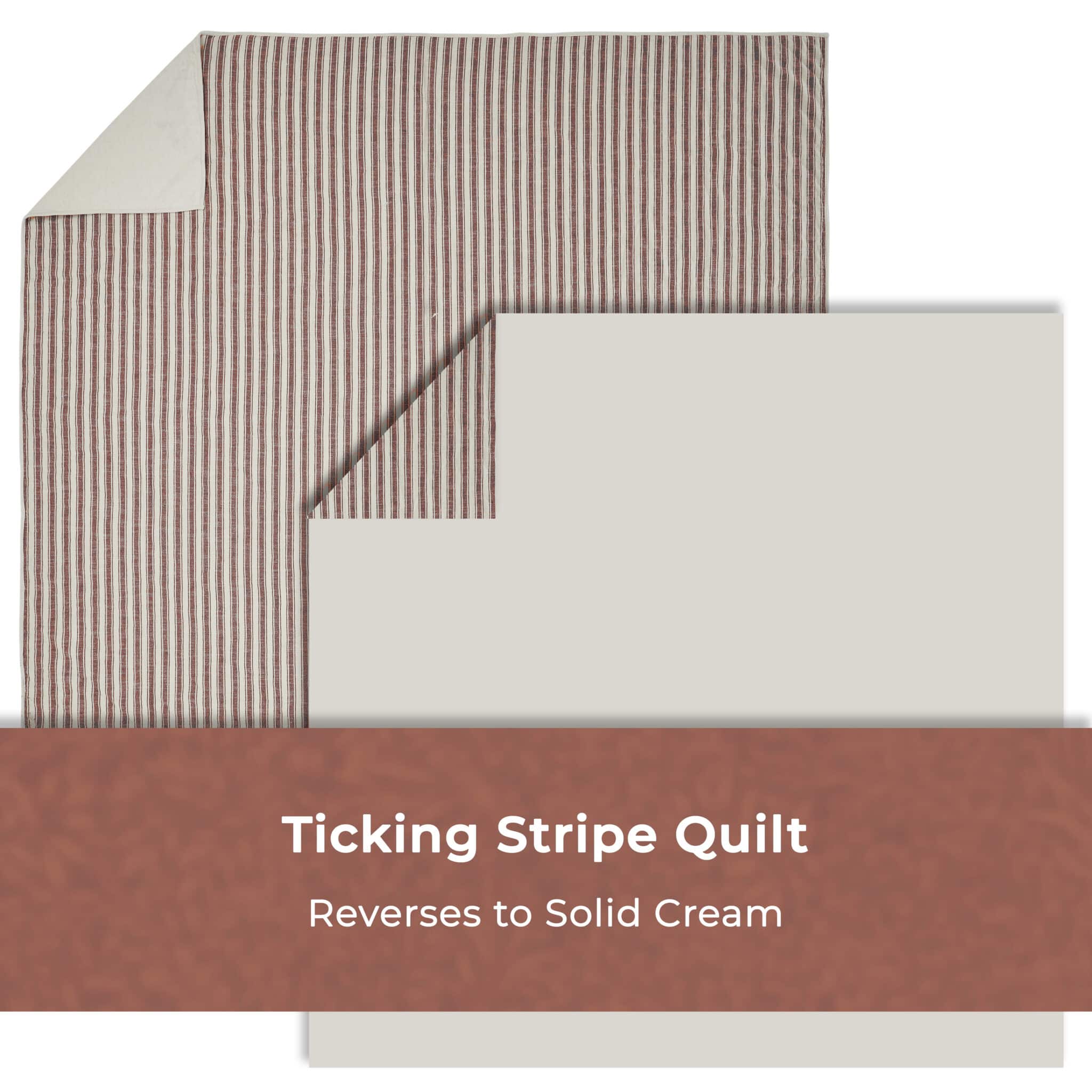 The quilt features repeating woven stripes in muted brick red that make a delightful contrast with the natural cream base. The “on-point” hand-quilting in a diamond design and thick cotton batting lends a lovely texture, dimension, and cozy warmth to the bedding. Reverses to the solid cream fabric.