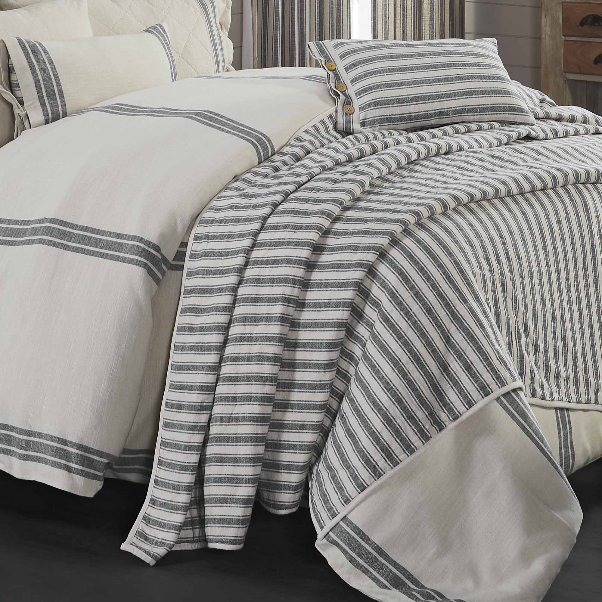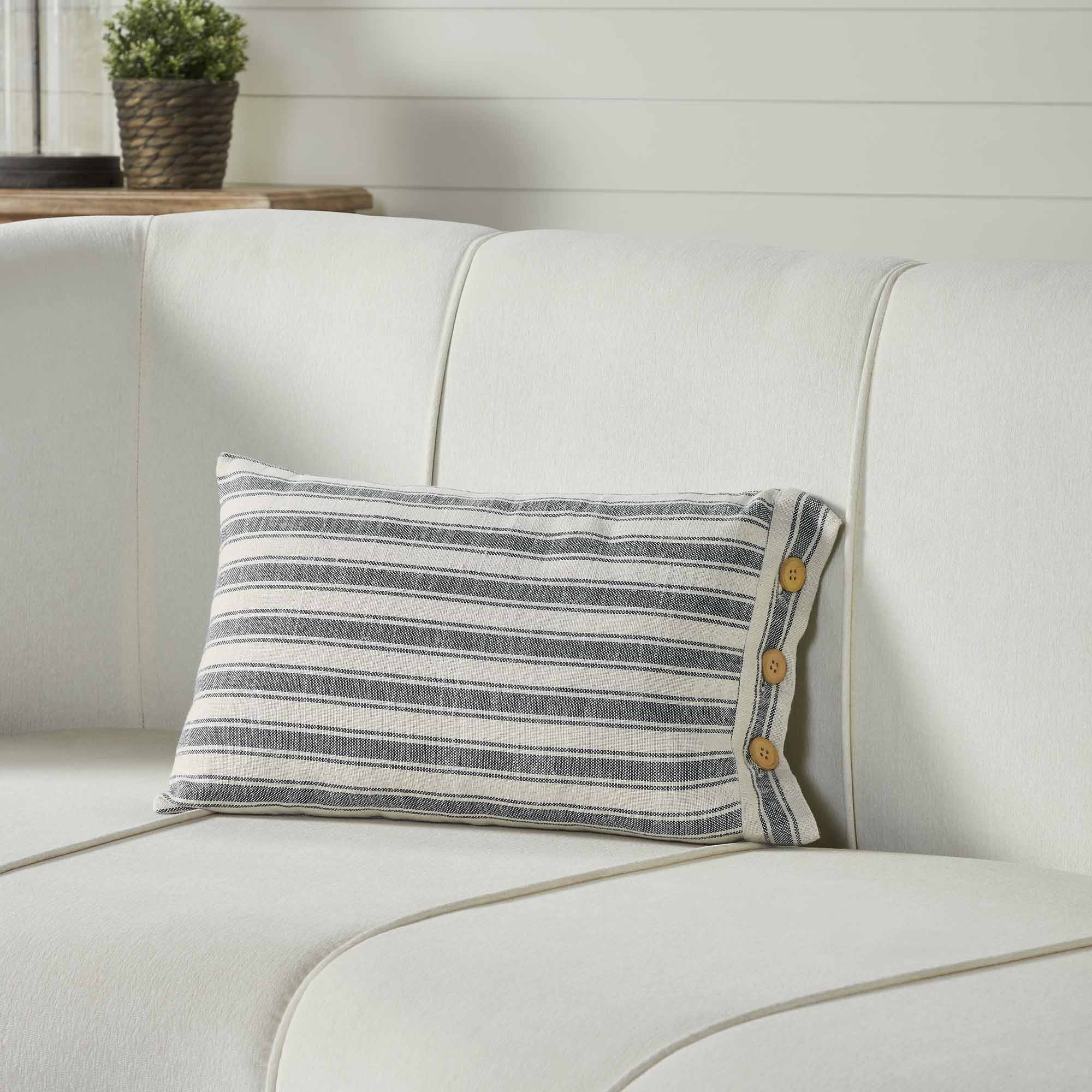 These days, we can’t seem to get enough of ticking stripes and grain sack fabrics, so this collection is one of our all-time favorites! It’s the perfect look for a fresh farmhouse-style home. We chose a beautifully textured cotton fabric with a substantial weight and a soft touch for the Market Place fabrics. The woven ticking stripes in charcoal grey make a striking contrast to the natural cream base. Two coordinating fabric options in the Market Place Collection offer an easy mix-and-match solution. This lumbar-sized pillow features a wide ticking stripe fabric in grey and cream; the fabric reverses to the same design on the back. The ticking stripe changes direction on the end and features the addition of 3 buttons for a decorative detail, which also serves the purpose of enclosing the pillow fill. Pillow Cover only.