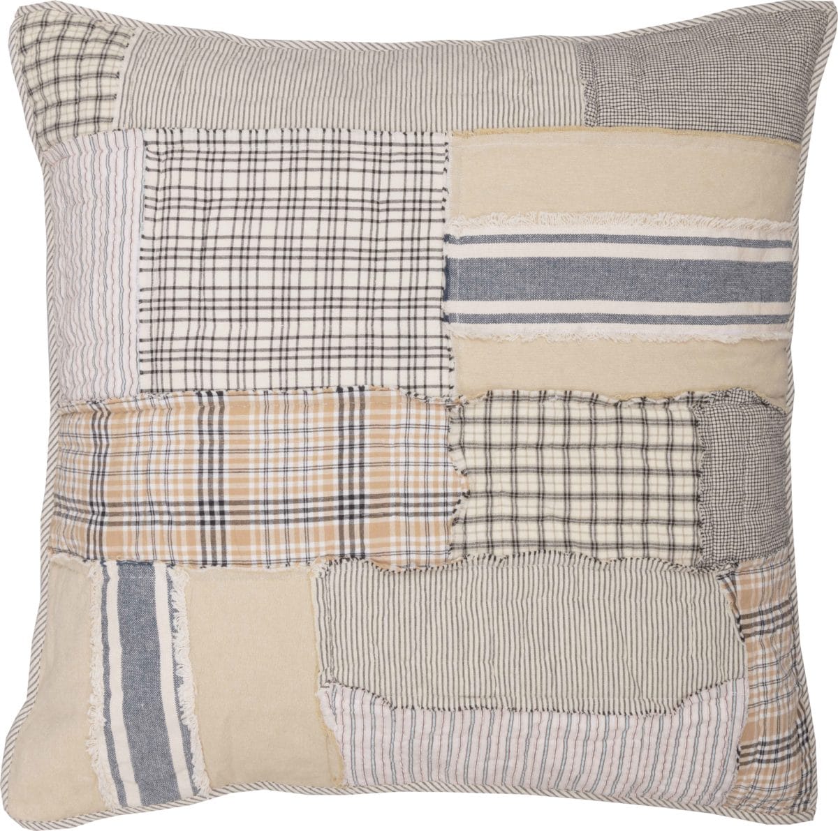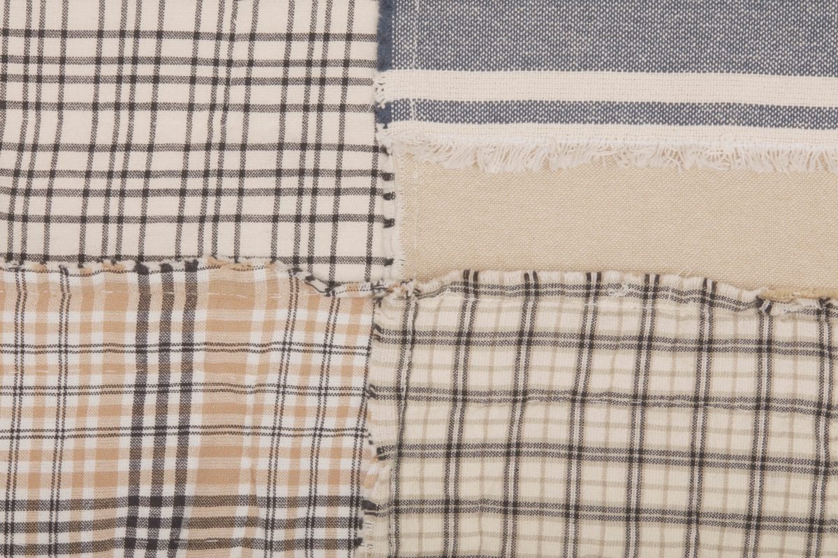 Mill Creek bedding is available exclusively from Piper Classics! We took our inspiration for this quilt from the grain sack striping that’s so popular in today’s farmhouse decor and added it to a variety of subtle plaid and ticking stripe fabrics. The Quilted Euro Sham is hand-quilted and machine pieced featuring an irregular block pattern finished with reverse seams for added texture. Assorted plaids, checks and striped cotton fabrics are used in this pattern and the sham reverses to a charcoal stripe. This easy-going quilt offers a neutral palette of black, beige, and charcoal, with an accent of blue.