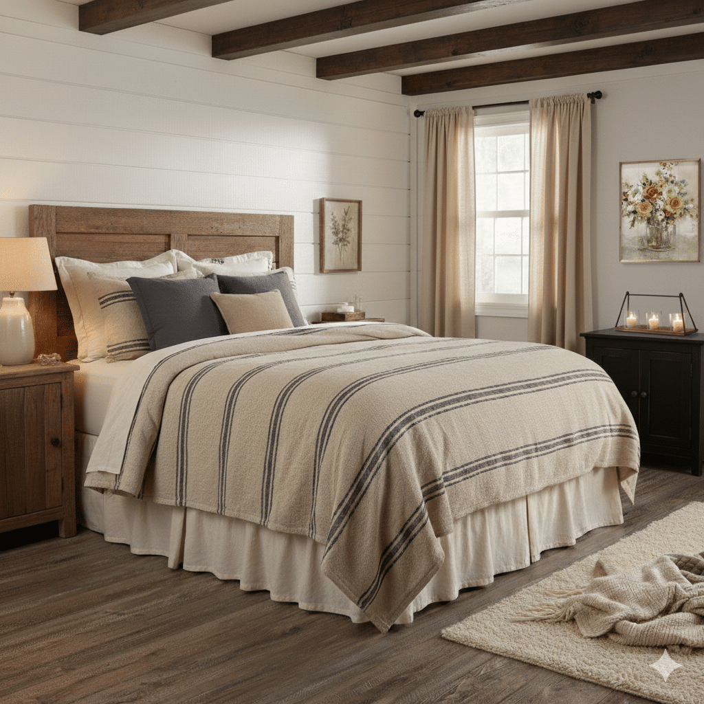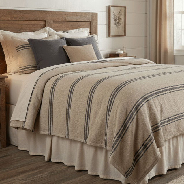 The Mill House Collection brings old-fashioned cottage charm to your farmhouse with the simplicity of “homespun” fabric and timeless grain sack stripes. The heavy-weave material features a rustic texture that softens every setting, adding warmth along with an easy-going, casual style. Our Mill House Stripe Black Coverlets are made of 100% cotton. The neutral background is cool and collected, allowing the soft black stripes to round out the look with a balanced, repetitive design. The charming, unsophisticated style of our original Mill House Collection is sure to strike a chord with farmhouse enthusiasts everywhere!