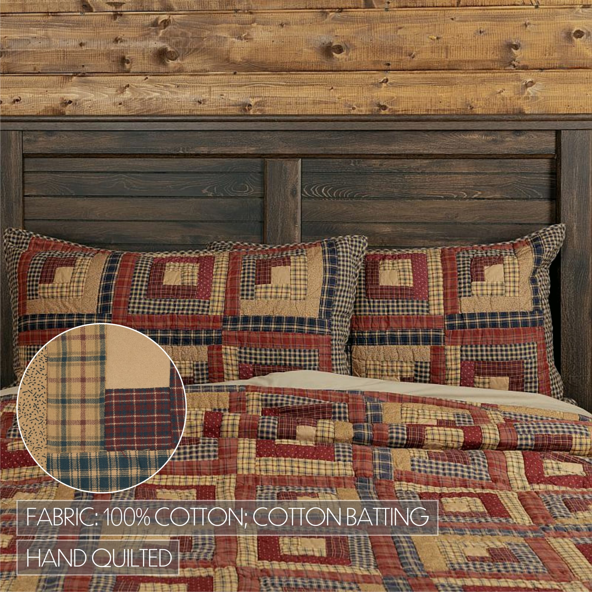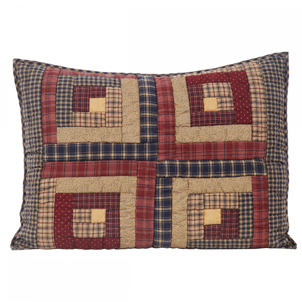 Transform your pillows into soft vintage patchwork comforts with the Millsboro Sham. Featuring a hand-quilted log cabin pattern with a myriad of plaids and ditsy print fabrics in burgundy, tan, and navy hues, our pillow cover brings cozy, homespun appeal to your lodge, lake house, or cabin-style bedroom. Made from 100% cotton down to its batting, this warm rustic sham offers an heirloom-quality feel while being both machine washable and iron-safe. It reverses to navy and tan ditsy print with three tan poly pearl button closures. This product ships directly from our supplier.