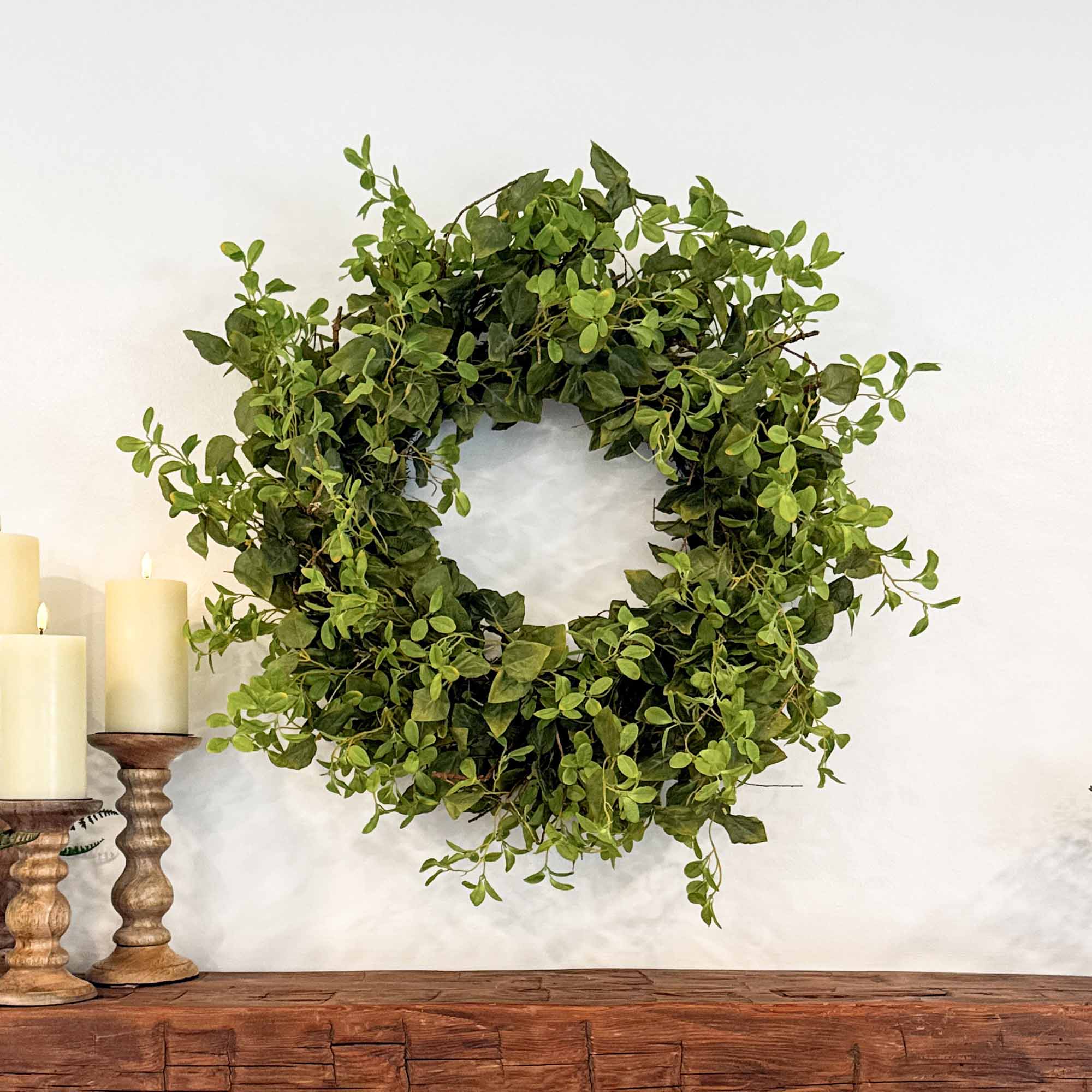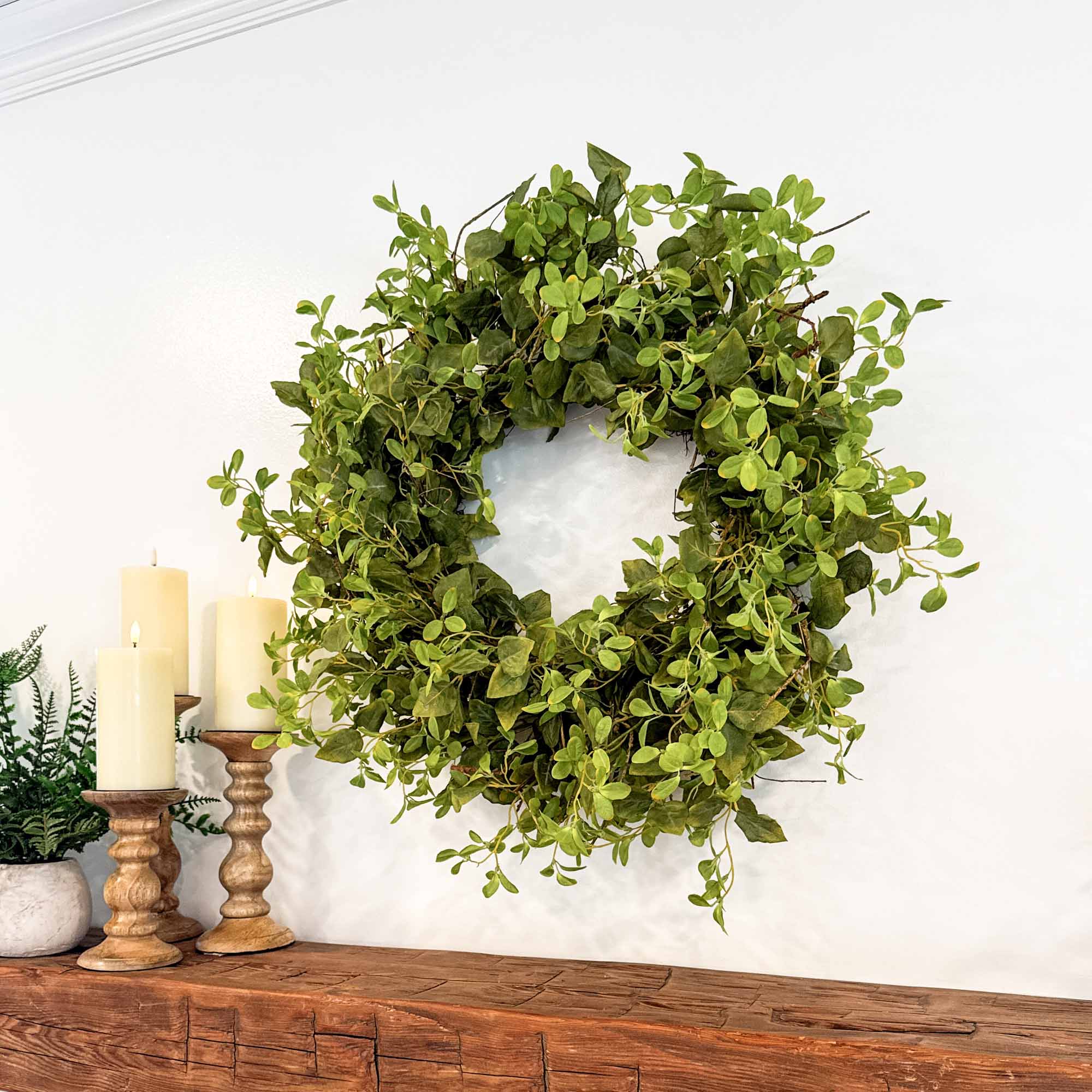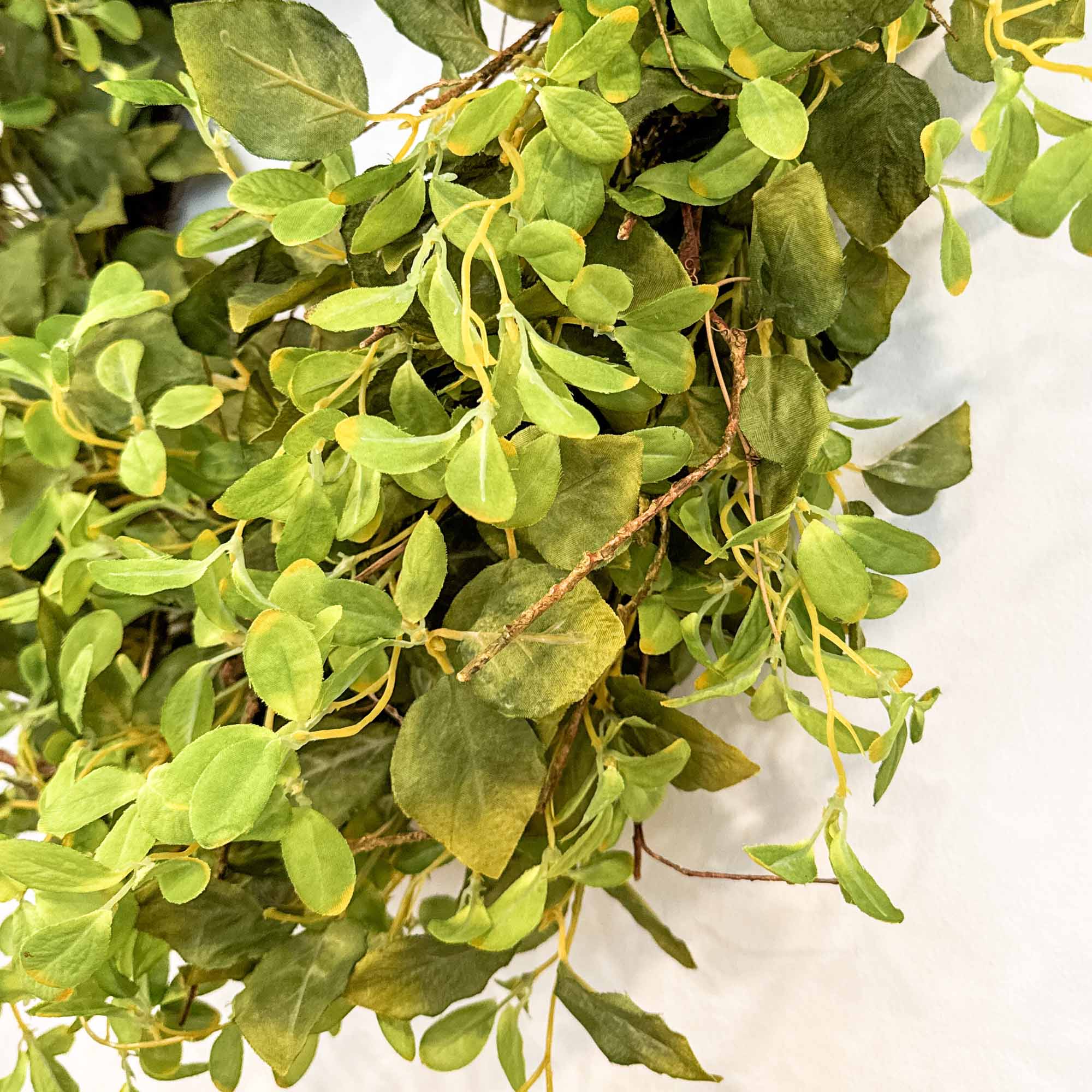 Lush, assorted foliage in realistic green tones creates a fresh and vibrant display, while the natural twig base adds depth, texture, and rustic appeal. Whether styled as a year-round greenery piece or refreshed with seasonal accents, its timeless design makes it a versatile addition to farmhouse, modern rustic, or country-style decor. Crafted with high-quality faux leaves, this wreath is built to maintain its beauty for seasons to come.