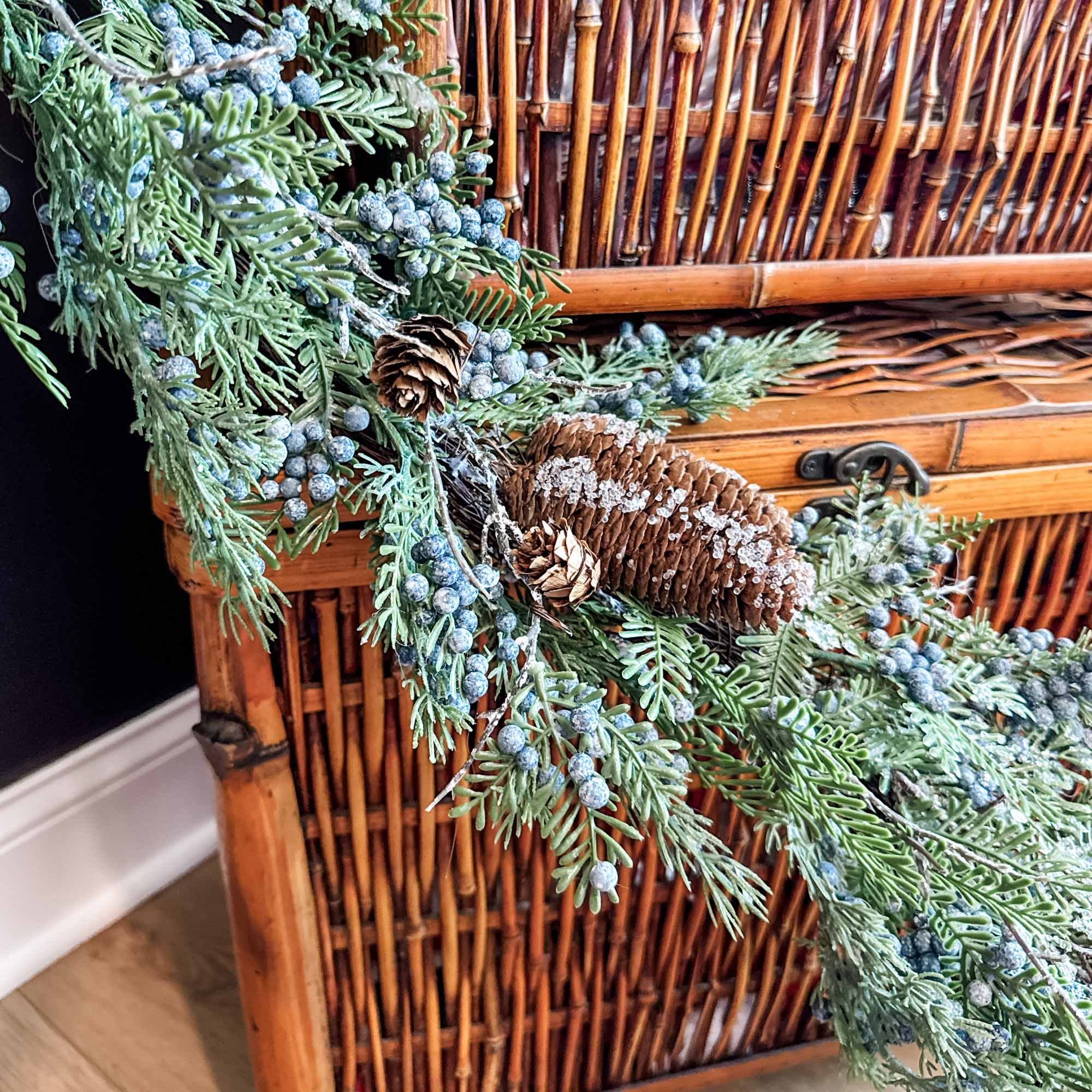 Bring a touch of woodland elegance to your home with the Mixed Juniper Berry Garland. This lush accent piece features a beautiful blend of lifelike juniper greenery, soft blue berry clusters, and natural pinecones for a rustic, winter-inspired look. The earthy green tones and frosted blue accents offer just the right mix of texture and seasonal charm.