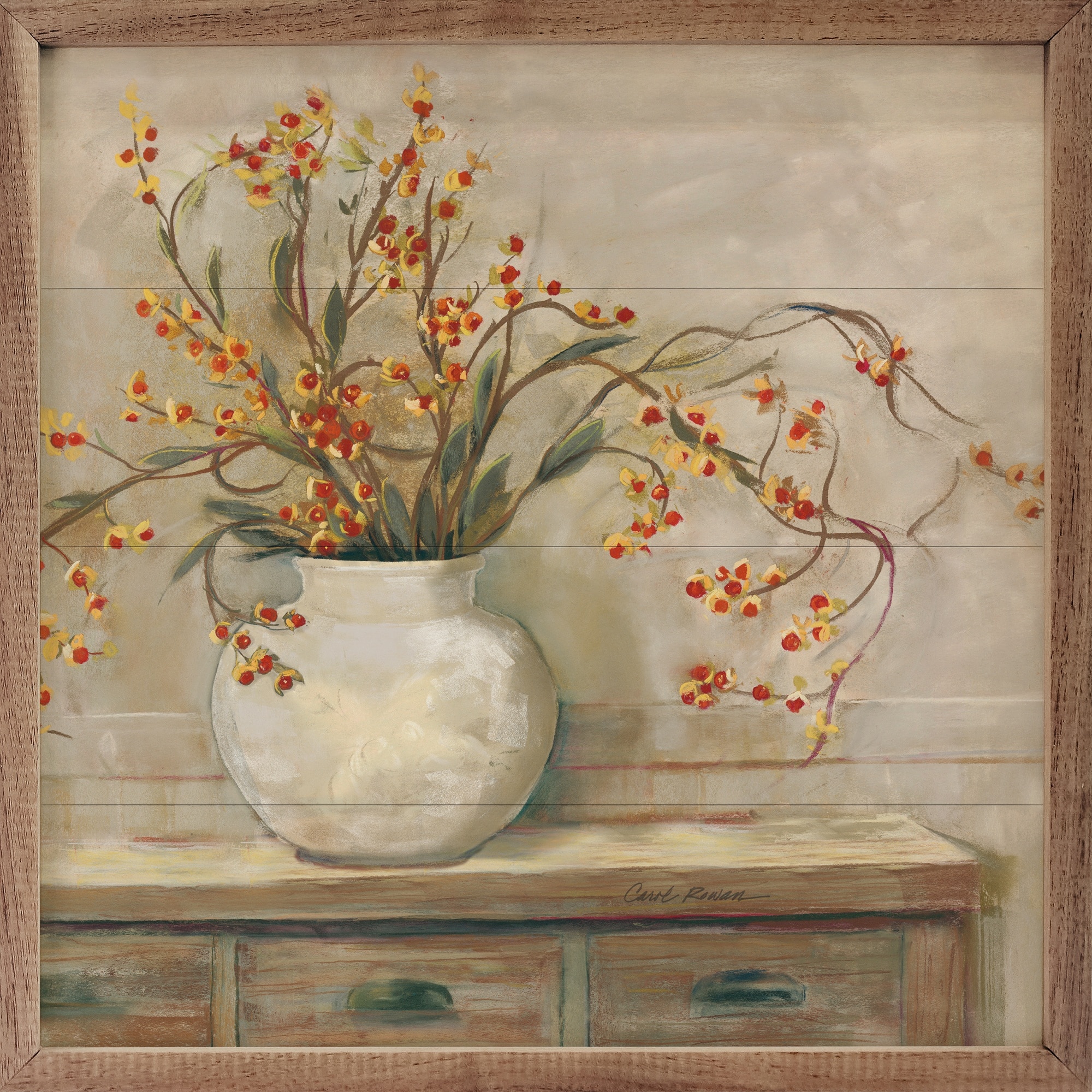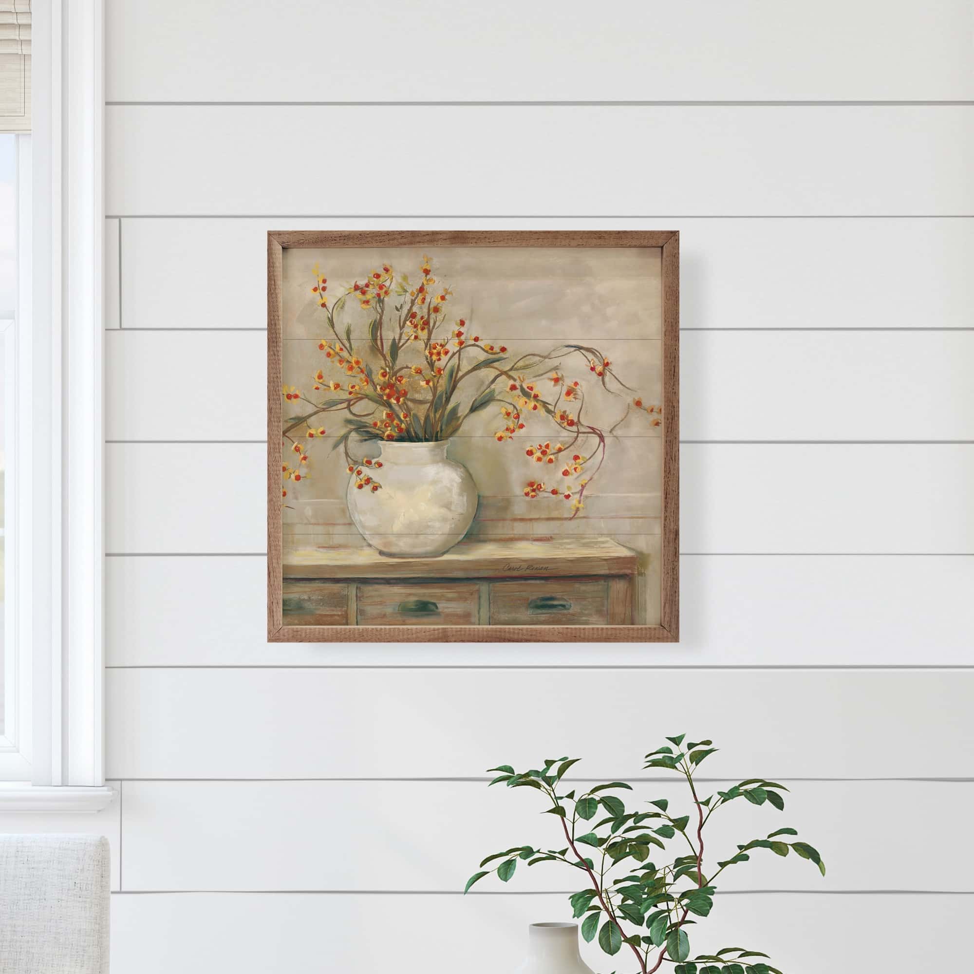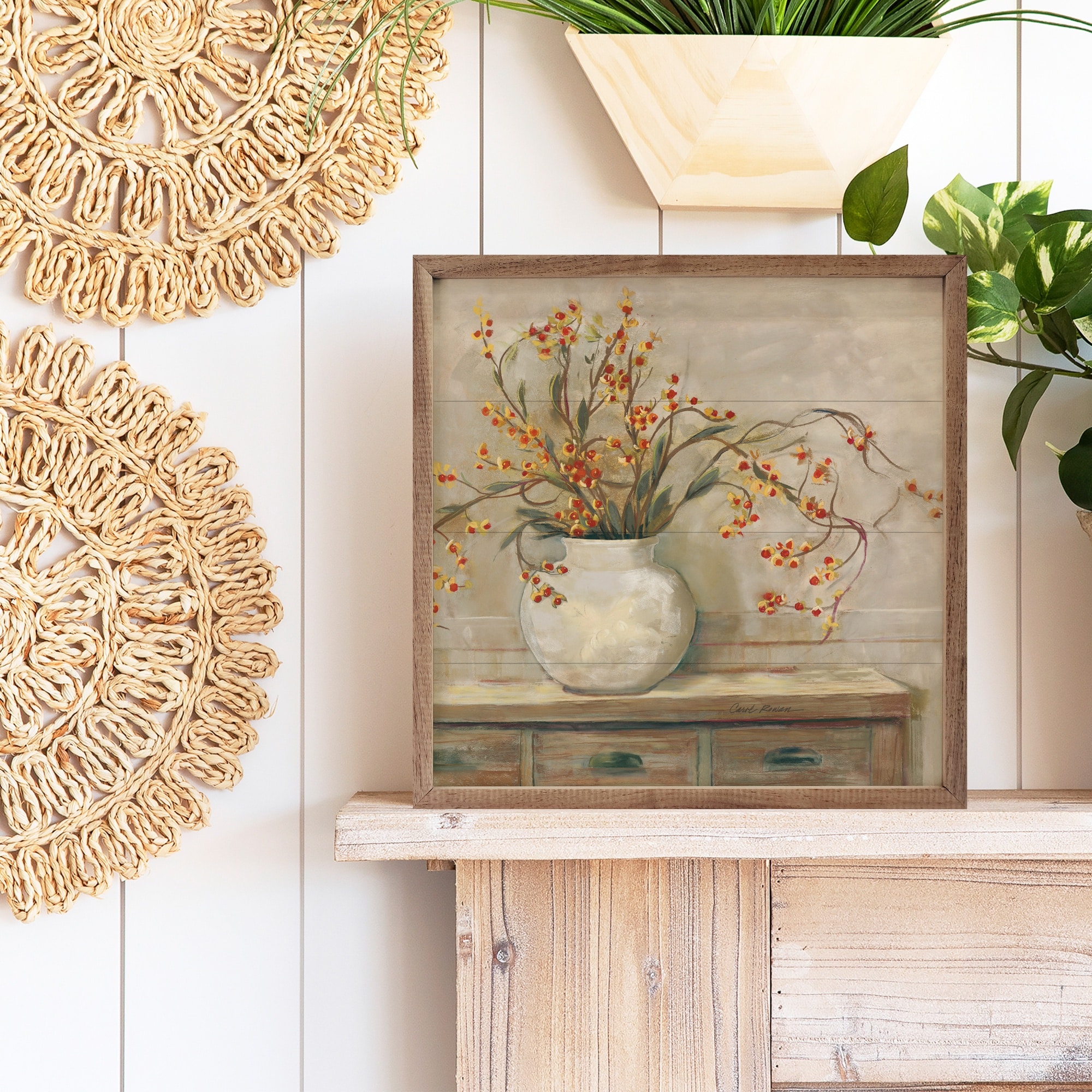 The Nancy Bittersweet Neutral Wooden Sign captures the beauty of autumnal warmth with its soft neutral tones and delicate bittersweet branches. The artwork, by Carol Rowan, features a rustic vase filled with vibrant orange and red bittersweet berries, elegantly set against a muted backdrop. The combination of earthy colors and intricate details adds a touch of natural charm to any space, making it perfect for bringing the season’s beauty indoors. The wooden construction and simple walnut frame enhance its farmhouse appeal, ideal for adding a cozy, seasonal touch to your decor. Signs are made to order.