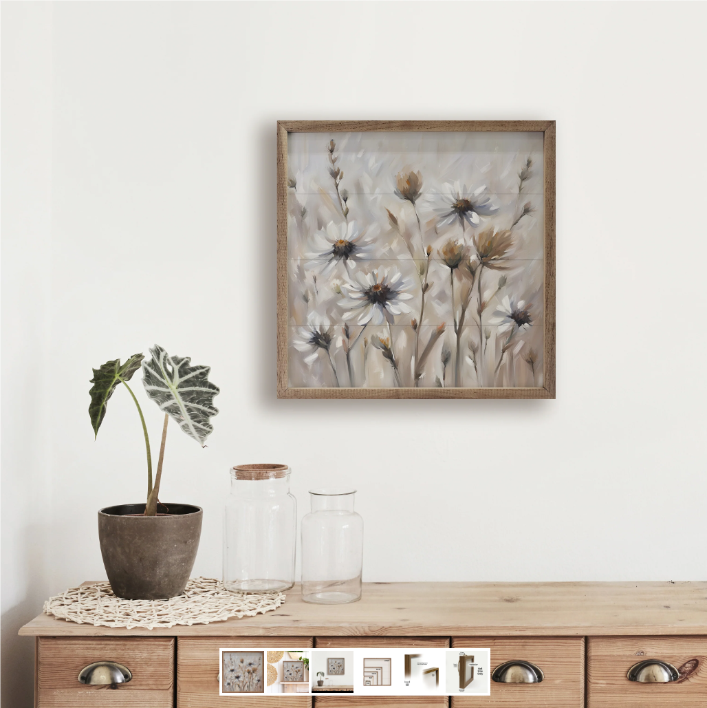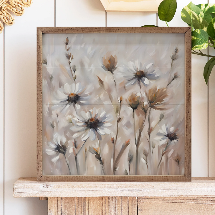 Breathe serenity into your space with this Neutral Daisy Field Wooden Sign. This softly painted floral scene features delicate white daisies and budding stems swaying against a gentle backdrop of cream, taupe, and earthy blush tones. Each brushstroke is rendered with impressionist flair, creating a sense of light movement and peaceful stillness. Finished with a rustic wooden frame, this piece is perfect for bedrooms, hallways, or any corner needing a soft botanical touch. The subtle color palette makes it an easy fit for farmhouse, boho, or cottage-inspired decor. Signs are made to order.