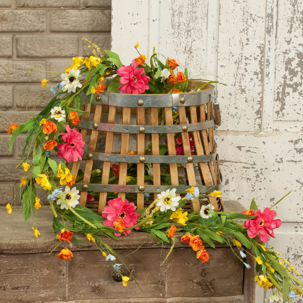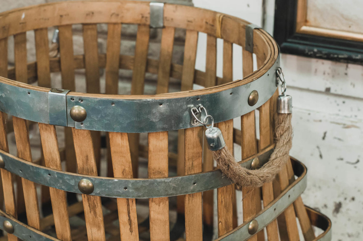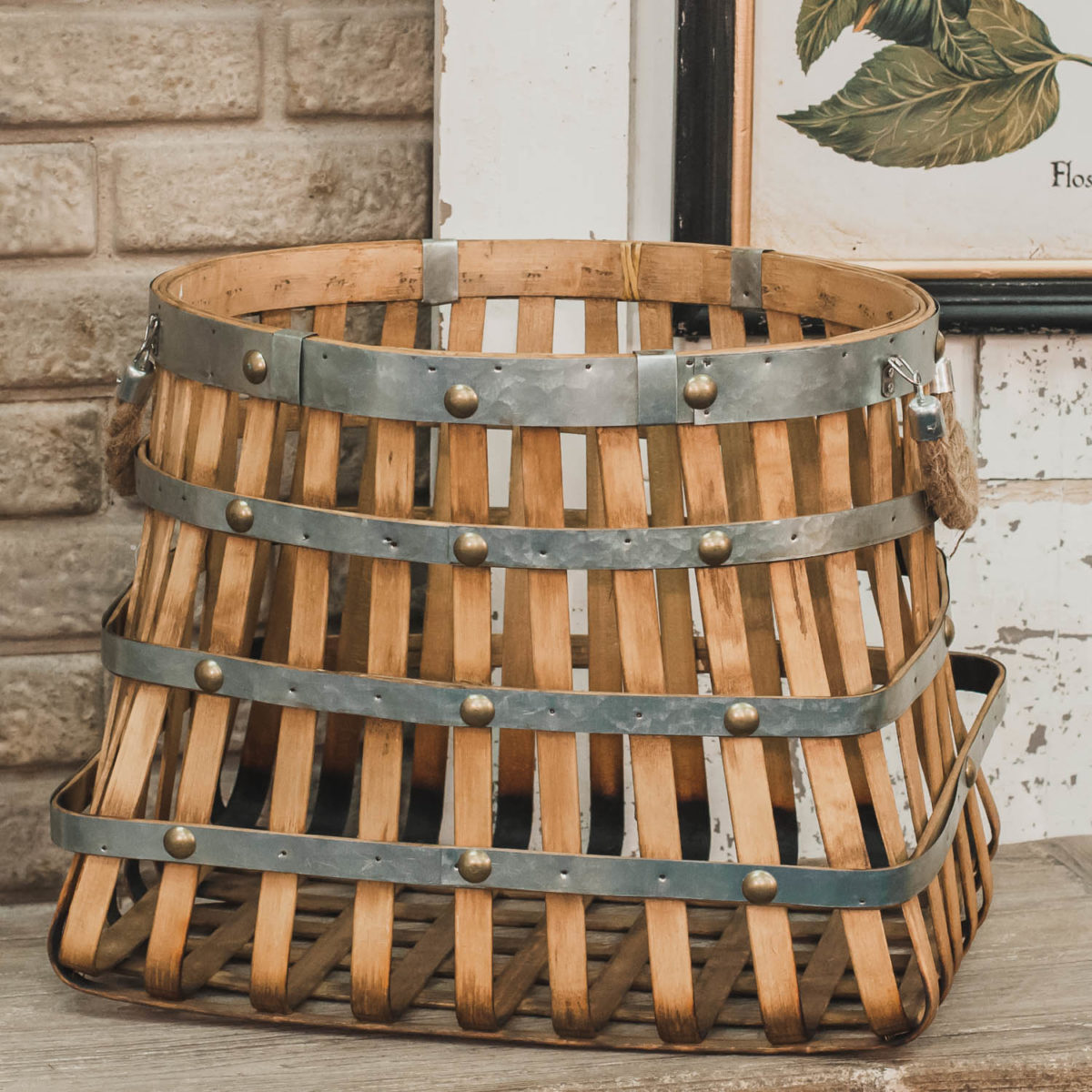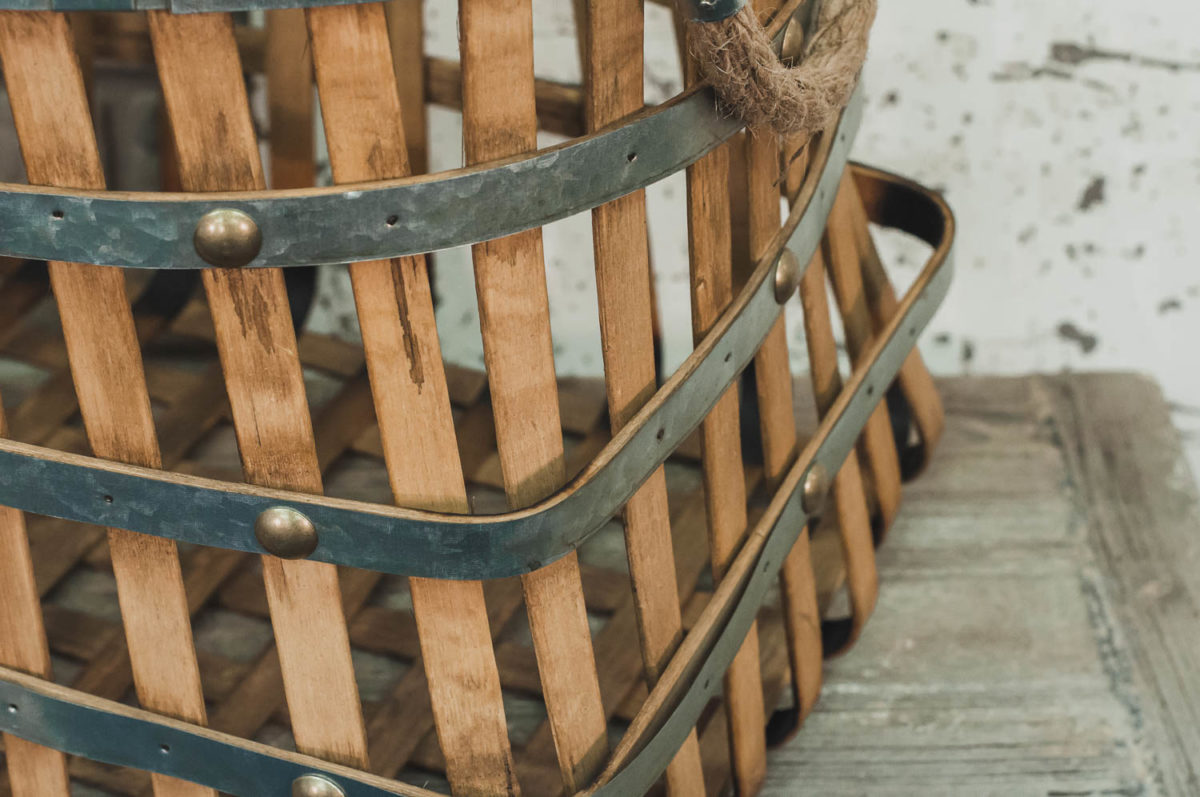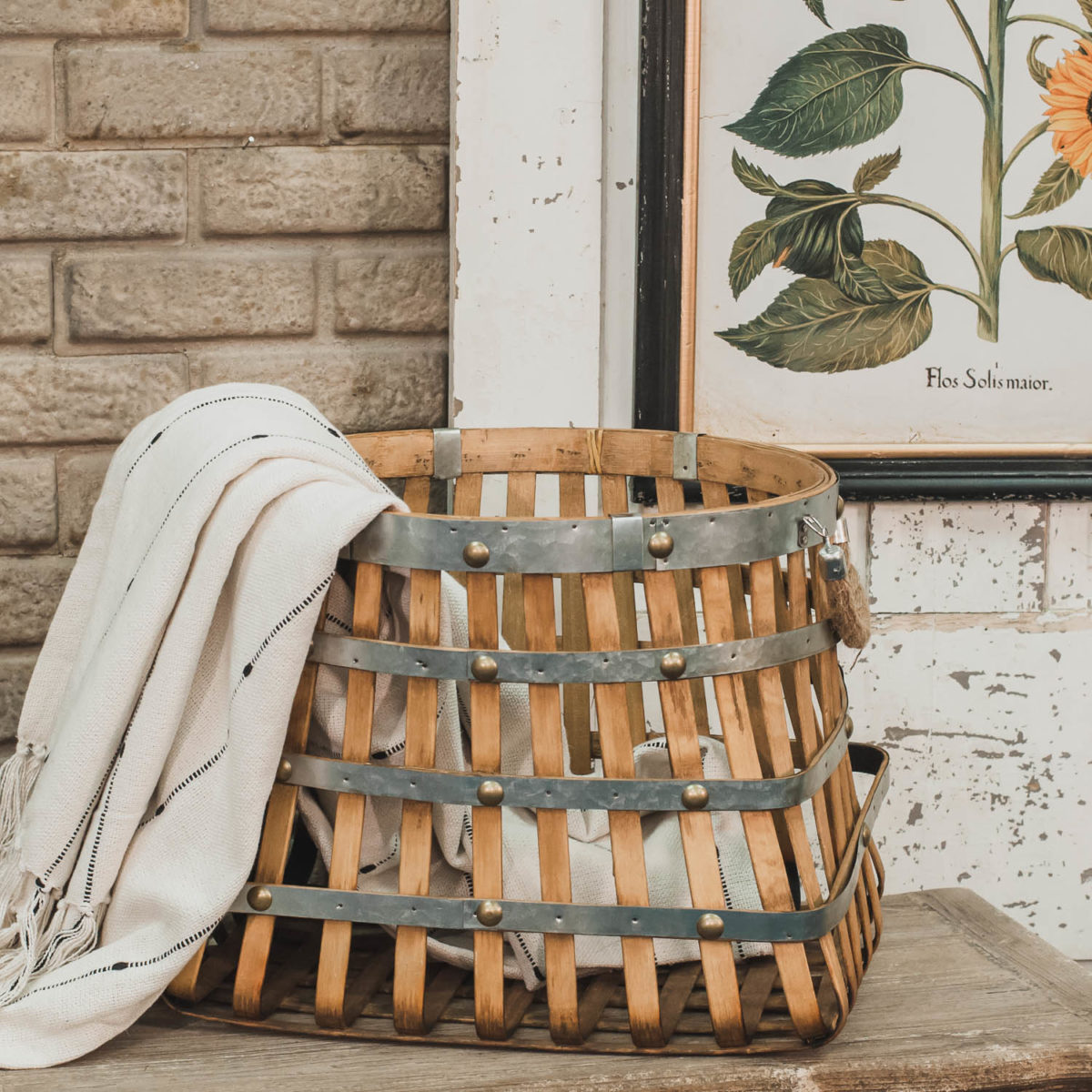 You are going to love what the amazing Open Weave Basket brings to your farmhouse this season. With interesting features and textures, this accent is sure to add a dynamic decorative touch wherever you choose to display it. Wood slats in a warm natural tone and silver metal bands complement each other artfully, creating a sturdy basket that will stand up to the everyday wear and tear of your modern lifestyle. Small golden rivets offer a lovely detail, contrasting against cool tones, and rope handles add rich texture and a practicality to the basket. The generous size ensures that you will find multiple uses for it, whether holding blankets, toys, birch branches or the like. Best indoors or in a protected area outside.