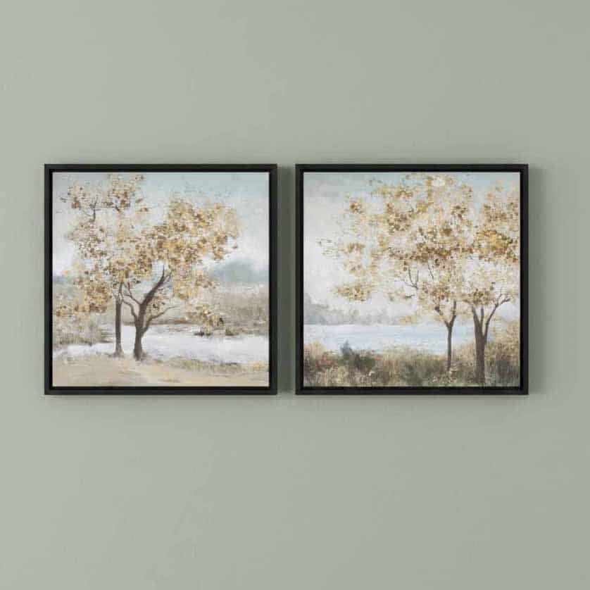 Create a calm, inviting atmosphere in your home with the Quiet Grove Framed Tree Canvas Art Set. This thoughtfully curated set of two features tranquil tree landscapes rendered in soothing blue and beige tones, offering a timeless blend of natural beauty and understated elegance. The soft color palette and organic subject matter bring a peaceful, grounded feel that works beautifully in cottage, farmhouse, coastal, or contemporary interiors.
