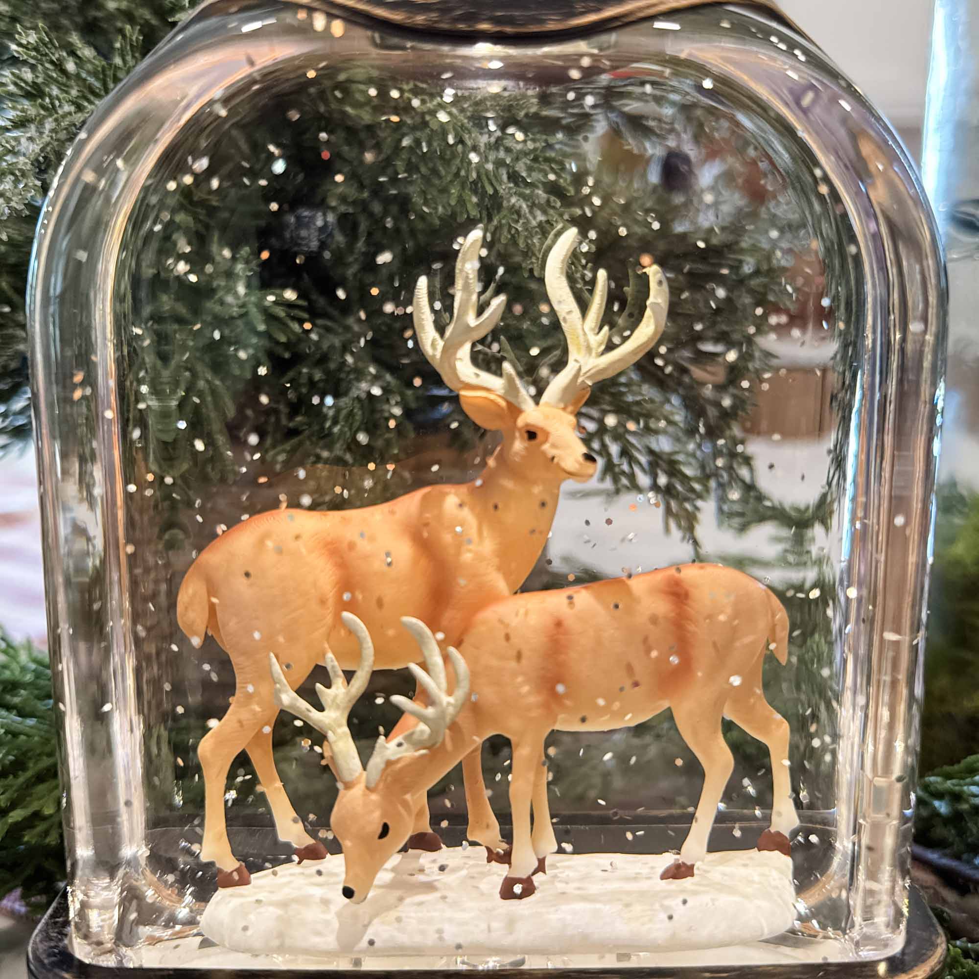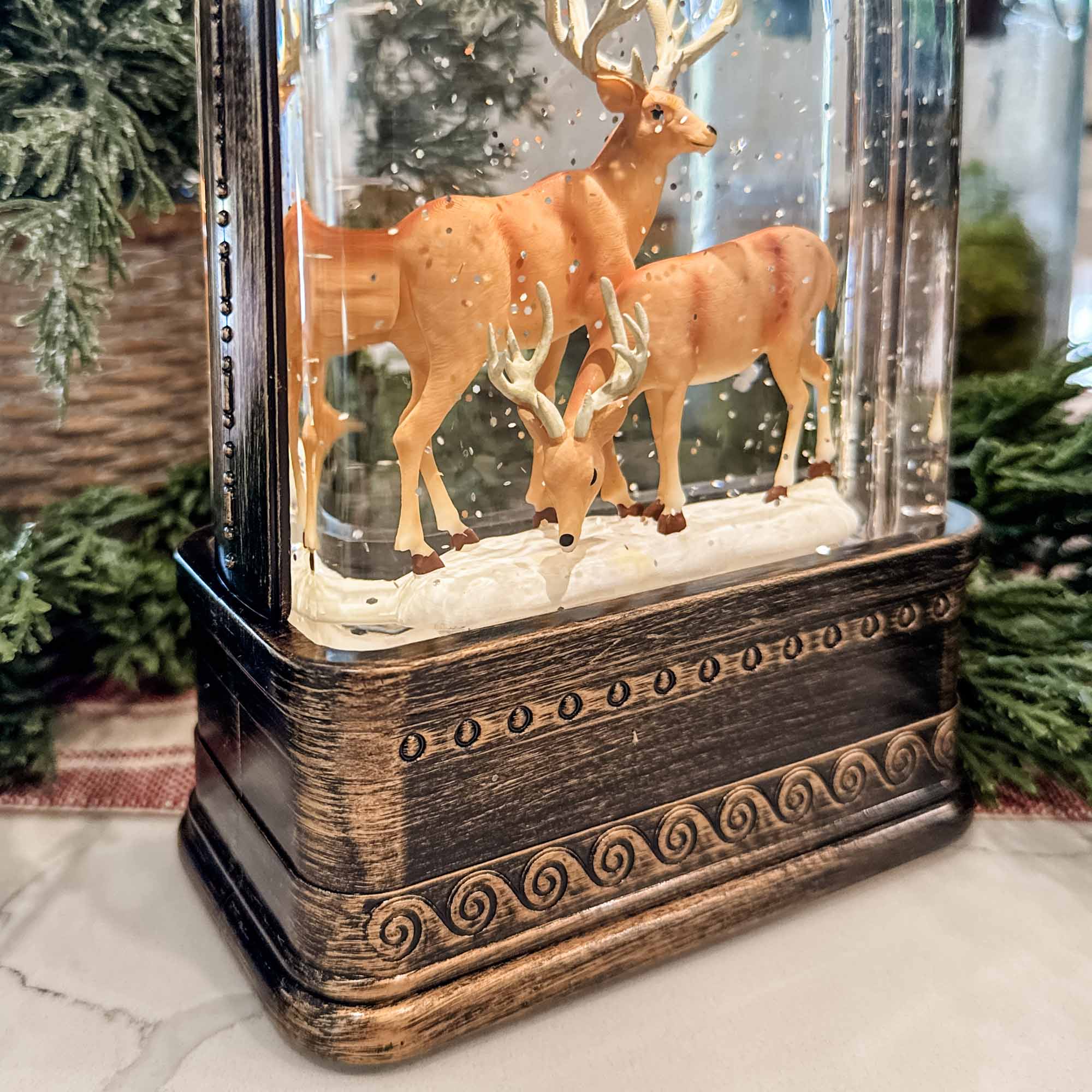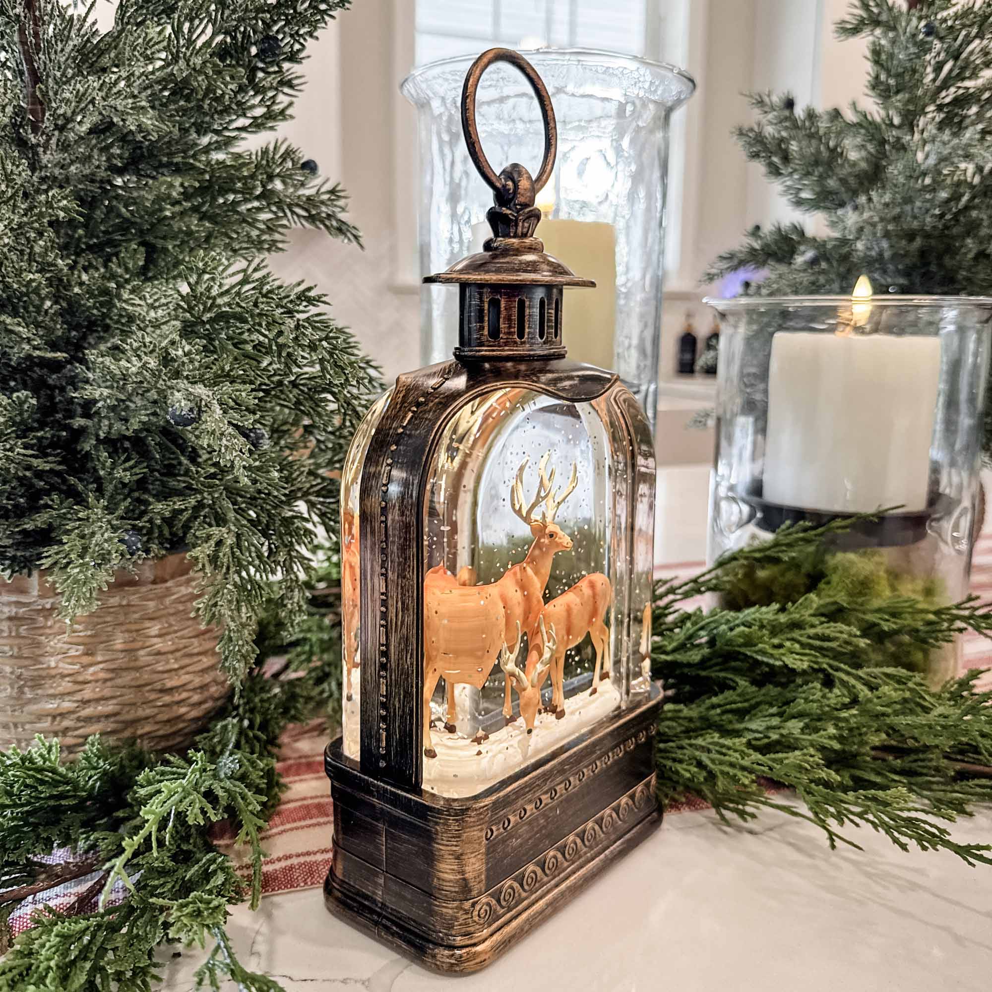 Capture the stillness and serenity of the season with the Quiet Winter LED Snow Globe, with a touch of storytelling and rustic charm. Housed in a vintage-style lantern with elegant bronze accents, this enchanting globe showcases a peaceful forest scene where a pair of rustic deer stands quietly beneath bare winter trees. Swirling glitter dances continuously through the air, mimicking a gentle snowfall, all softly illuminated by a warm LED glow that brings the entire scene to life.