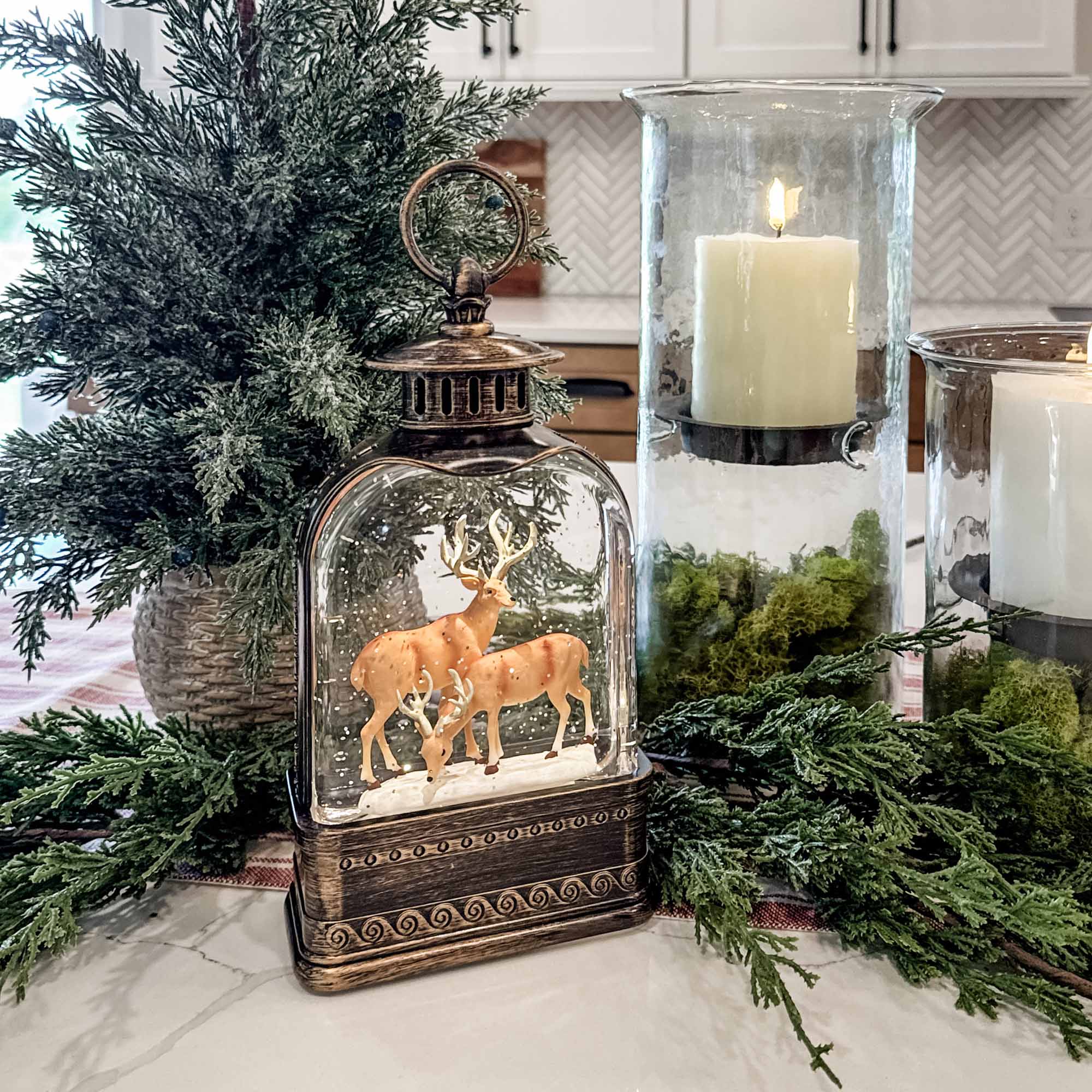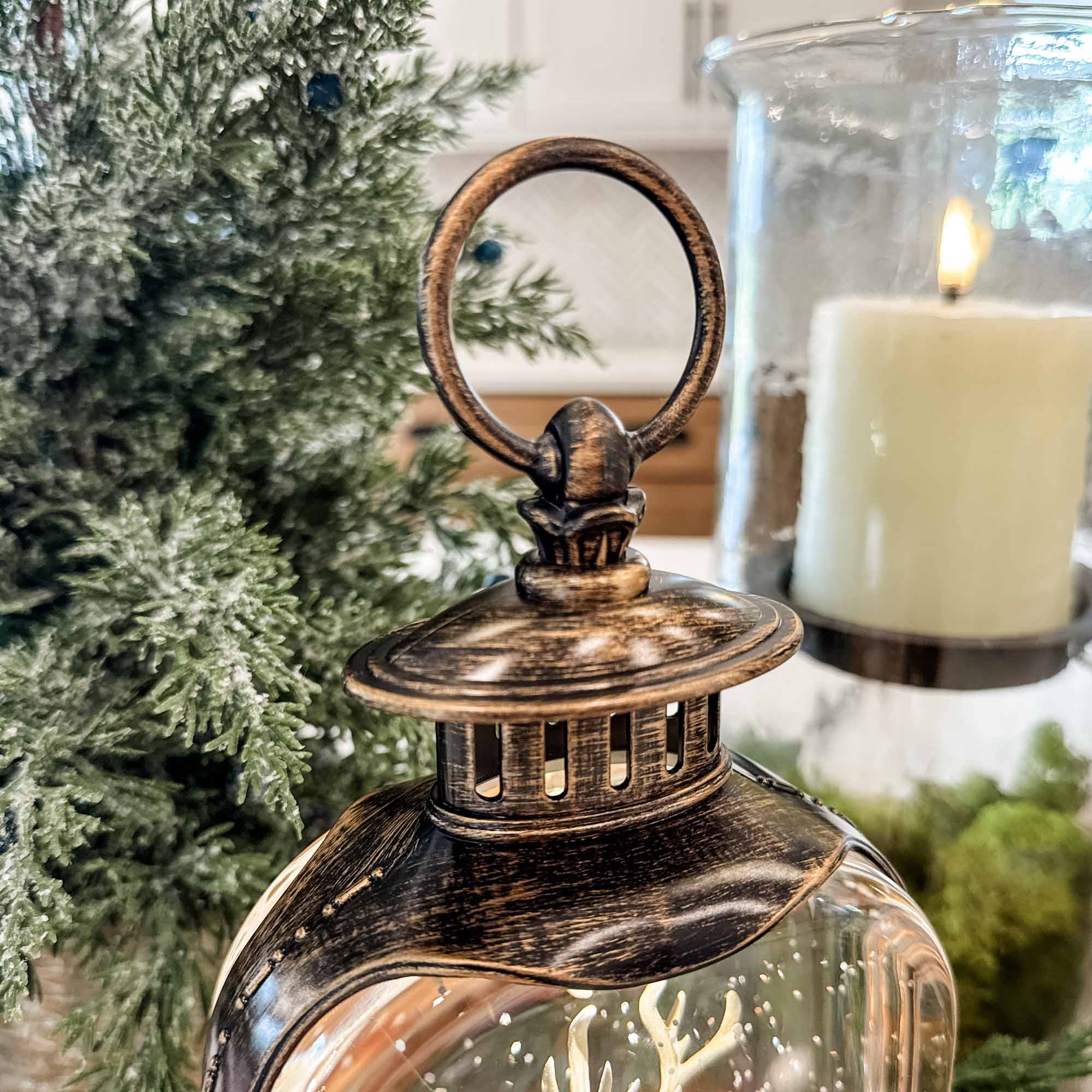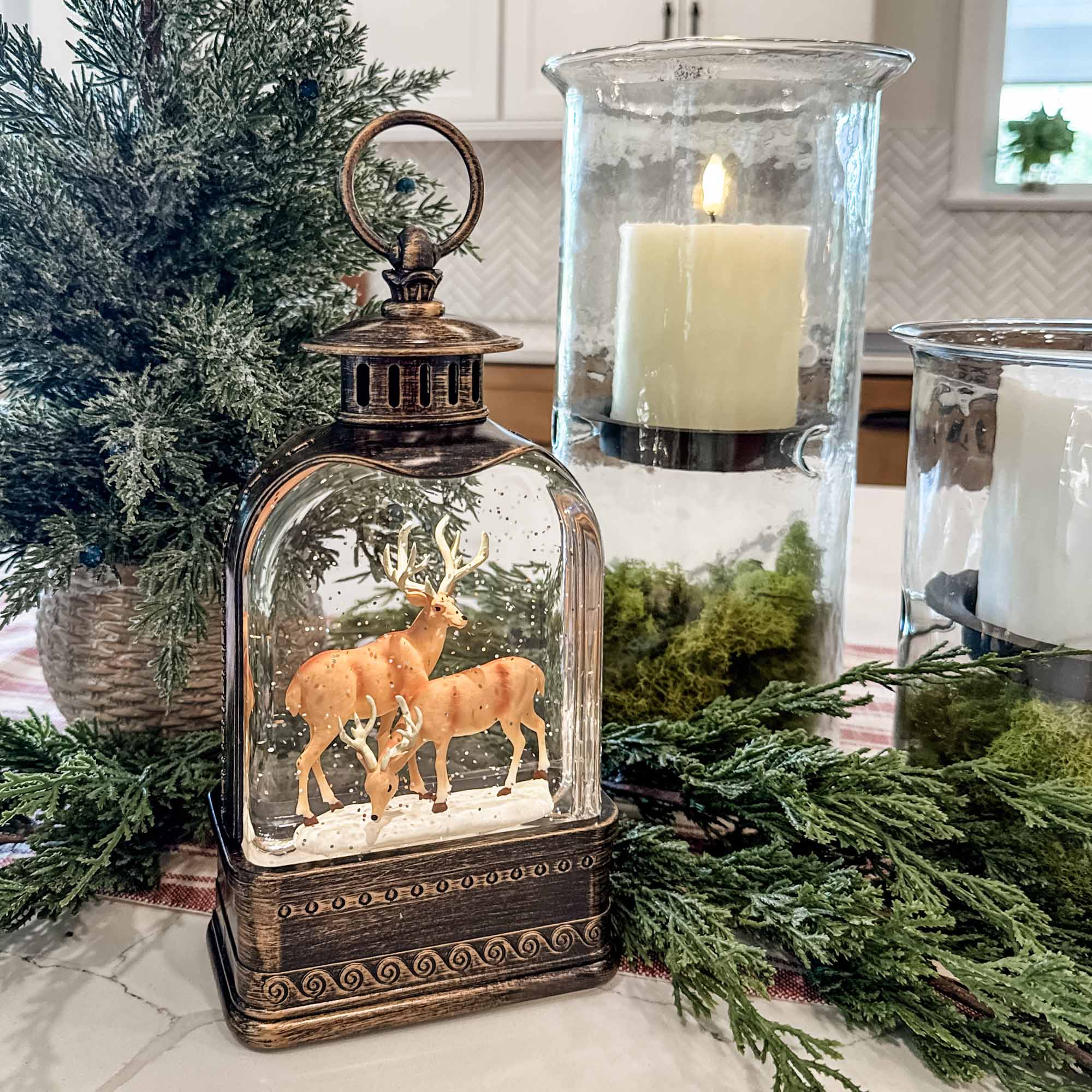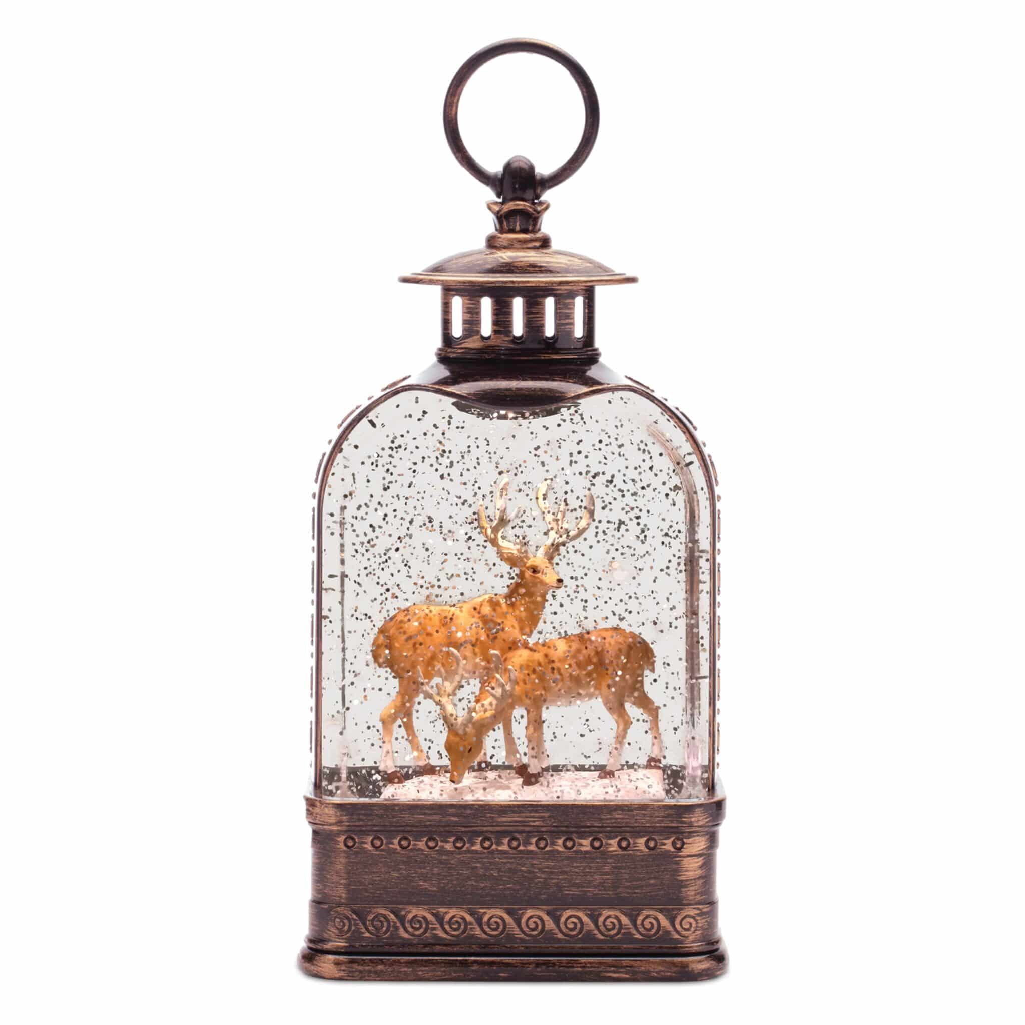 Capture the stillness and serenity of the season with the Quiet Winter LED Snow Globe, with a touch of storytelling and rustic charm. Housed in a vintage-style lantern with elegant bronze accents, this enchanting globe showcases a peaceful forest scene where a pair of rustic deer stands quietly beneath bare winter trees. Swirling glitter dances continuously through the air, mimicking a gentle snowfall, all softly illuminated by a warm LED glow that brings the entire scene to life.