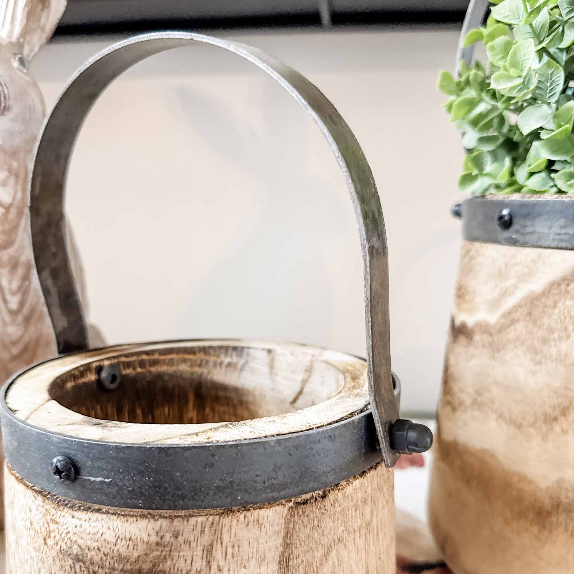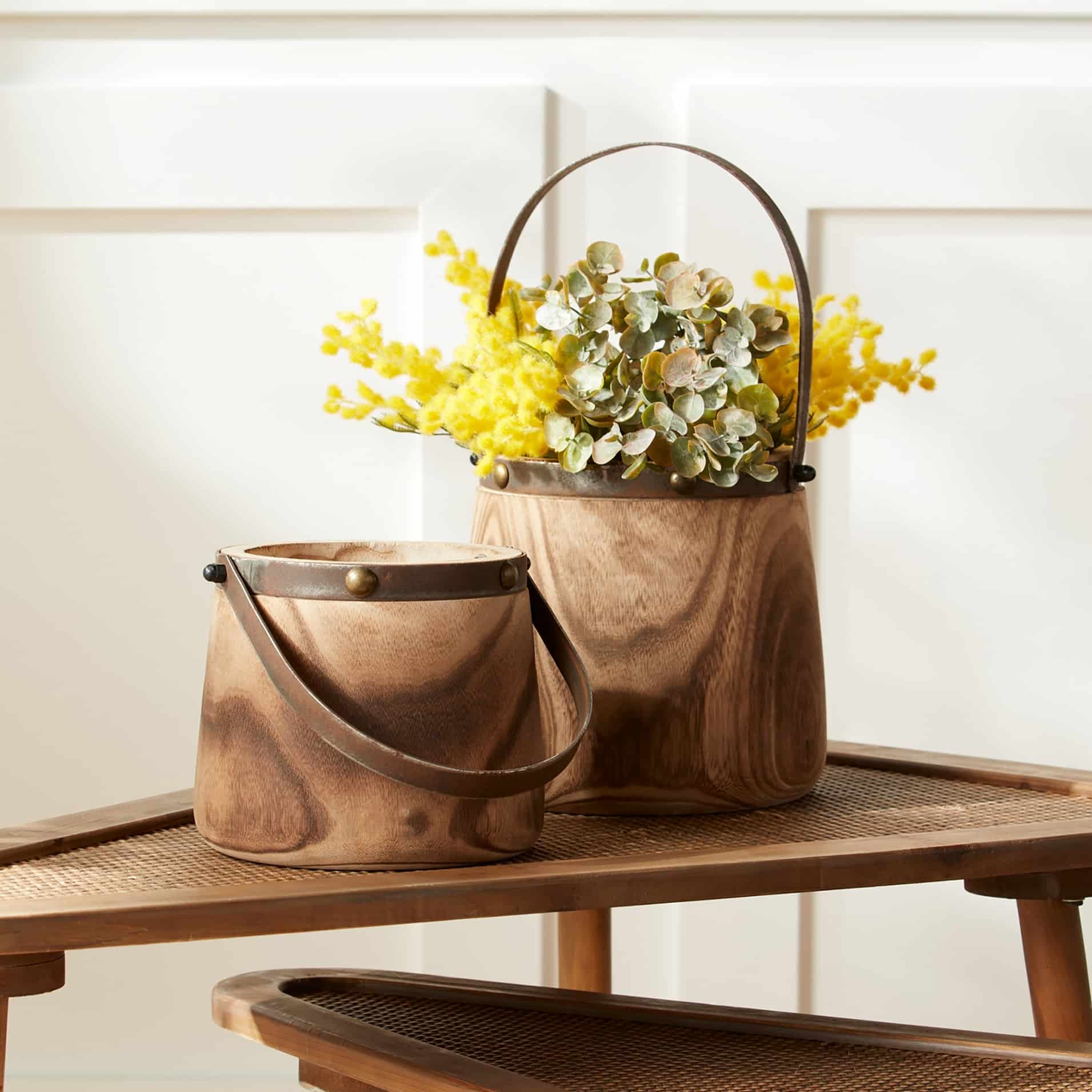 Bring farmhouse warmth to your space with the Rustic Charm Wooden Pail Planters. This set of two pails, crafted in assorted sizes, blends a natural wood finish with steel handles accented by bead details for a touch of vintage character. Perfect for covered porches, entryways, or cozy indoor corners, these versatile planters are ideal for showcasing your favorite greenery. Fill them with dried arrangements for a rustic look, or drop in a potted plant to add fresh, lively color to your home décor.