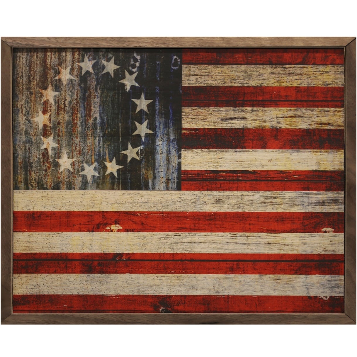 Add a rugged look and historic flair to your farmhouse decor with the Rustic Flag Wooden Sign. The accent captures the design of the Betsy Ross flag with thirteen white stars in a circle on a deep blue background, representing the thirteen colonies that fought in the Revolutionary War. Thirteen red and white stripes are also part of the design, as they were on the flag so many years ago. The deep tones of red, white and blue have a time-worn, distressed appearance, that offers deep, weathered color, enhancing every setting, in every season. The simple look and warm organic tones of the walnut frame compliment and enhance the rustic farmhouse style. Signs are made to order.
