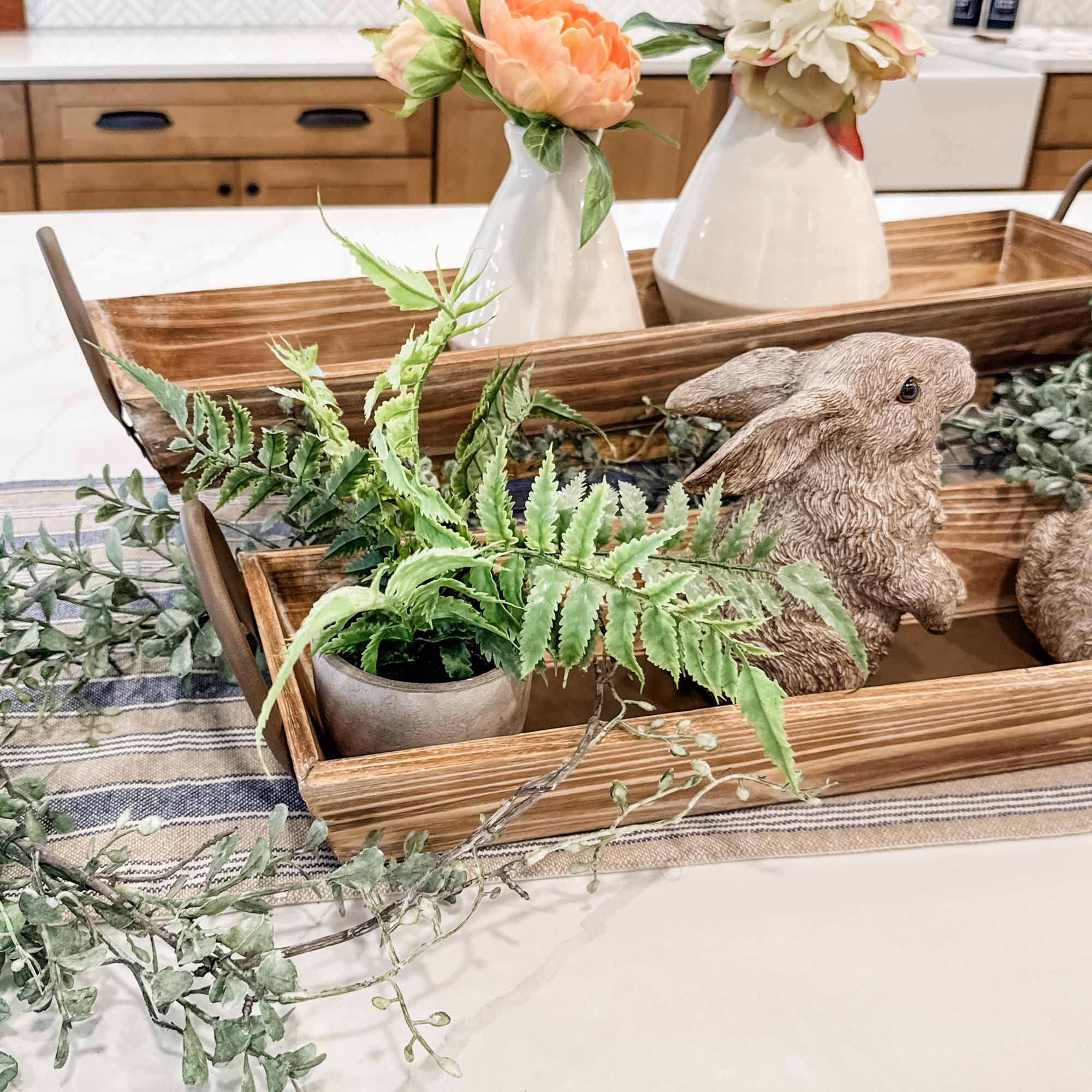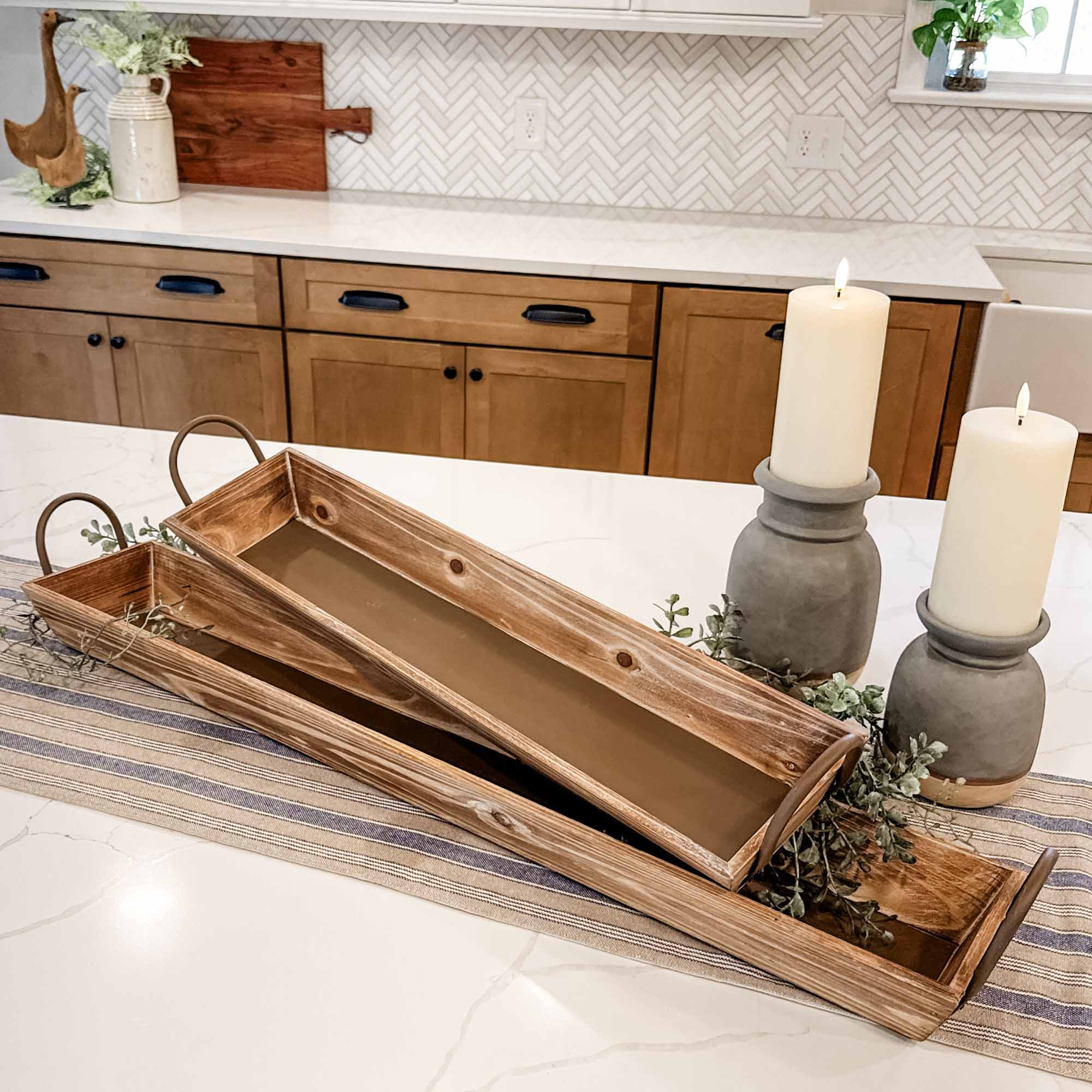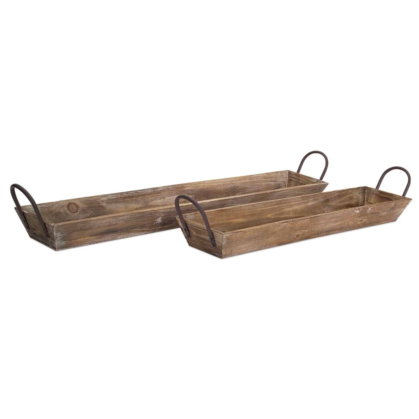 Add a touch of rustic elegance to your home with the Homestead Wooden Serving Trays. Crafted from natural wood and finished with classic metal handles, this set of two trays blends timeless charm with everyday functionality. The assorted sizes offer versatility for display or use—perfect for showcasing candles, seasonal centerpieces, or faux floral arrangements. Whether styled on a coffee table, dining buffet, or kitchen counter, these trays bring warmth and texture to any space while complementing a wide range of décor styles.