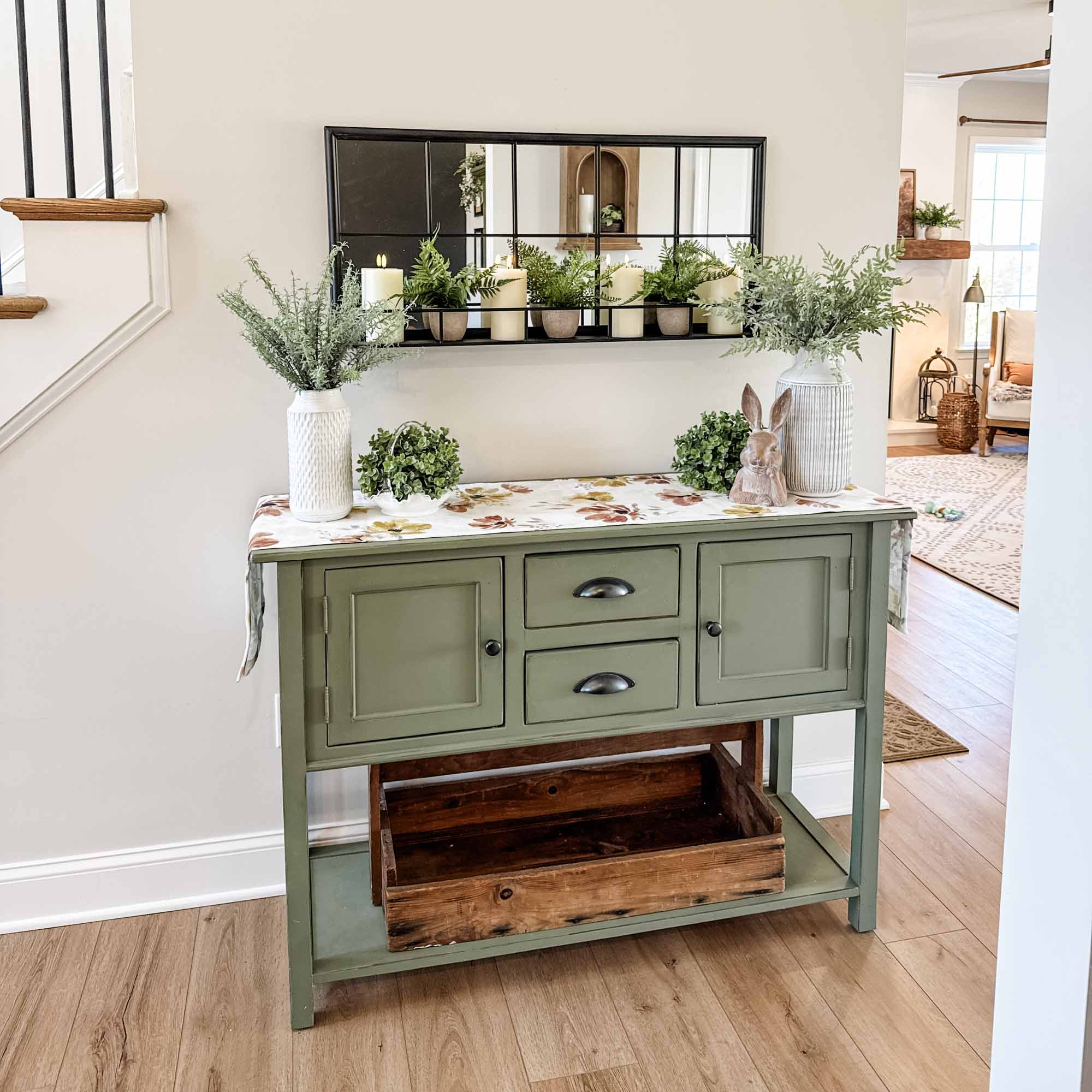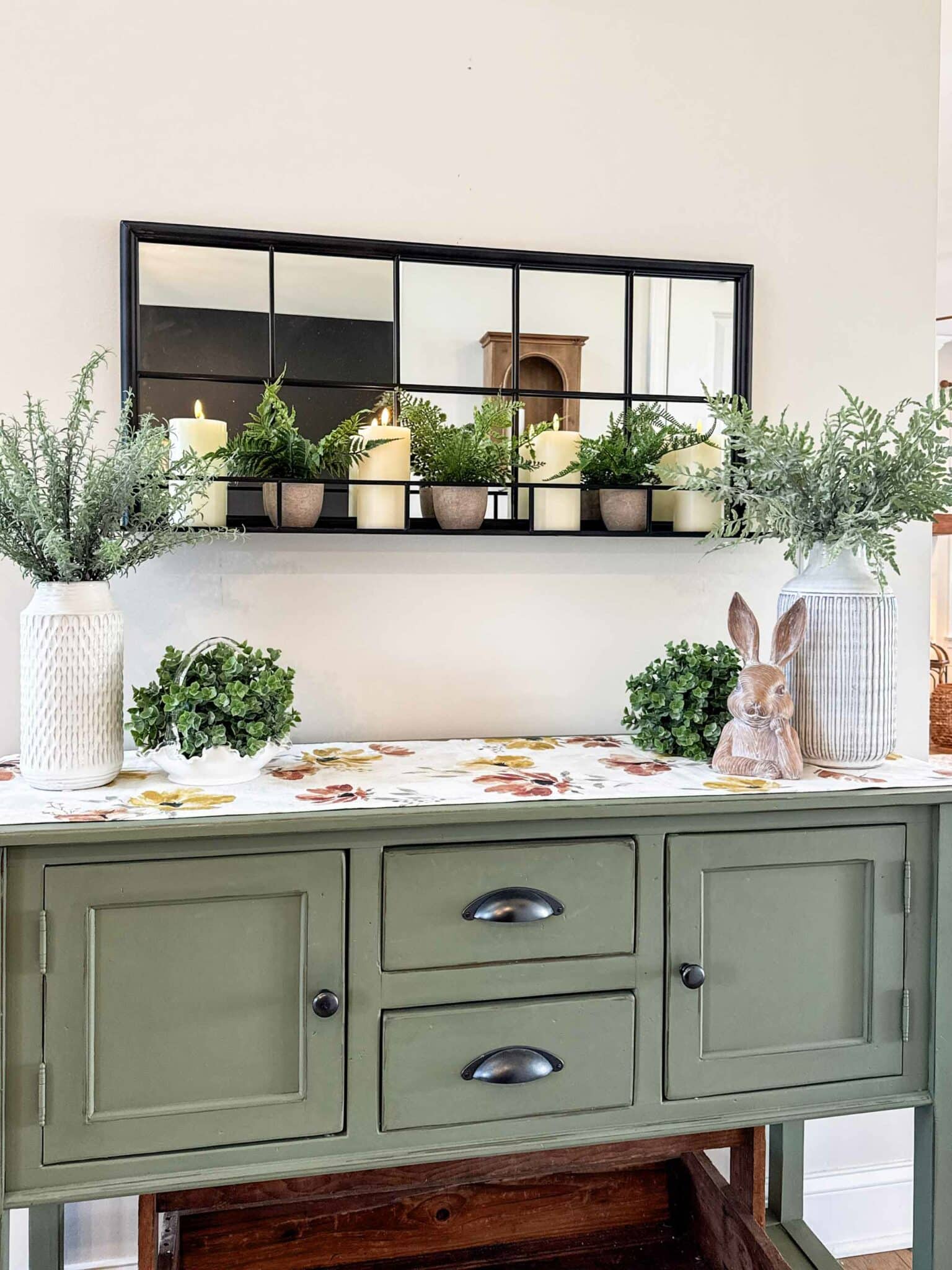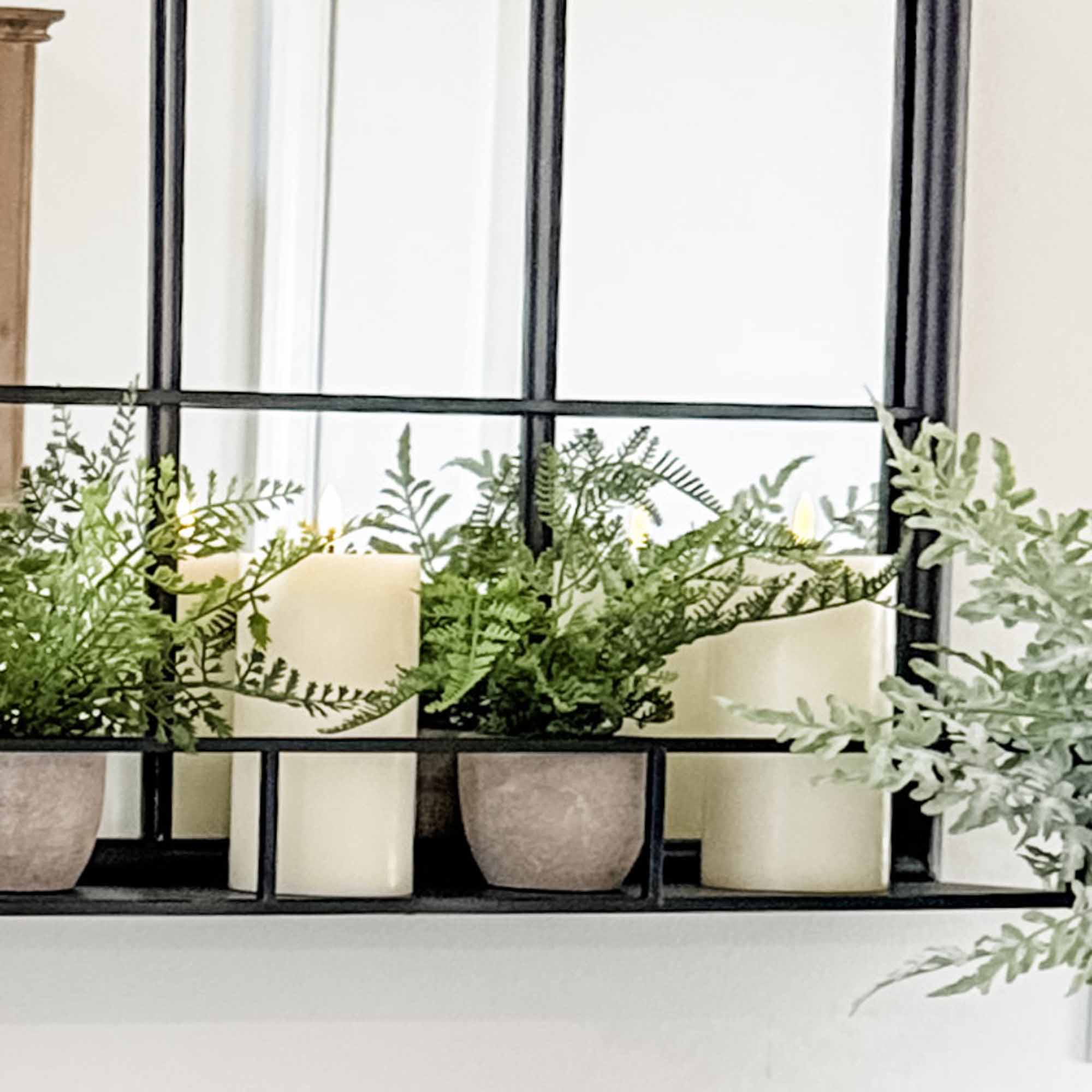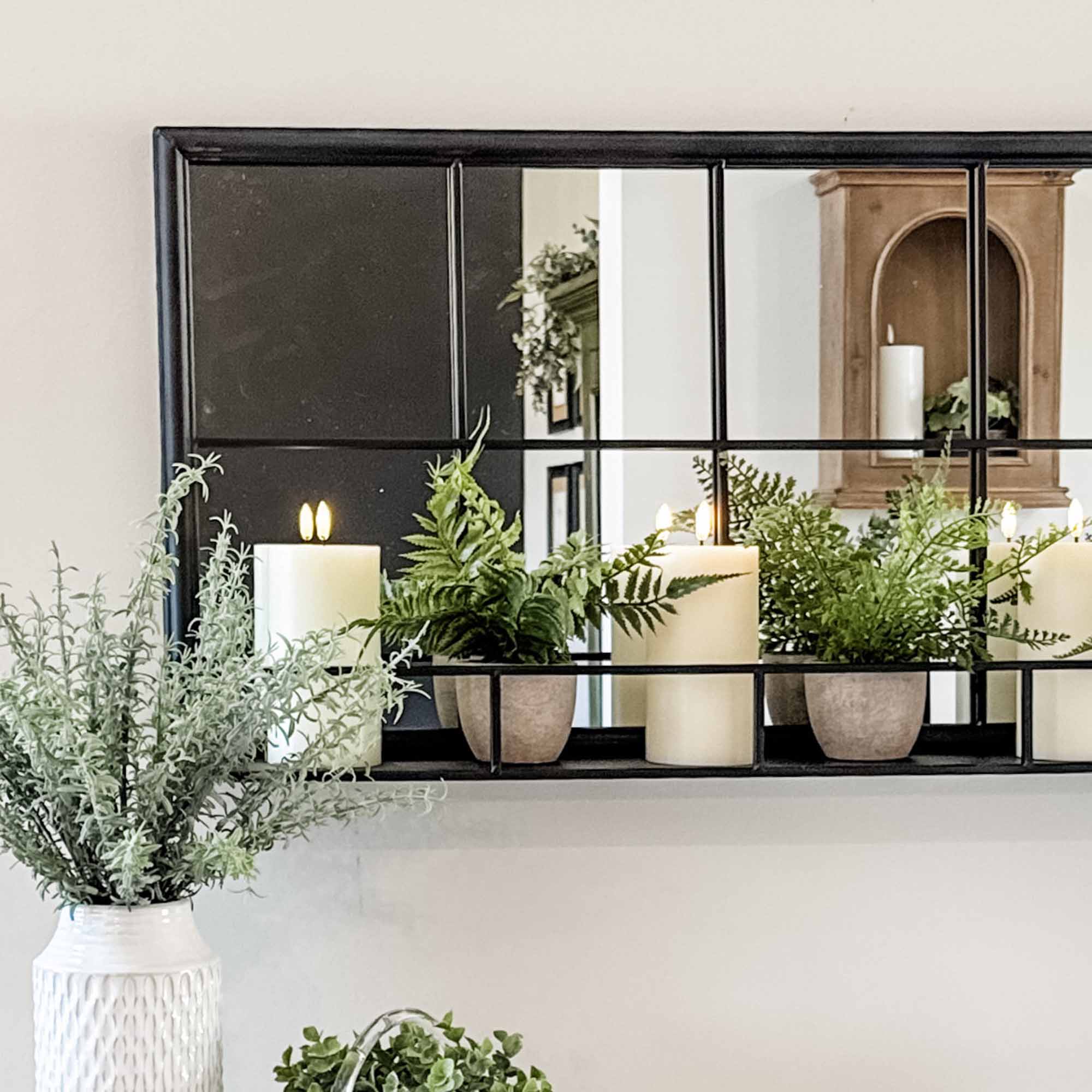 Elevate your home with the Rustic Reflections Mirror with Shelf, a stunning fusion of function and style. Designed with a classic black wooden frame and pane-style mirror, this piece brings an industrial-meets-modern charm to any space. The built-in black iron shelf adds not just visual interest but also a practical spot to display decorative accents, candles, or faux potted plants.