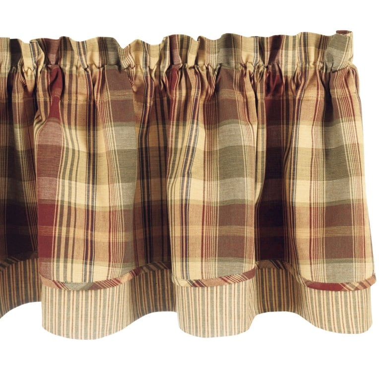 Elevate your window styling with the Saffron Lined Layered Valance by Park Designs. Designed with a homespun plaid top layer in rich barn red, sage, and navy tones over a beige ground, this valance is trimmed with a coordinating tan underlayer for added depth and dimension. Fully lined for structure and light control, it brings a finished, polished look to any space. Ideal for pairing with matching panels or displaying alone for a classic farmhouse touch.