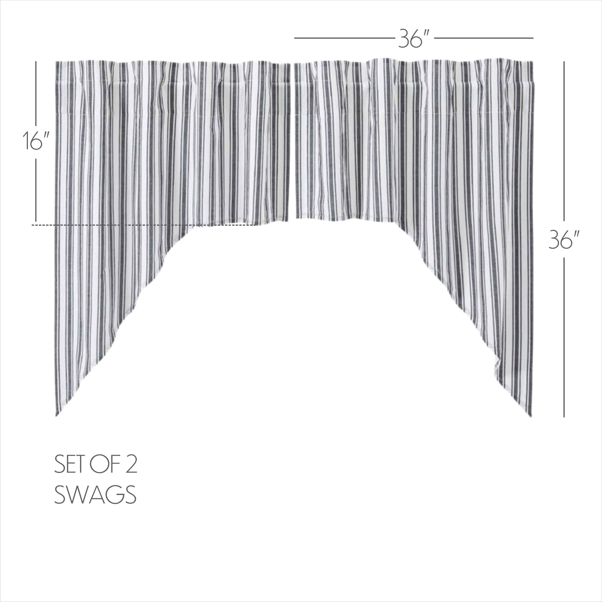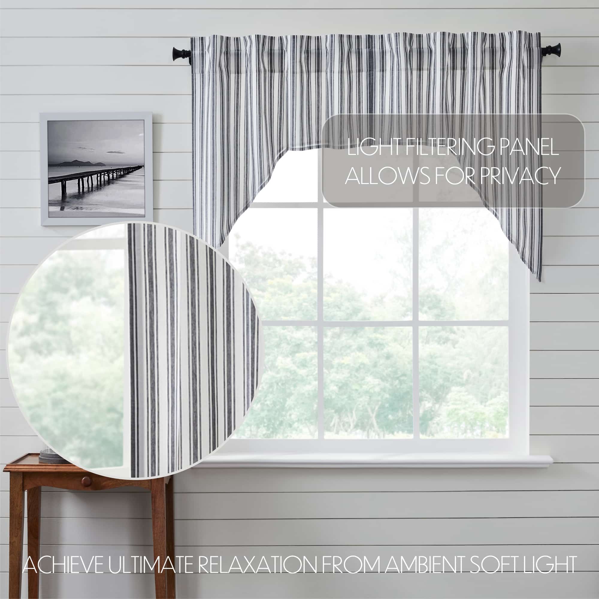 The Sawyer Mill Black Ticking Stripe Swag Set adds a charming farmhouse style to your home. Swag curtains are a classic country style featuring angled drapes to frame your window while leaving space open for additional natural light. Our curtains feature a soft white base and country black striping for a modern farmhouse feel. Includes a rod pocket and loops for easy hanging, offering two hanging options.
