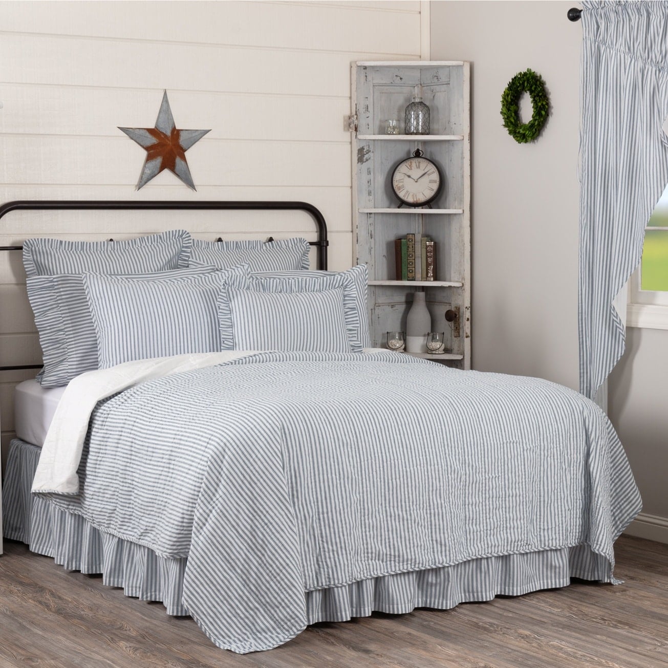 Inspired by the honest comfort of farmhouse living, the Sawyer Mill Blue Ticking Stripe Quilt Coverlet blends simple design with enduring quality. Soft denim blue and crisp cotton white stripes bring a classic ticking pattern to life, offering the familiar charm of well-loved fabrics made for everyday comfort. Lightweight and breathable, this 100% cotton coverlet is designed for year-round use, pairing beautifully with cottage, vintage, or modern farmhouse décor. The 90×90 queen size is finished with a solid white backing for a versatile, reversible look that feels fresh and timeless. Layer it with other pieces from the Sawyer Mill Blue Collection to create a space that feels welcoming, relaxed, and truly at home.