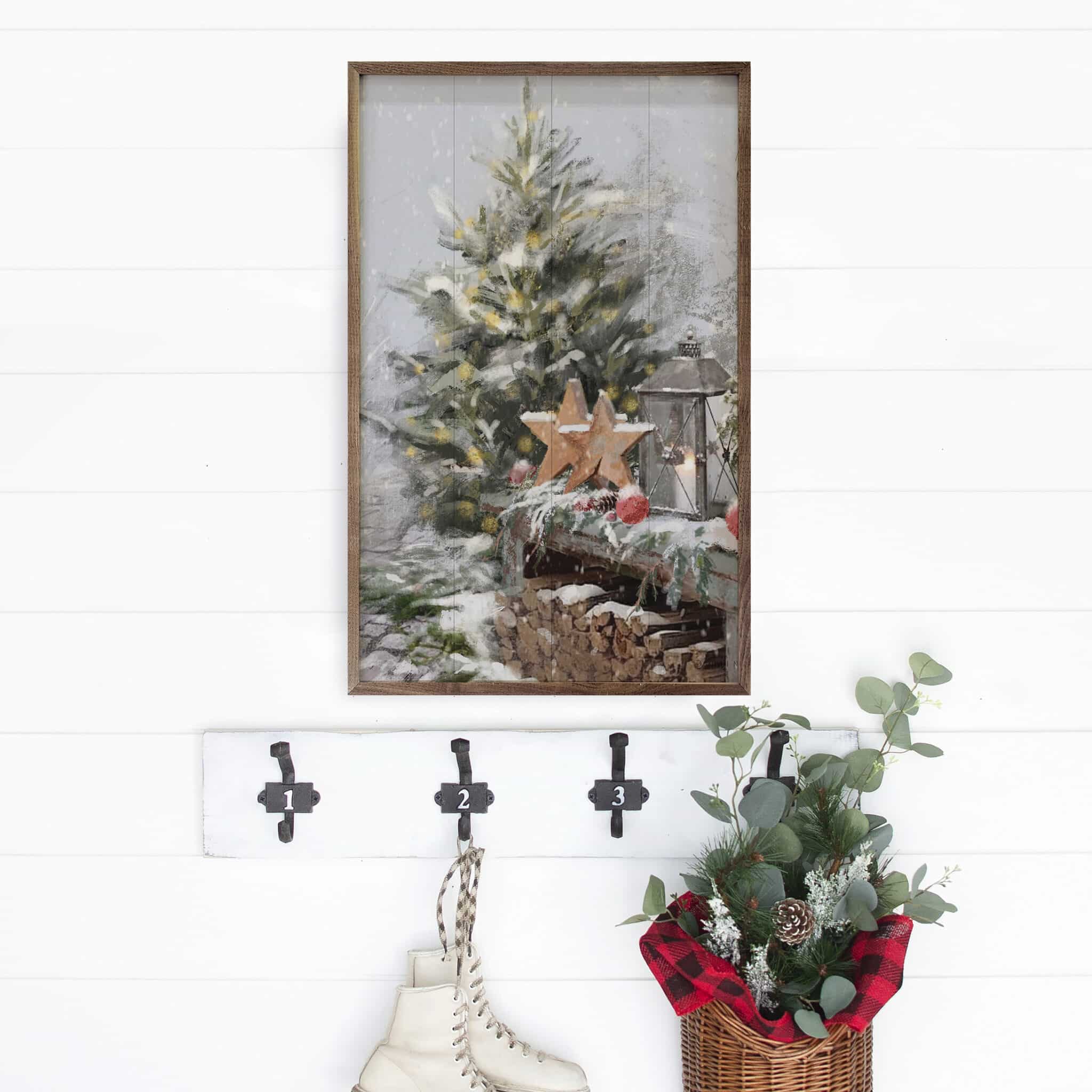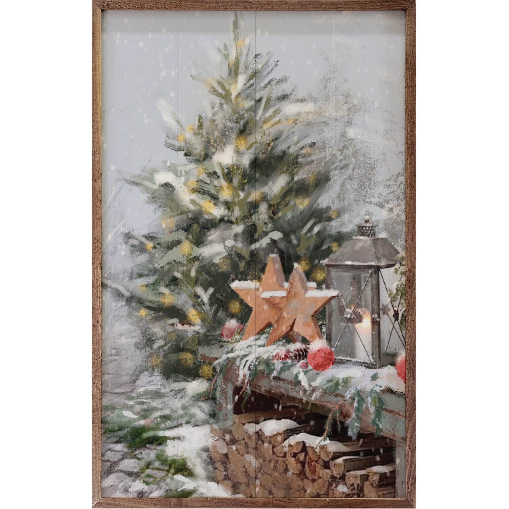 The Seasons IX Stars Wooden Sign brings a cozy, wintry scene to life with its depiction of a snow-covered Christmas tree and festive decor. Set against a peaceful snowfall, the soft glow of lantern light, rustic wooden stars, and bright red ornaments create a warm and inviting atmosphere, perfect for the holiday season. This artwork by Danhui Nai is beautifully detailed, evoking a sense of seasonal magic and charm. The wooden backdrop enhances its rustic, farmhouse appeal, making it an ideal piece to add to your festive home decor this winter. A natural walnut frame finishes the look in an understated, casual way. Signs are made to order.