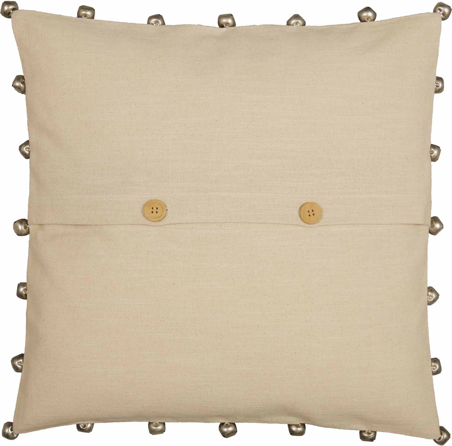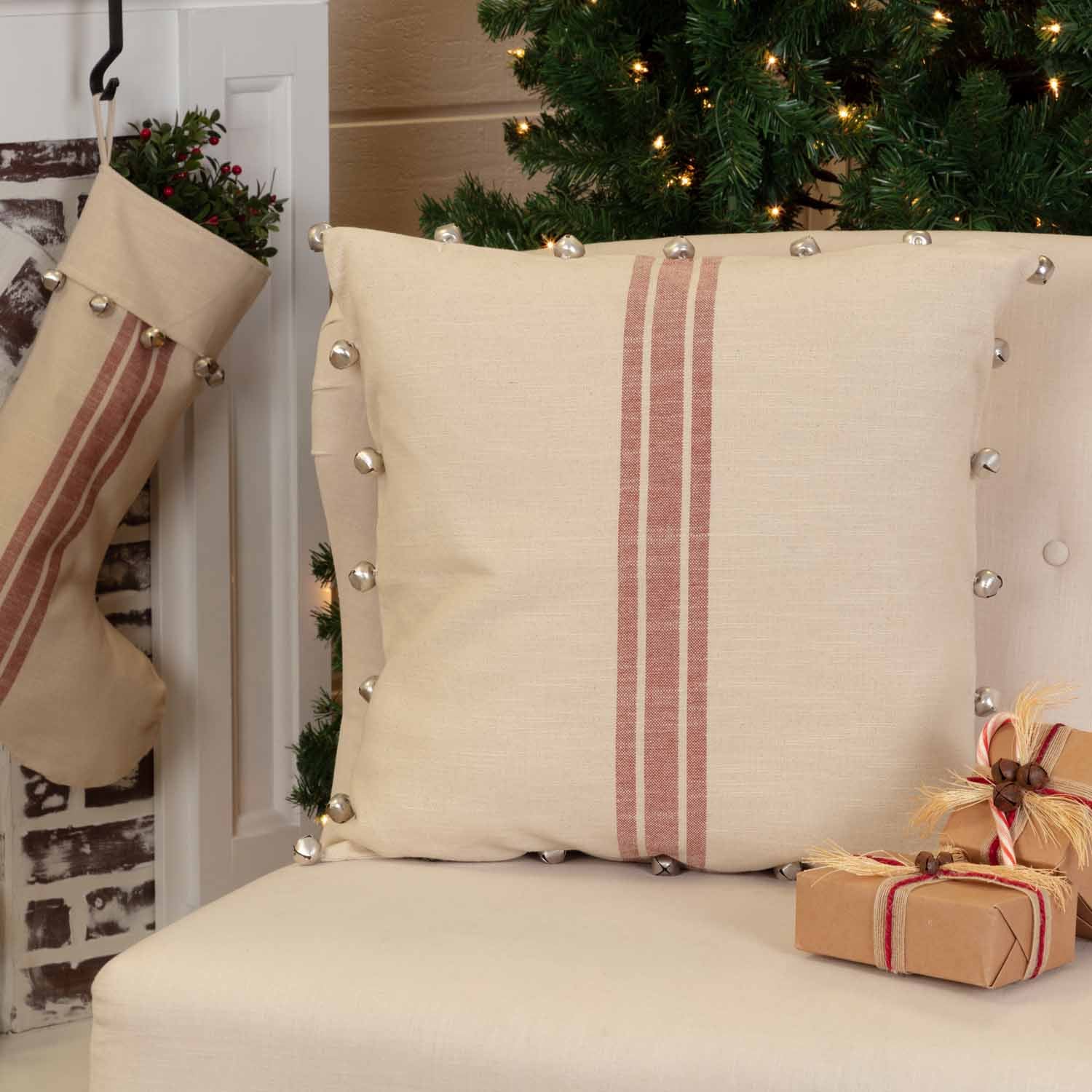 We just LOVE the Sleigh Bells Ring Collection and know that you will too! The pillow cover combines grain sack fabric with a set of woven stripes, and this look has proven to be one of our most popular and timeless farmhouse styles. Grain sack fabric offers substantial weight with a rustic texture and surprisingly soft hand feel, and the muted brick red stripes offer the perfect contrast against the warm creamy tones of the fabric. Twenty-four jingle bells wrap all around the edge of the cover, bringing cool, metal texture to the accent and music to your ears! The cover reverses to solid cream fabric with two natural wooden buttons (one extra button sewn inside), which keep the insert securely in place. (Pillow insert sold separately.)