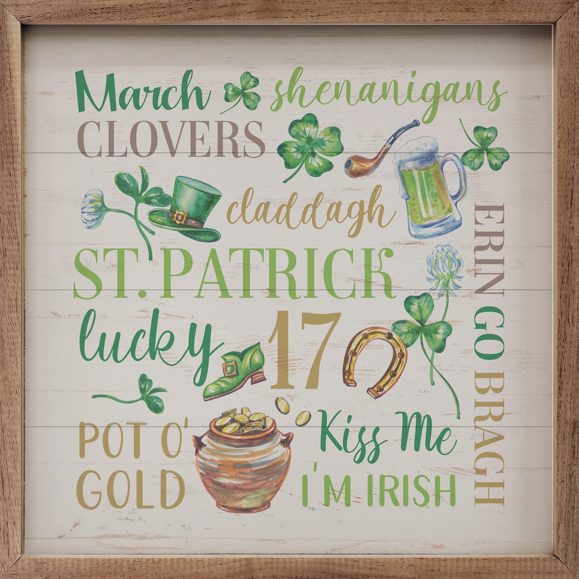 The St. Patrick Words Wooden Sign is a darling accent for your home this St. Patrick’s Day, featuring a few classic symbols for this very Irish holiday! Shamrocks, a pot of gold, a Leprechaun’s hat, and other iconic designs dance across the accent, adding a playful, contemporary touch to a wall, door, shelf or work space. Traditional greens in various hues bring a bright and cheery interest and the clever placement of the words and objects completes the design with a decidedly modern appeal. A natural wooden frame adds a layer of warmth that brings a complimentary finishing look.