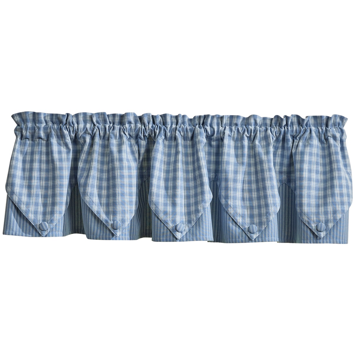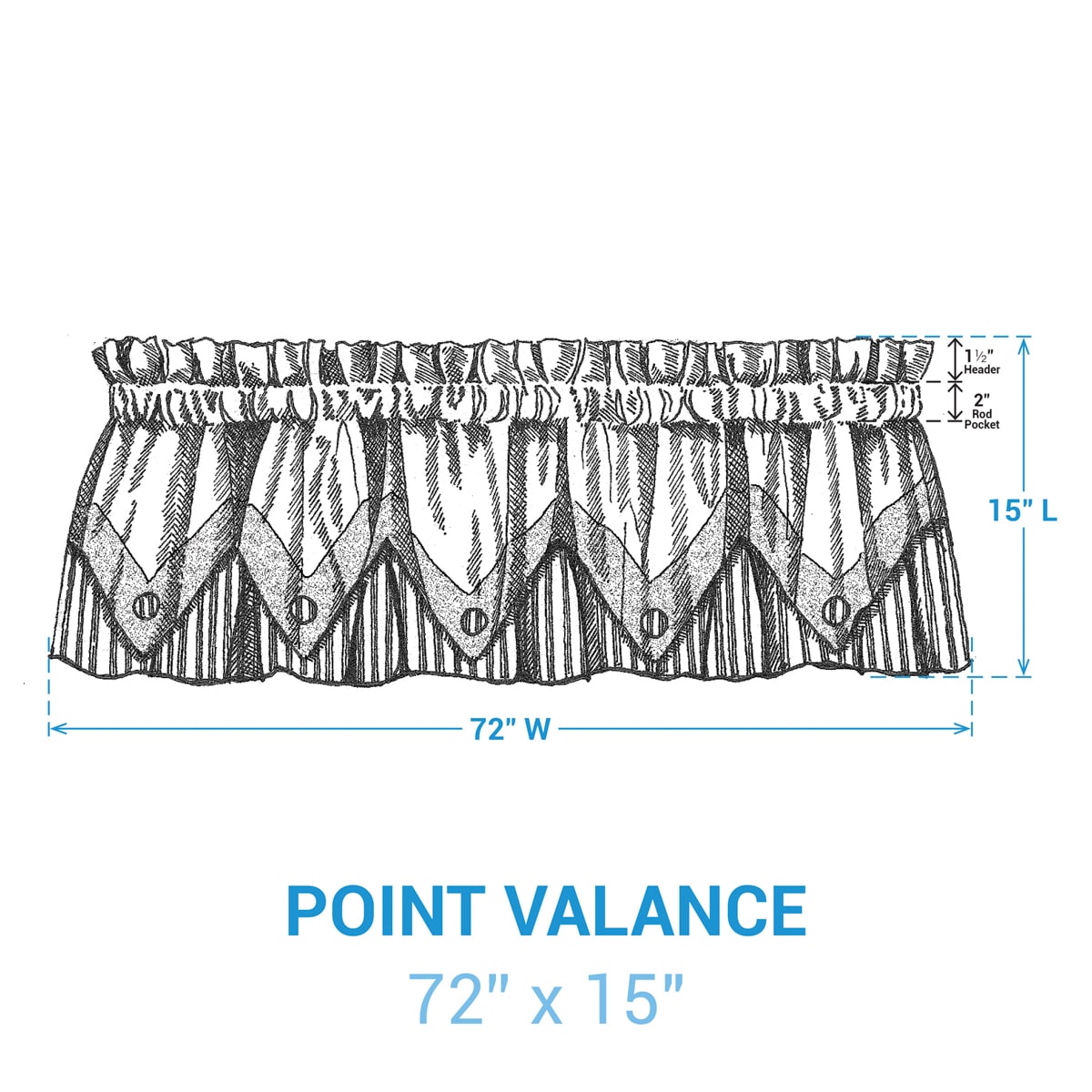 The pointed hem, accented with decorative buttons, adds a handcrafted touch, making it a perfect fit for kitchens, breakfast nooks, or cozy living spaces. While filtering natural light, it also brings warmth and character to your décor, creating an inviting atmosphere. Whether styled alone or layered over curtains, this charming valance is the perfect finishing touch for any farmhouse or cottage-inspired space.