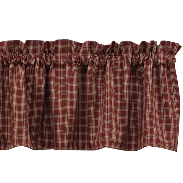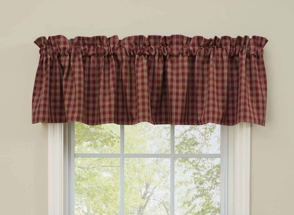 Add a timeless layer of country charm to your windows with the Sturbridge Wine Valance. Featuring a rich plaid of deep wine red and warm tan, this valance instantly brings warmth and a welcoming touch to any room. Perfect on its own for smaller windows or paired with coordinating tiers or panels for a full treatment, it complements farmhouse, rustic, and traditional decor with ease. The tailored design and 100% cotton fabric give it a soft, natural drape that frames your window in classic comfort.