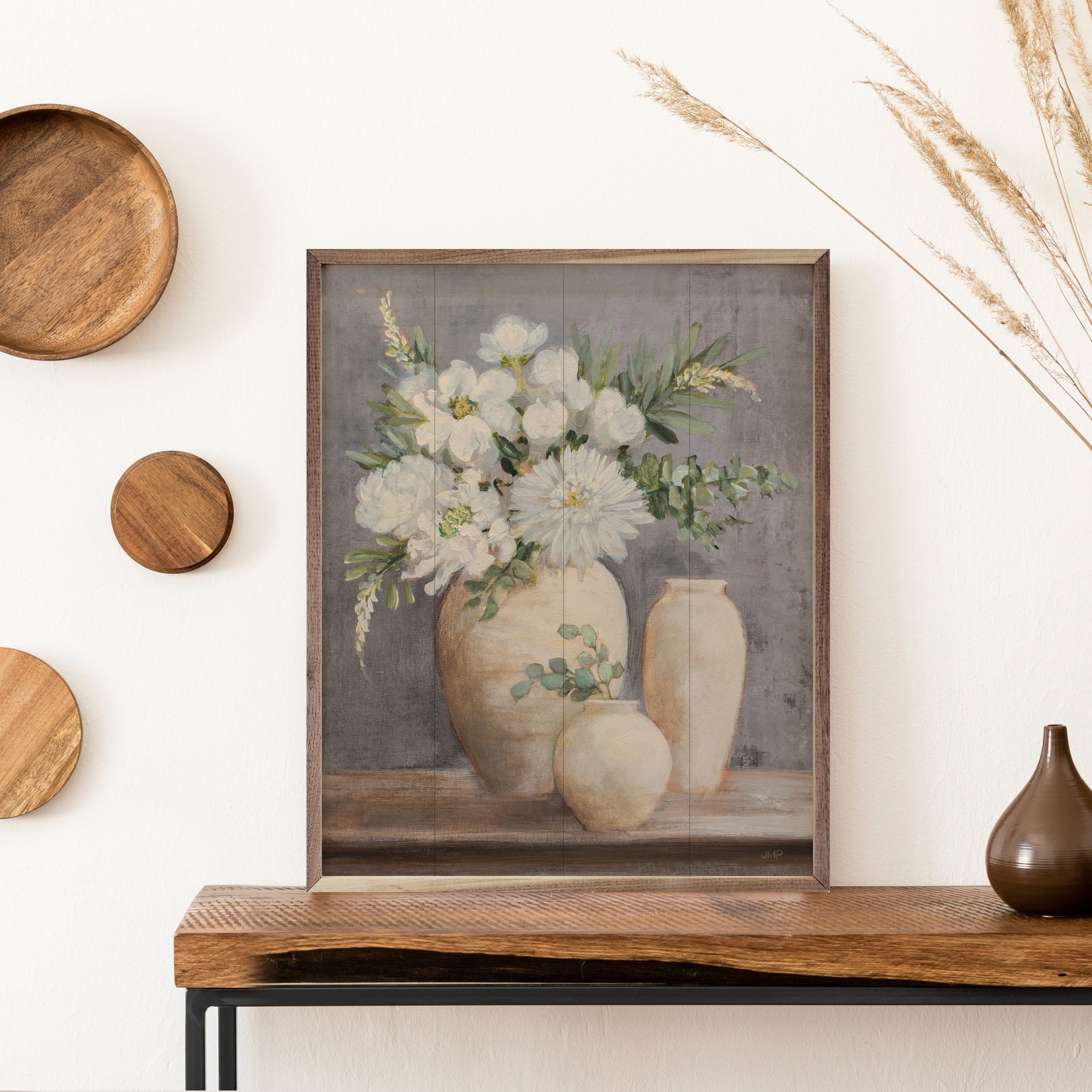 The Subtle and Scented Light Gray Wooden Sign offers a gorgeous image with lush, bold blooms, beautifully contrasting tonal elements and lovely placement and proportions. The painting brings in subtle tones that offer depth and interest to your wall or tabletop but do not compete with other design elements within your home. The gracefully-placed, beautifully-arranged bold bouquet with accenting sprigs of greenery, create an eye-catching focal point that captures your attention first, then allowing your gaze to circle around to the rest of the image. The overall warmth and charm of the painting offer a delightful natural elegance and subtle sophistication to your cottage or farmhouse this season. A simple walnut frame adds a complimentary touch and another layer of warmth that compliments and enhances the floral image.