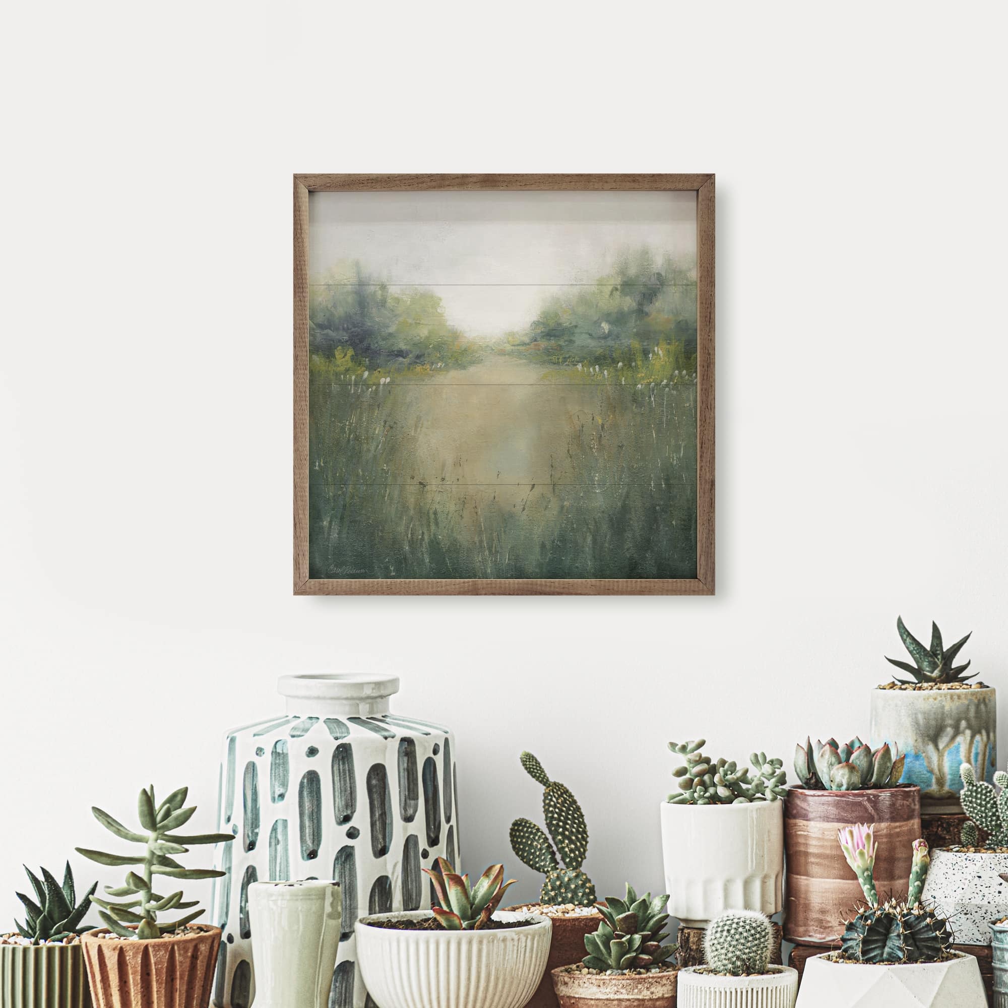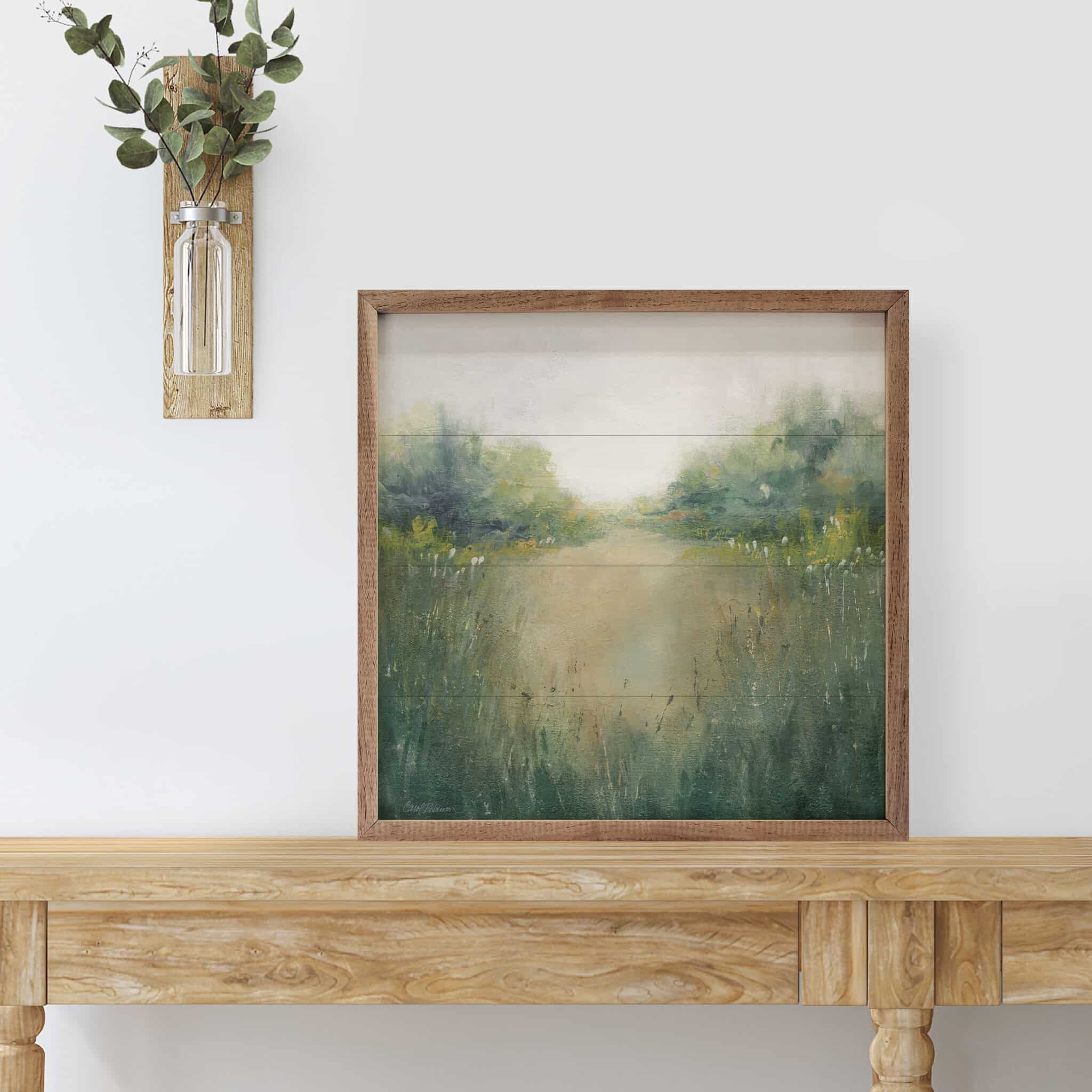 A delightful wall accent, featuring a unique perspective that draws you from the foreground all the way through as the sun rises highlighting various points in this beautiful painting by Carol Robinson. Wonderful, rich natural tones add depth and an interesting perspective to your country farmhouse or cozy cottage decor this season with charm and simple elegance. The simple walnut frame compliments the earthy tones of this unique painting, adding a natural, warm element that enhances the overall image.