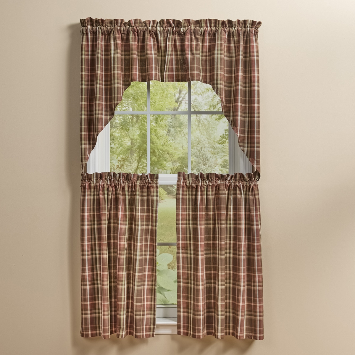 Woven from 100% cotton, the fabric features the Sussex collection’s signature plaid pattern in a lively mix of warm chestnut brown, soft cream, rosy blush pink, and sunshine yellow. The combination of earthy and cheerful tones makes these swags versatile enough for kitchens, living spaces, or dining areas, pairing beautifully with wood, painted, or neutral interiors.