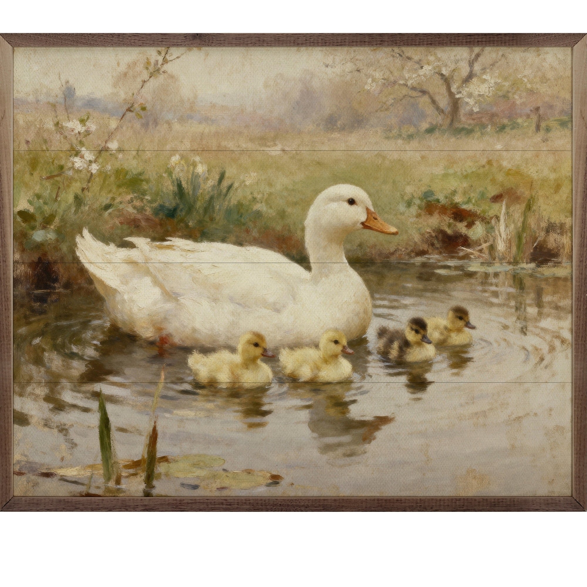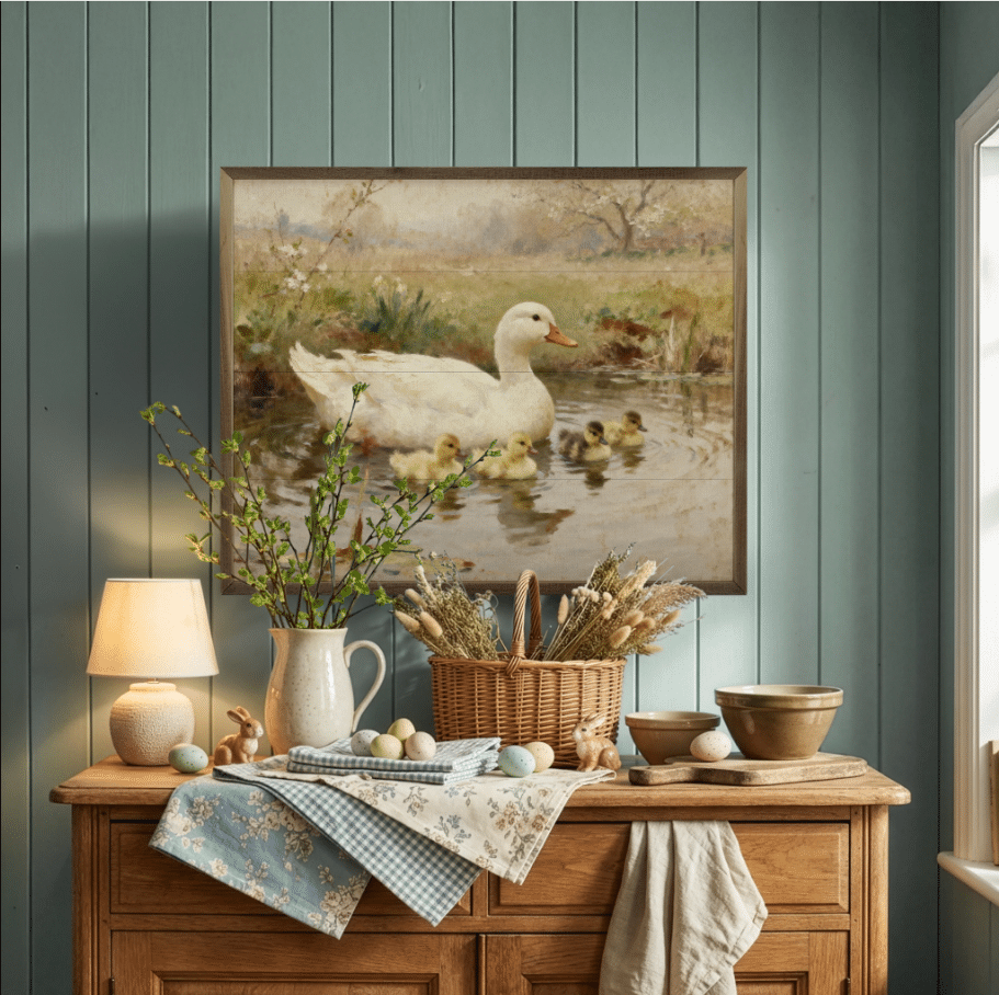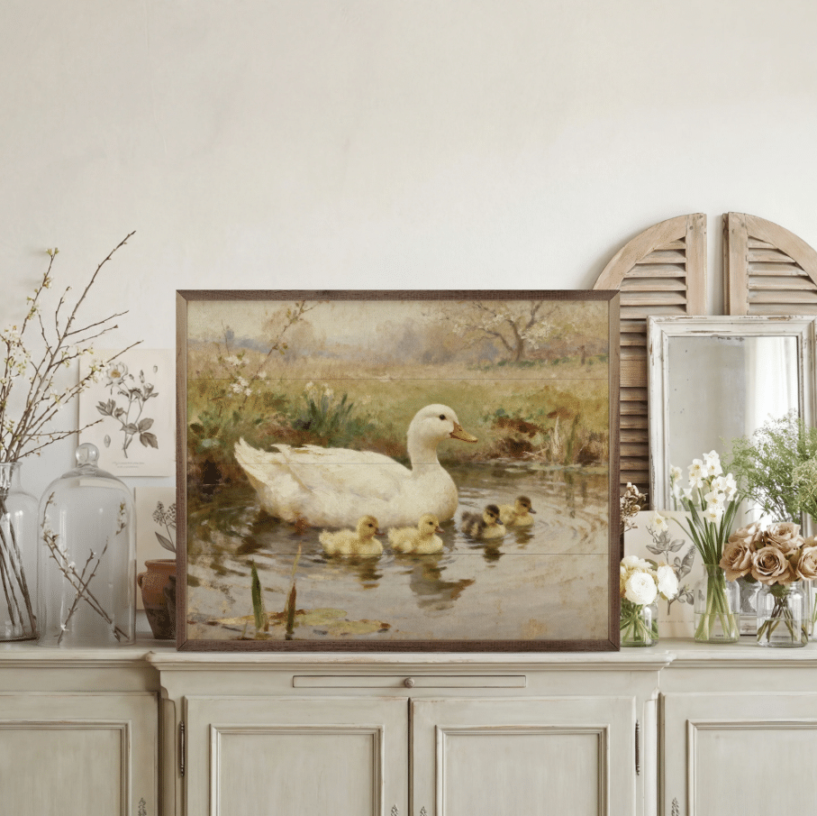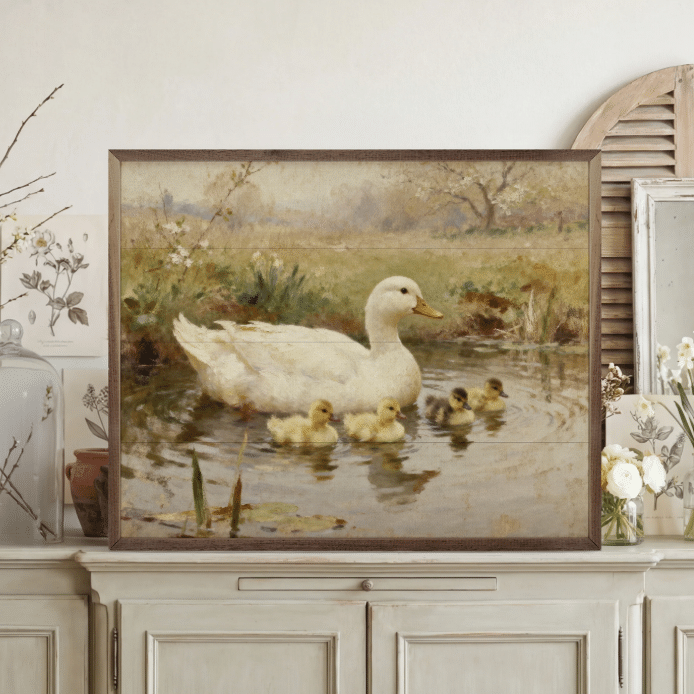 The Swimming Ducklings Wooden Sign brings a sense of peaceful countryside charm into your home. Featuring a soft, painterly illustration of a mother duck gliding through calm waters with her ducklings close behind, this artwork captures a timeless pastoral moment. The muted earth tones and gentle brushstroke style create a warm, vintage-inspired look that blends beautifully with farmhouse, cottage, and rustic décor. Printed on wood and framed for a finished appearance, this sign adds texture and depth to your walls while evoking the quiet beauty of nature. Perfect for kitchens, entryways, living rooms, or spring-themed décor, it offers a comforting and nostalgic accent for any space. Each sign is made-to-order.