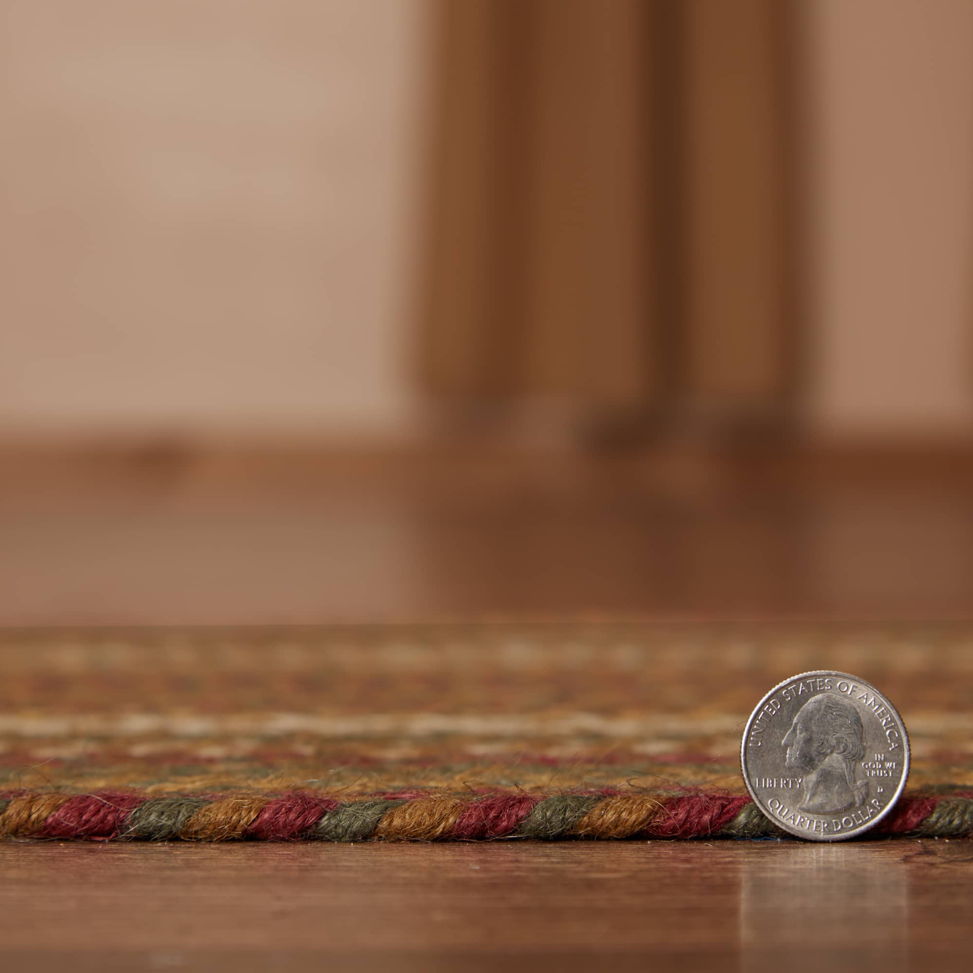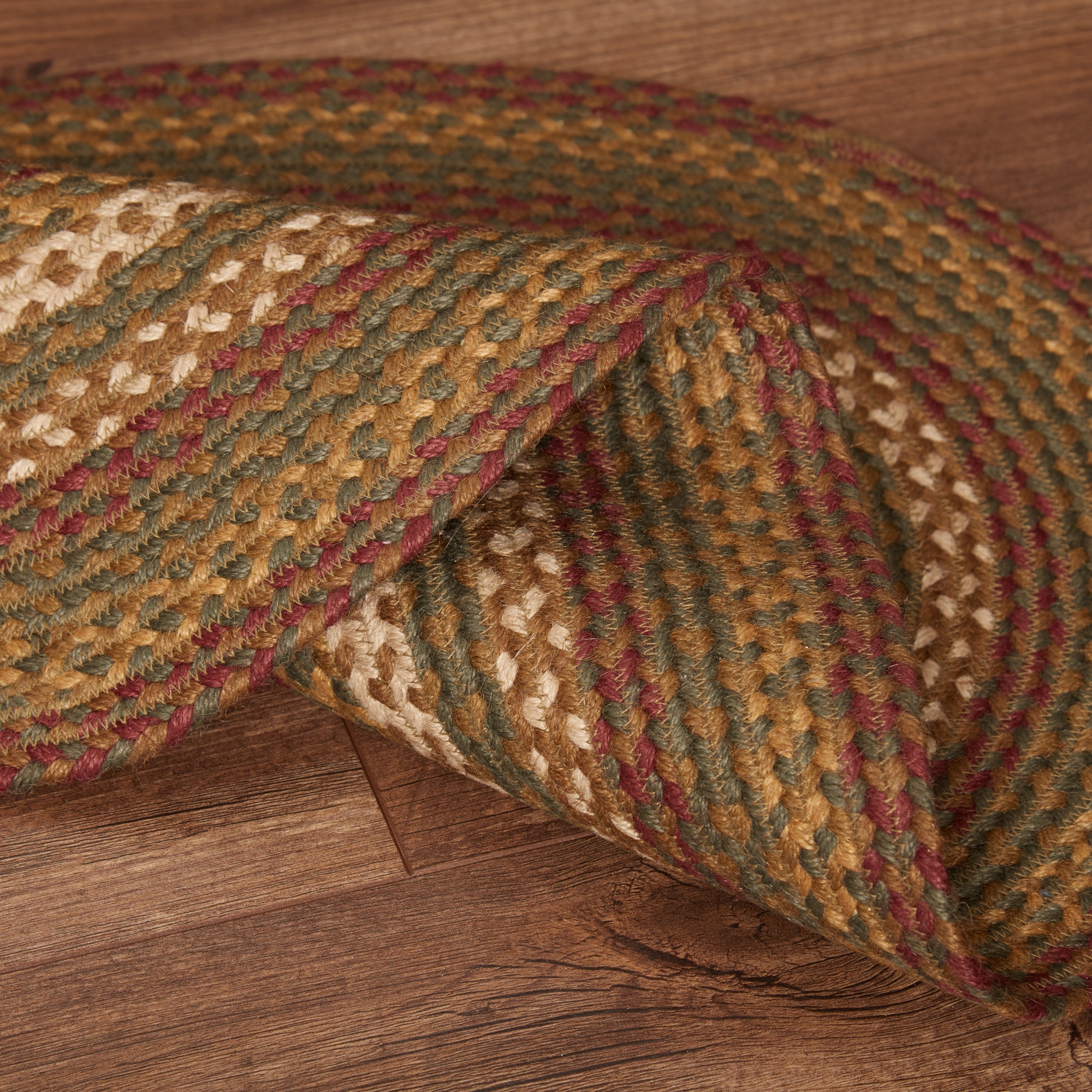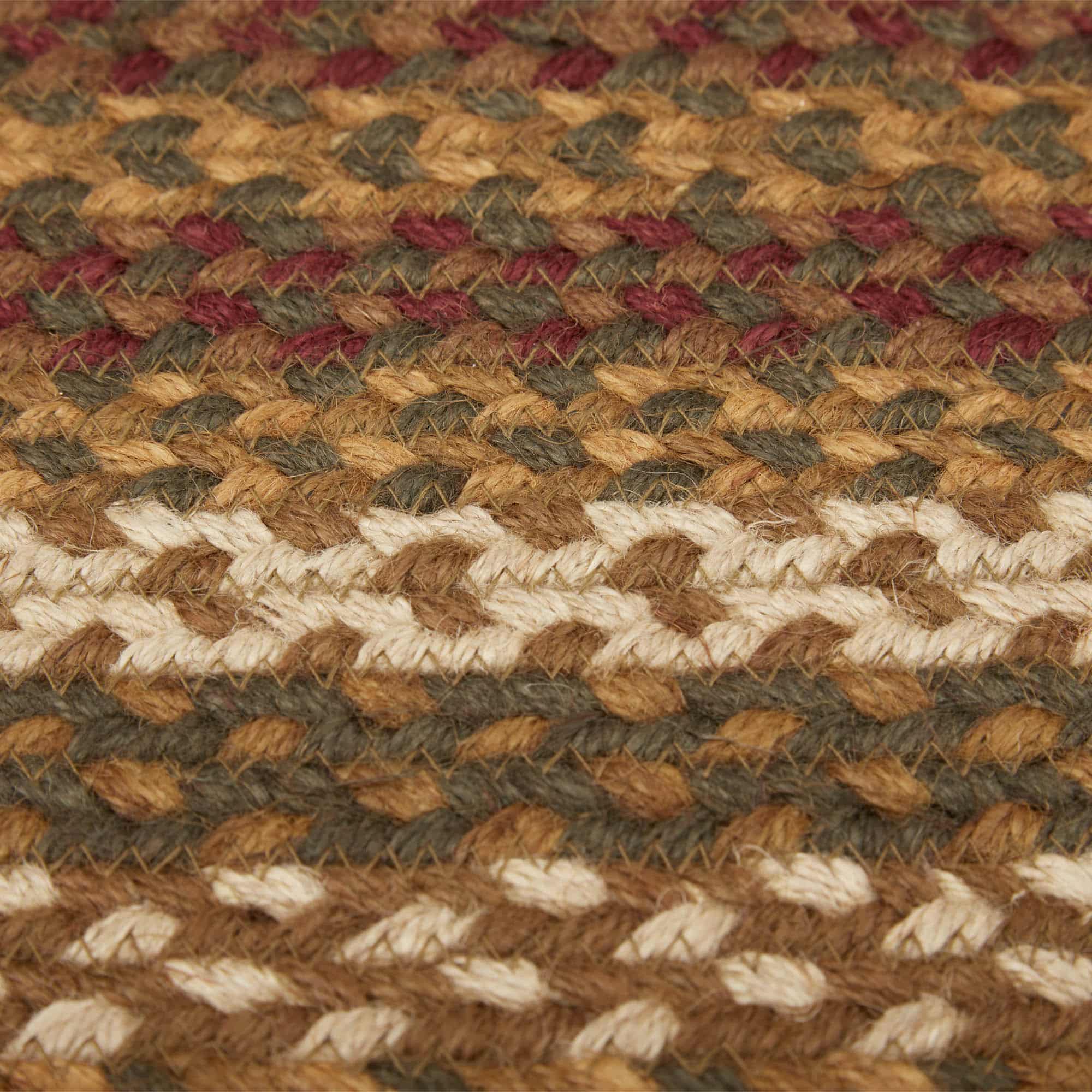 Tea Cabin Jute Rugs are a mix of burgundy, moss green, gold, yellow and light cream. Featuring concentric, mixed braids of moss green, crimson, and creme for a classic rustic, country look. This rug will be the perfect accent for your primitive country home. We will be happy to send you a sample of this pattern for a minimum charge to assist you in your selection.