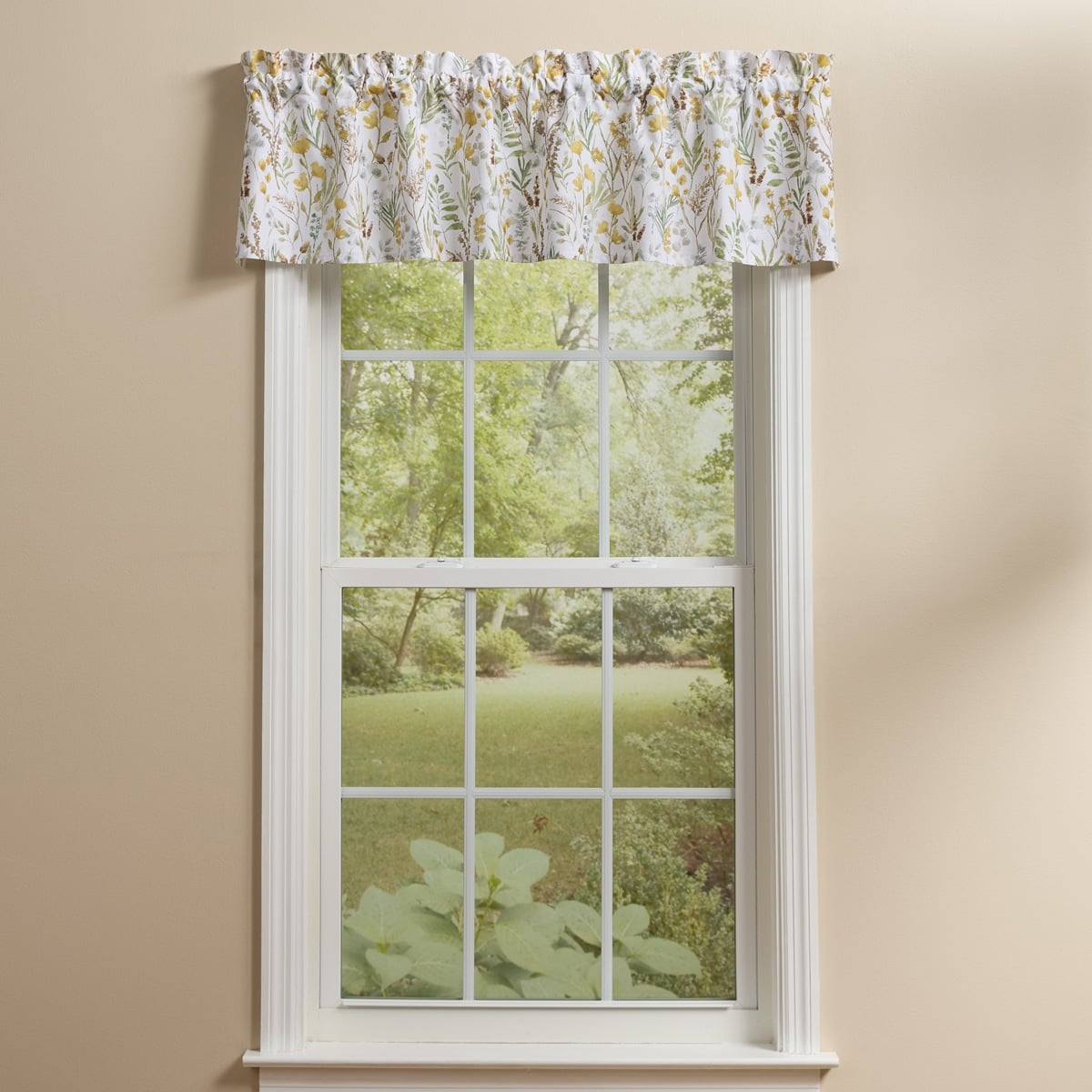 Brighten your windows with the soft, airy charm of the Tessa Valance. Set against a crisp white background, the pattern features a delicate watercolor-style print of golden yellow blooms, leafy green fronds, and touches of warm brown foliage. The design feels fresh and light, with a nature-inspired palette that works beautifully in kitchens, sunrooms, or any space that could use a gentle pop of color. Finished with a gathered rod pocket for an easy, casual drape, this valance brings a welcoming touch to your home year-round.