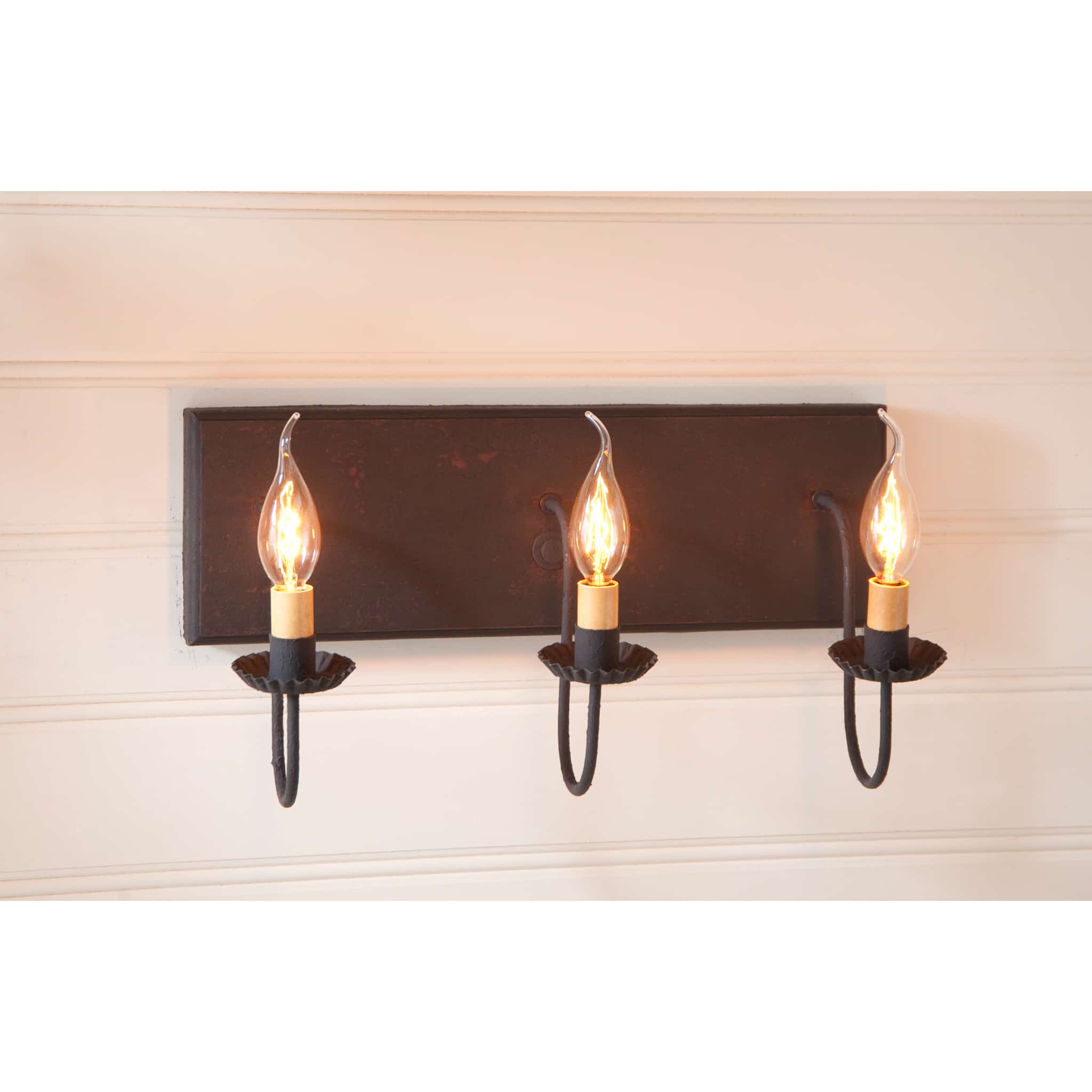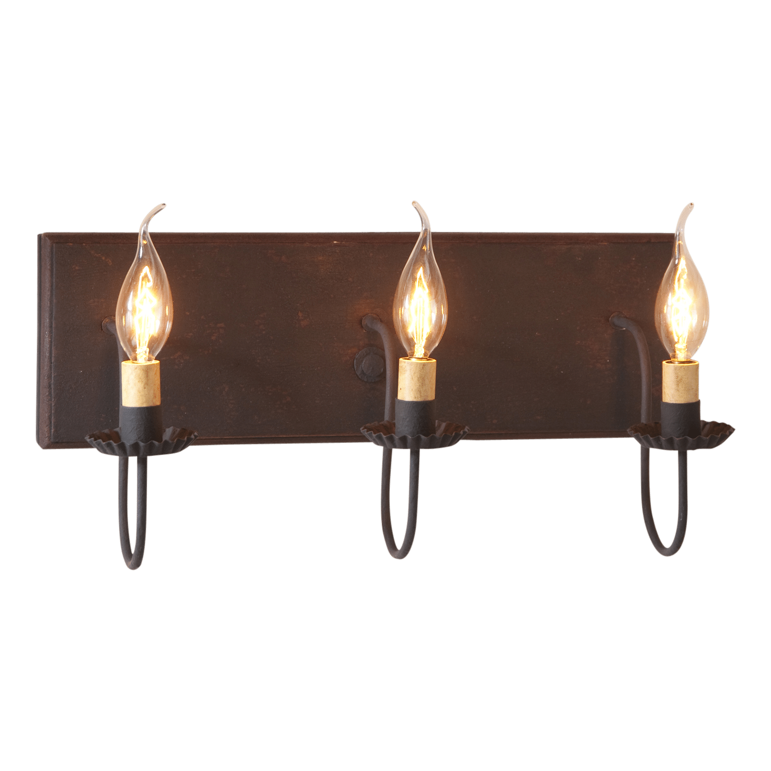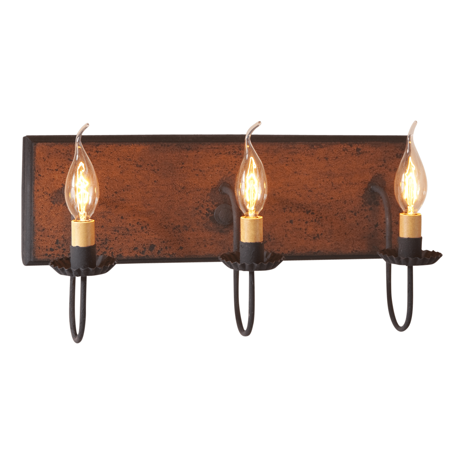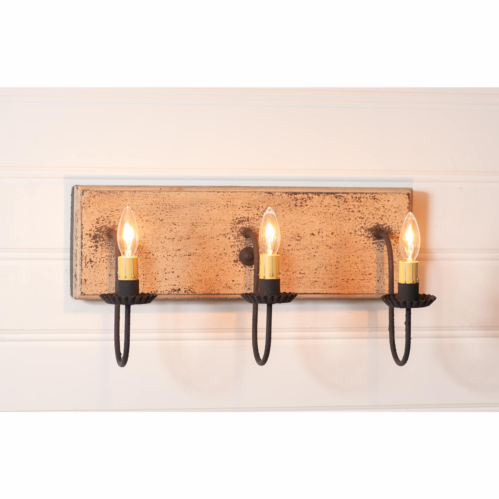 Bring warm, vintage-inspired charm to your home with our Three Arm Vanity Light in Hartford Colors. Perfect for illuminating a powder room, hallway, or entry, this classic fixture casts a generous glow while capturing the homespun beauty of the past. The solid Poplar hardwood back is hand-painted and features a heavily distressed finish, giving the piece an authentically aged, well-loved appearance. Decorative yet functional, this mirror light adds character and timeless style to any space, making it a favorite accent for rustic, farmhouse, and colonial décor.