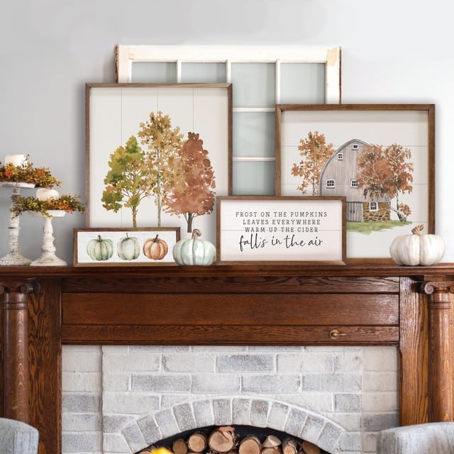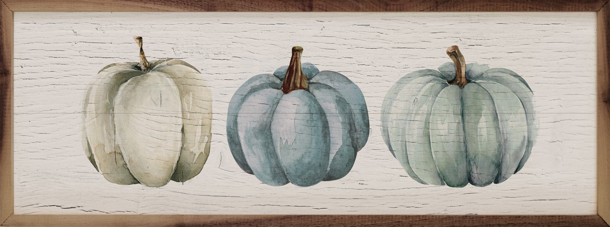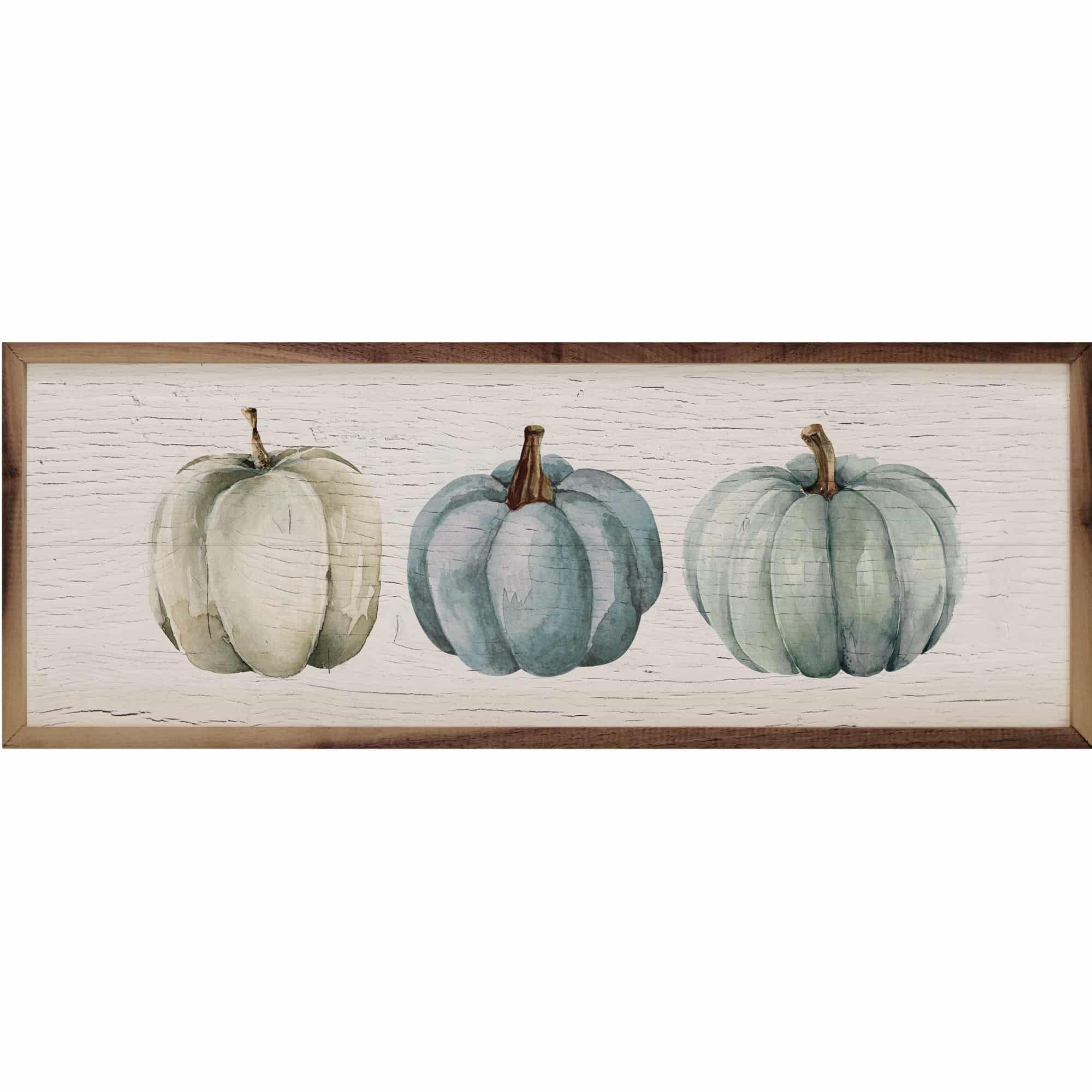 We are thrilled with the new trend in fall design that brings blue tones into the autumn color palette!! One of our favorites is the Pumpkins Blue Whitewash Wooden Sign. The sign features a trio of softly-shaded pumpkins in soft cream and dusty blues. The sign is unique in its horizontal format, (wider than it is tall) and the aged whitewash background adds character to its rustic appearance. The finishing touch is a wooden frame in a warm, natural tone that completes the overall design perfectly.