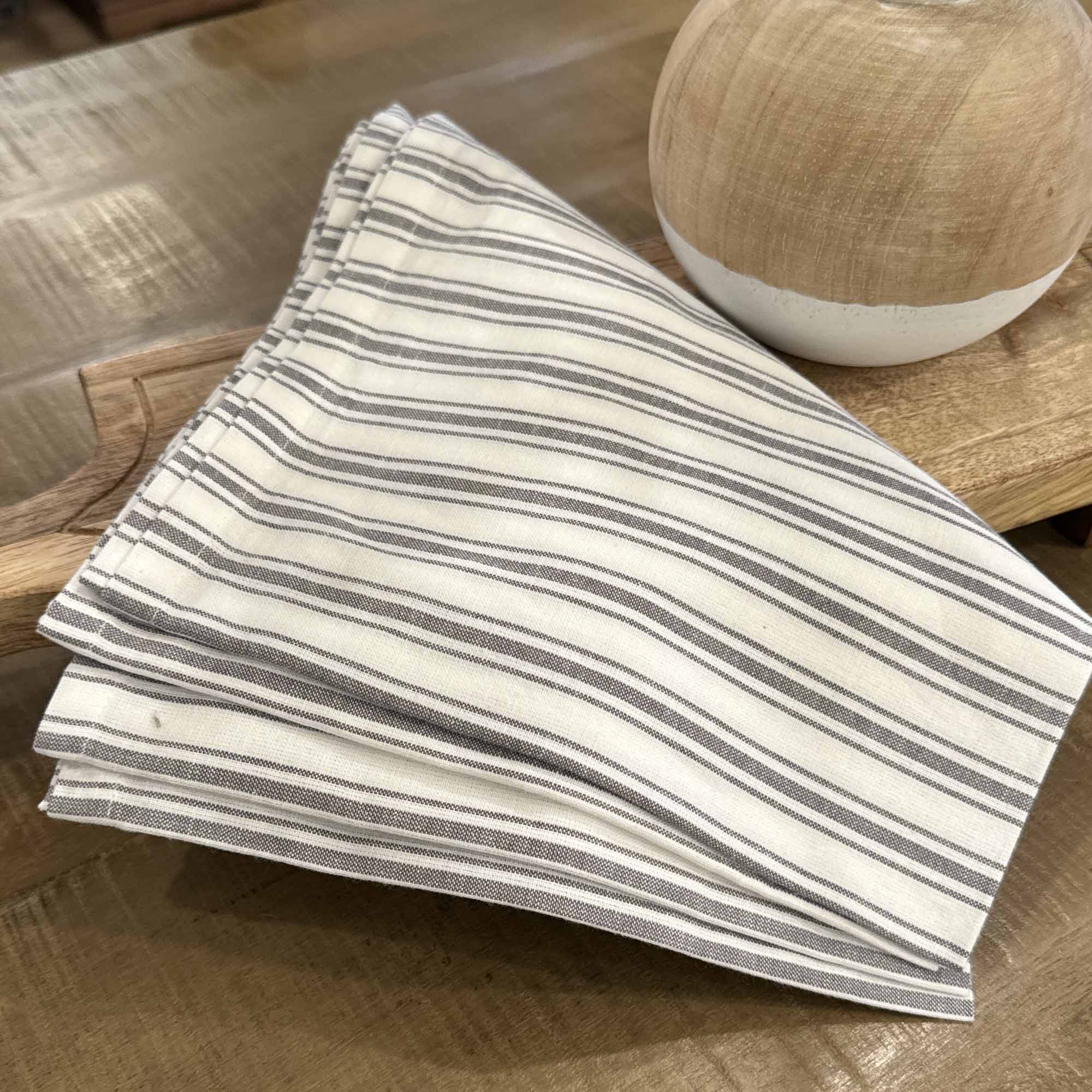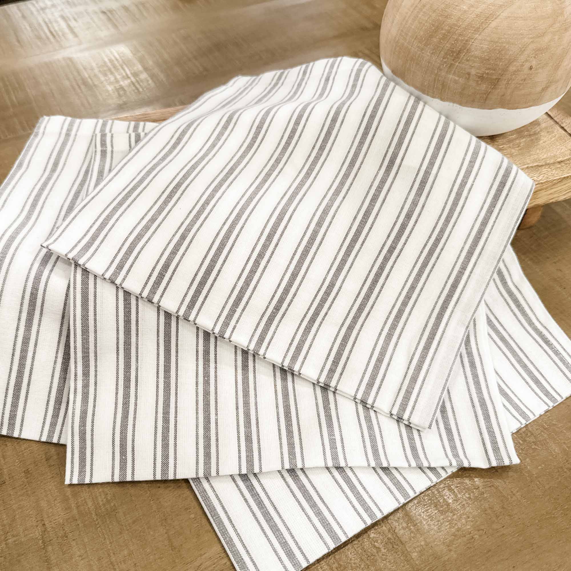 Nothing says farmhouse chic quite so clearly as the perfectly tailored stripes of our Timeless Ticking fabric. In this classic design, one main stripe is flanked by thinner stripes on either side, “feathering” the look in a softly tailored style. Dove gray combines with restful, creamy white in a classic striped pattern that adds instant vintage good looks to your tabletop in fresh and casually elegant ticking fabric. Sold as a set of 4.