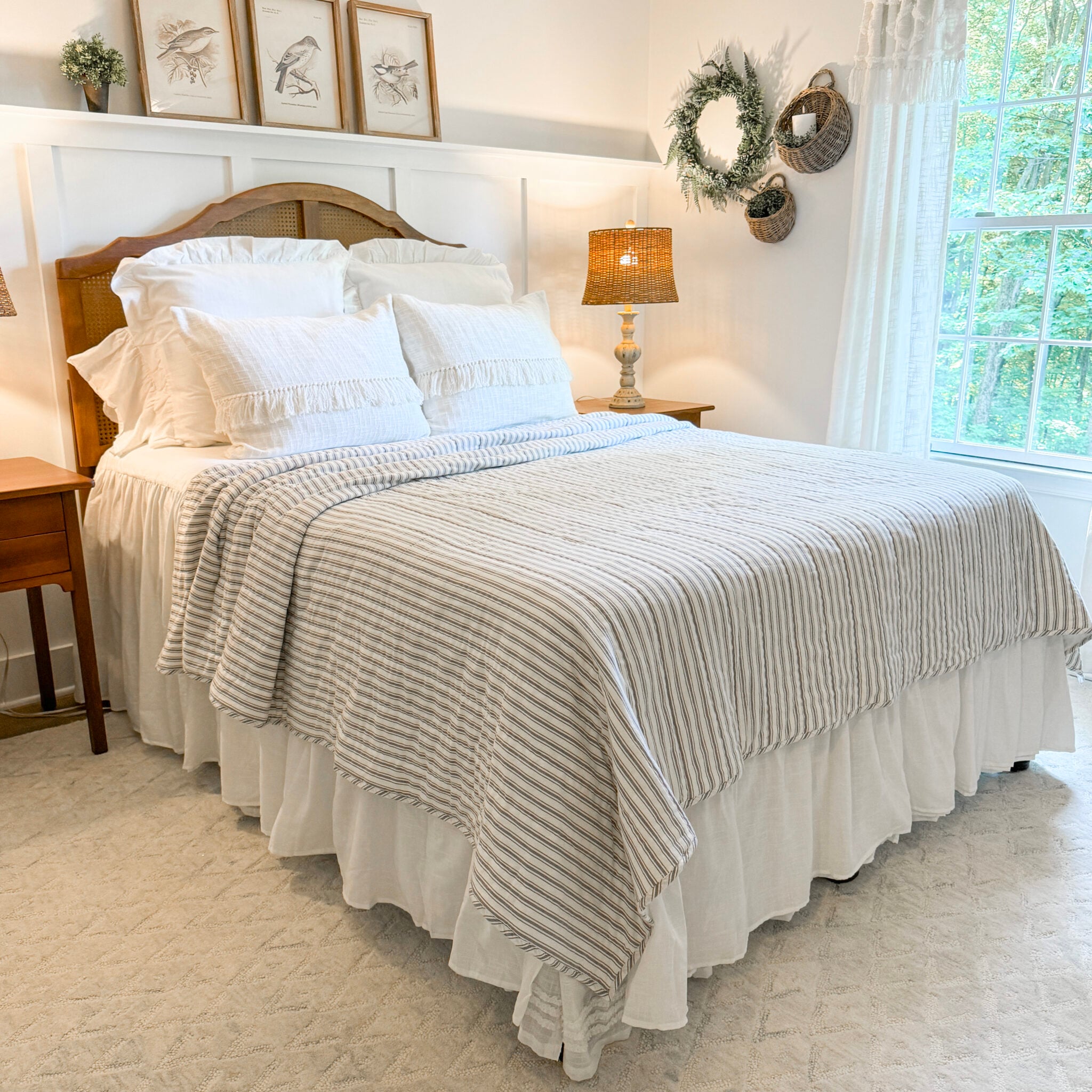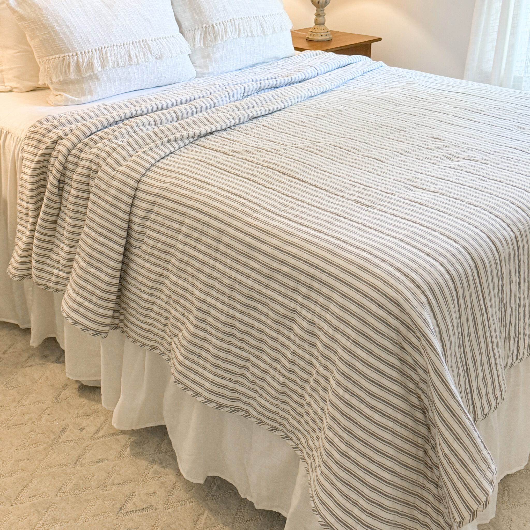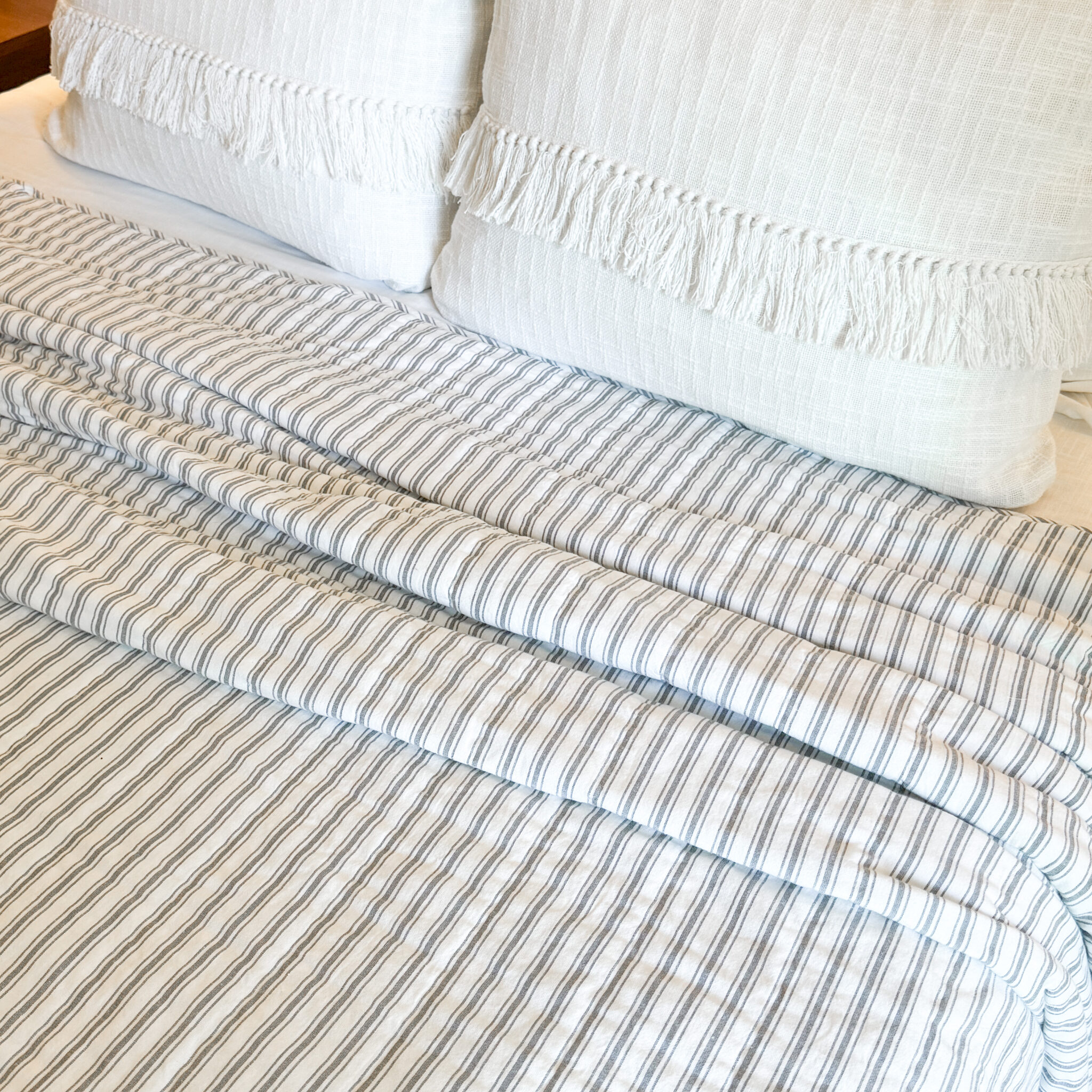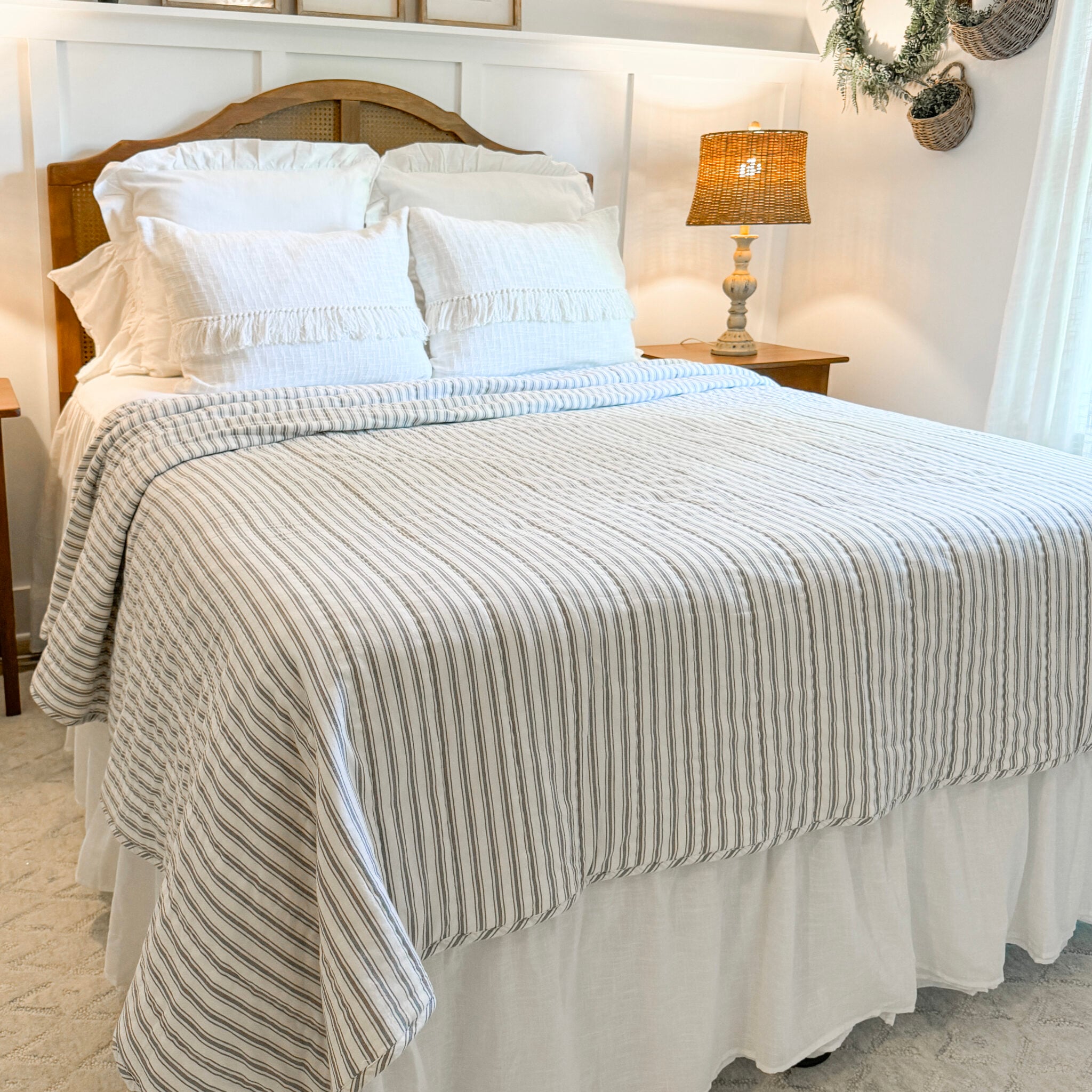 Nothing says farmhouse chic quite so clearly as the perfectly tailored stripes of our Timeless Ticking fabric. In this classic design, one main stripe is flanked by thinner stripes on either side, “feathering” out the look, creating a softly tailored style. Dove Gray combines with restful, creamy white in a classic striped pattern that is calming, charming, and familiar. Nonstop farmhouse style with a feminine flair is easily achieved when you bring home this fresh and casually elegant ticking fabric. Our Timeless Ticking Gray Quilts are made of 100% cotton shell and batting.
