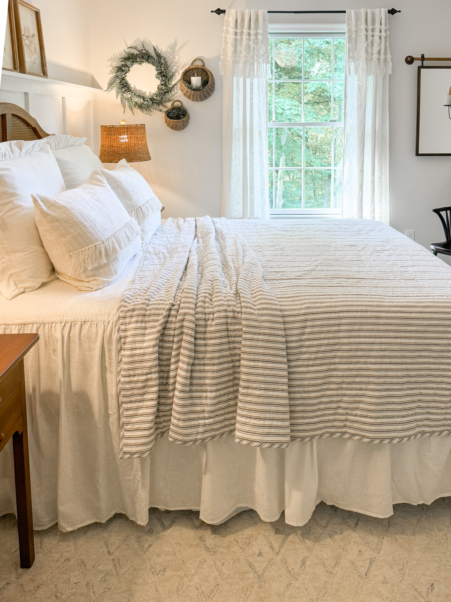 Crafted with care, the Timeless Ticking Gray Quilt, is a charming addition to any bedding ensemble blending classic design with cozy functionality. The quilt is filled with fluffy cotton batting adding a delightful loft and creating a luxurious layer of softness and warmth, perfect for snuggling up on cooler nights. The outside edge is meticulously finished with a ticking fabric binding, set on the bias to enhance its timeless look with a touch of subtle contrast. For extra comfort, the quilt’s backing is made from soft, cozy voile, ensuring a smooth and comfy feel against your skin. The backing is machine-quilted keeping the three layers of fabric firmly in place. This quilt is designed to bring both style and comfort to your home, offering the perfect balance of tradition and coziness in one beautiful piece.