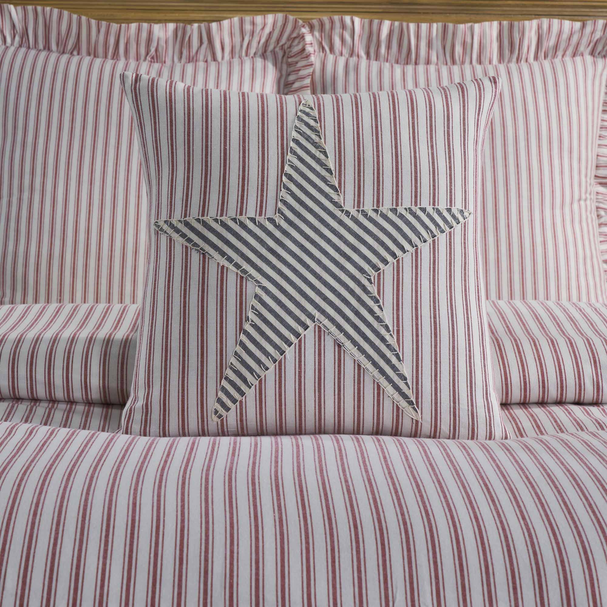 The Star Pillow Cover brings a new look to the beloved stars and stripes motif with a 15″ star (tip to tip) in blue ticking fabric that is set on a diagonal. Secured with a simple whipstitch in white thread, the accent brings instant homespun appeal. The pillow cover has two fabric-covered buttons (red ticking fabric) in the center on the back with a 3″ overlap of fabric to stabilize the buttons and add durability. An extra button is sewn on the inside of the cover.