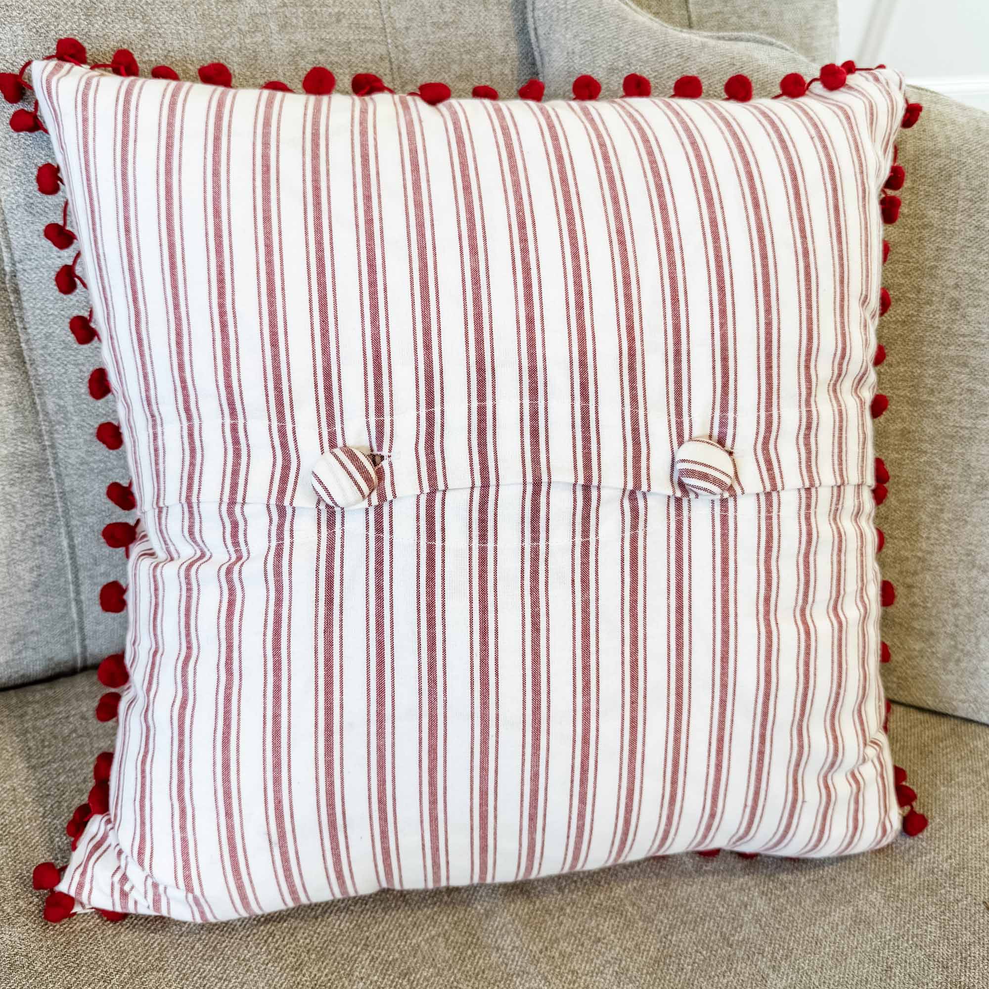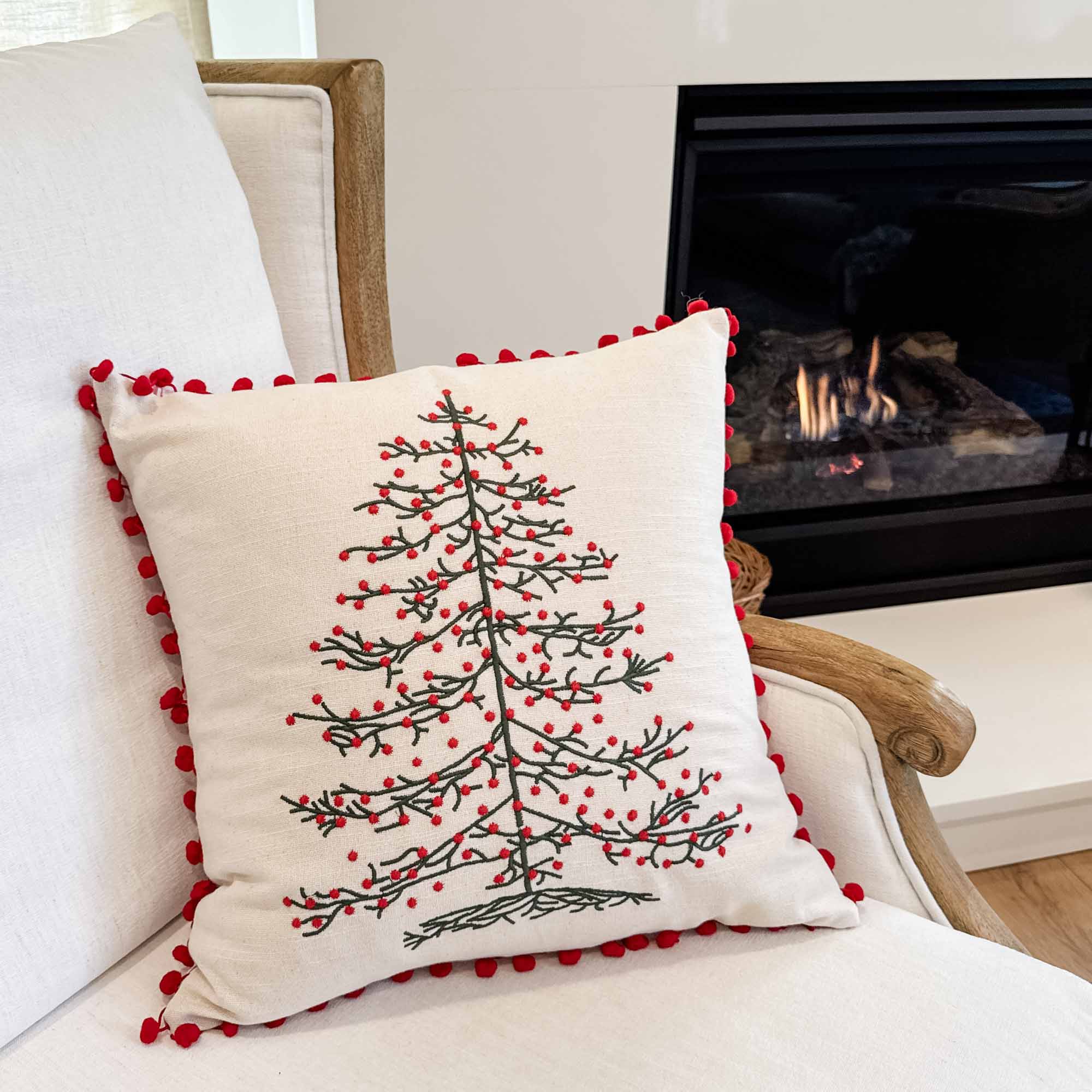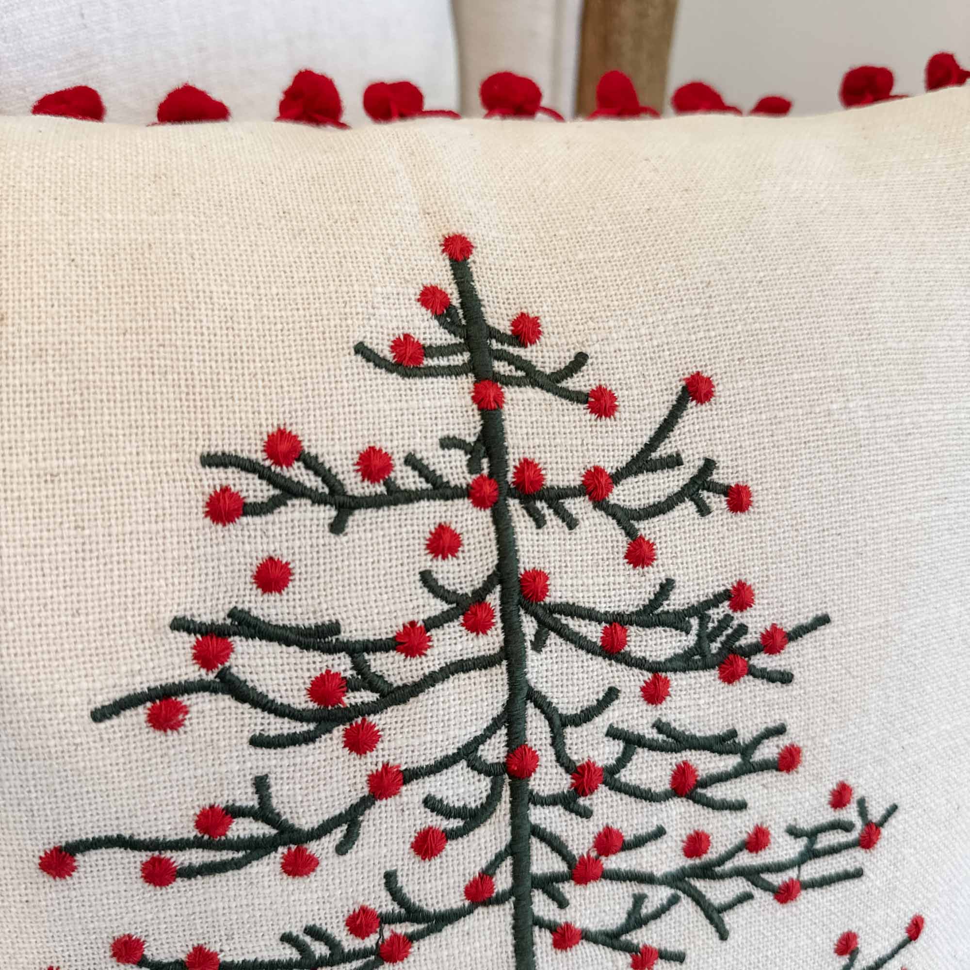 This Tree Pillow Cover features a design that has been popular for several years!! What a darling depiction of a tree! Finely-detailed embroidery creates this delicate green tree with its tiny red ornaments all highlighted beautifully against warm beige chambray fabric. Tiny red pompoms frame the outside edge and repeat the red of the ornaments on the tree, bringing a playful, whimsical feel to the accent. The pillow cover reverses to Timeless Red Ticking in perfectly tailored stripes with two fabric-covered buttons. (Also red ticking) A 3″ overlap of fabric at the opening stabilizes the buttons and an extra button is sewn inside the cover, just in case you need it.