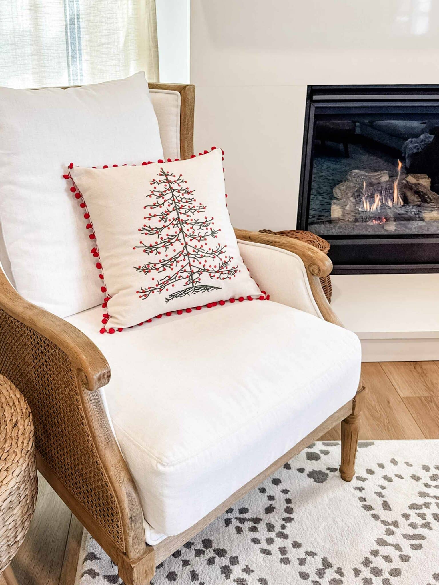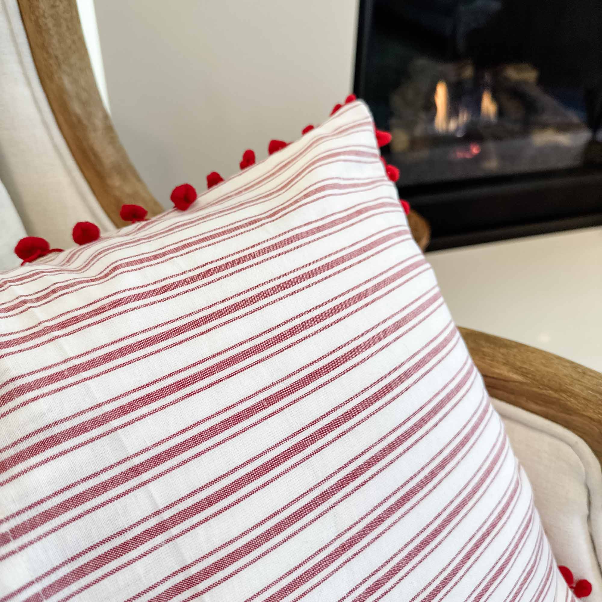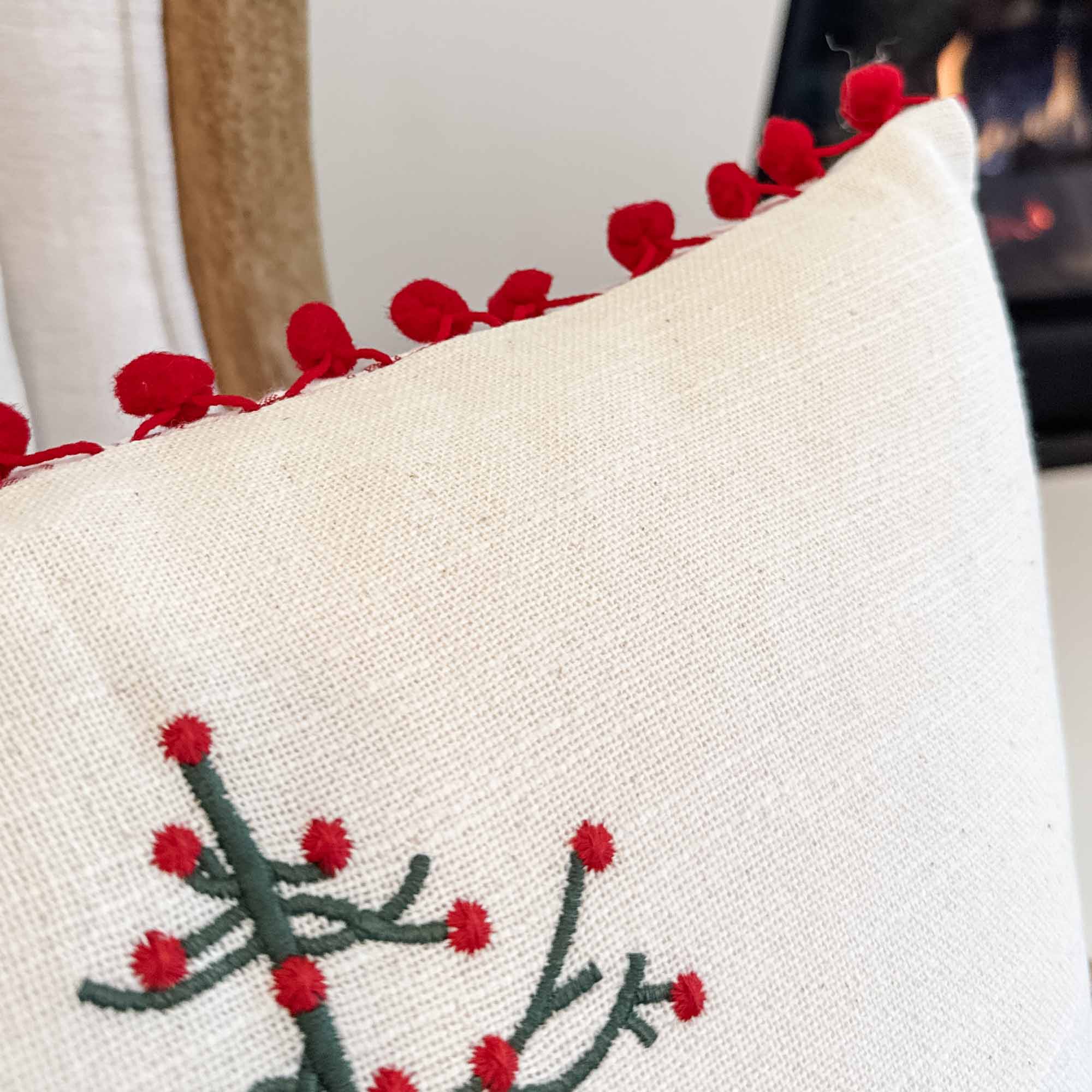 This Tree Pillow Cover features a design that has been popular for several years!! What a darling depiction of a tree! Finely-detailed embroidery creates this delicate green tree with its tiny red ornaments all highlighted beautifully against warm beige chambray fabric. Tiny red pompoms frame the outside edge and repeat the red of the ornaments on the tree, bringing a playful, whimsical feel to the accent. The pillow cover reverses to Timeless Red Ticking in perfectly tailored stripes with two fabric-covered buttons. (Also red ticking) A 3″ overlap of fabric at the opening stabilizes the buttons and an extra button is sewn inside the cover, just in case you need it.