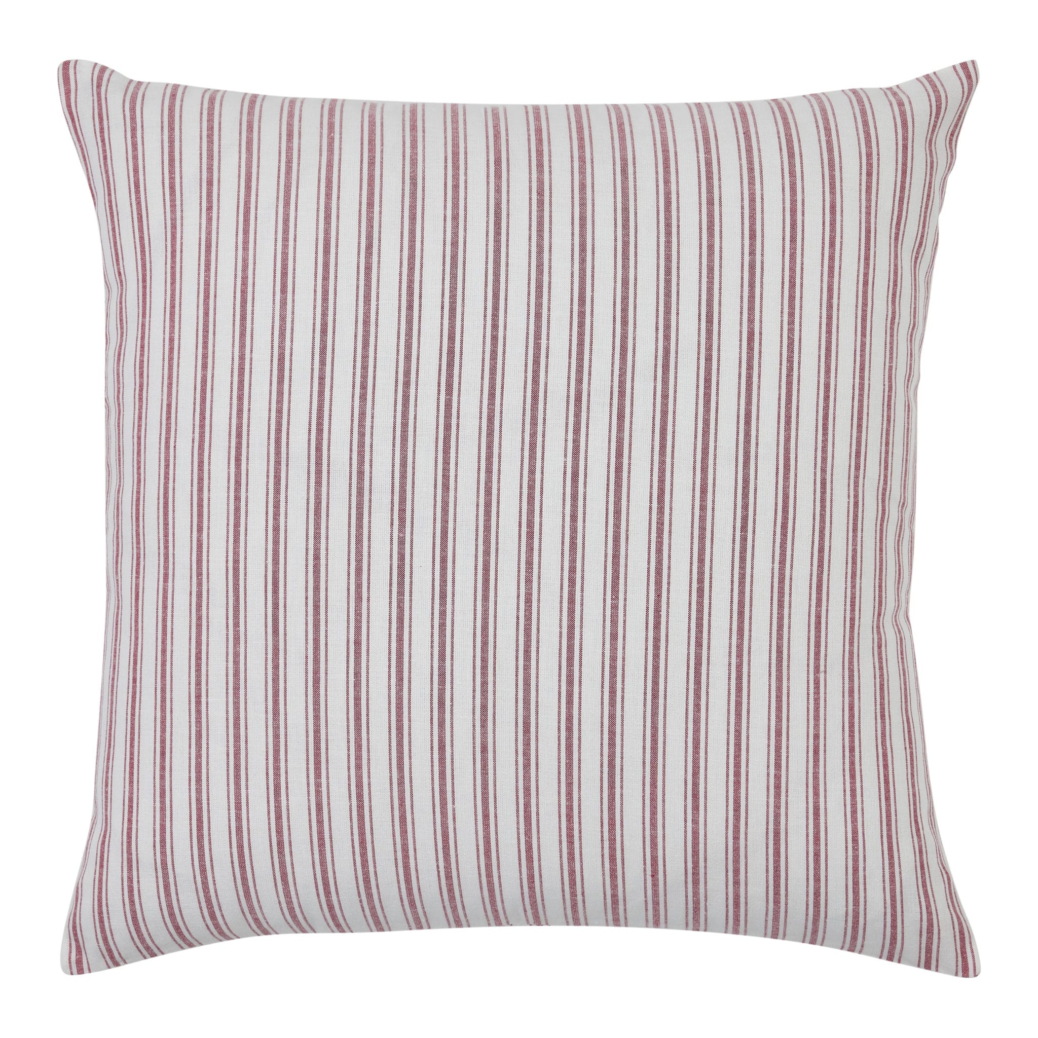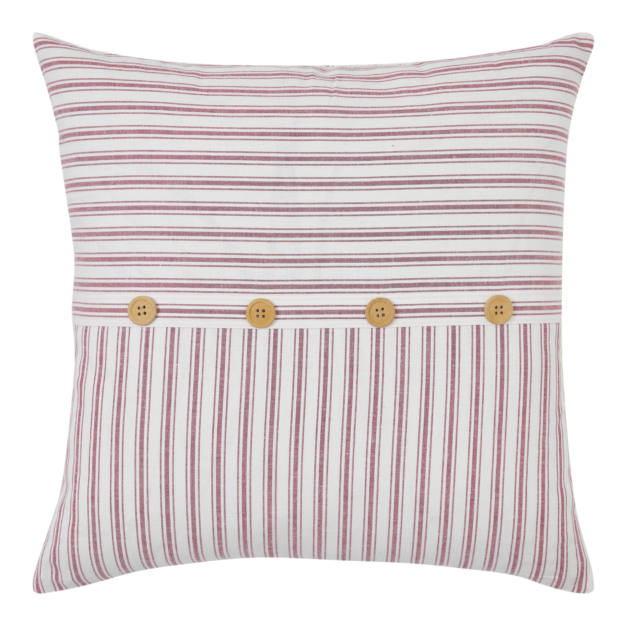 Nothing says farmhouse chic quite so clearly as the perfectly tailored stripes of our Timeless Ticking fabric. In this classic design, one main stripe is flanked by thinner stripes, “feathering” the look in a softly tailored style. True red combines with restful, creamy white in a classic striped pattern that brings classic vintage good looks. Nonstop farmhouse style is easily achieved when you bring home this unique pillow cover with its interesting, dynamic design. Horizontal stripes meet vertical in a striking pattern, accented with four natural-tone wooden buttons. The pillow cover reverses to Timeless Ticking fabric in a simple design of perfectly tailored stripes and no buttons. A hidden zipper provides closure for the insert of your choice, as the wooden buttons are purely decorative.