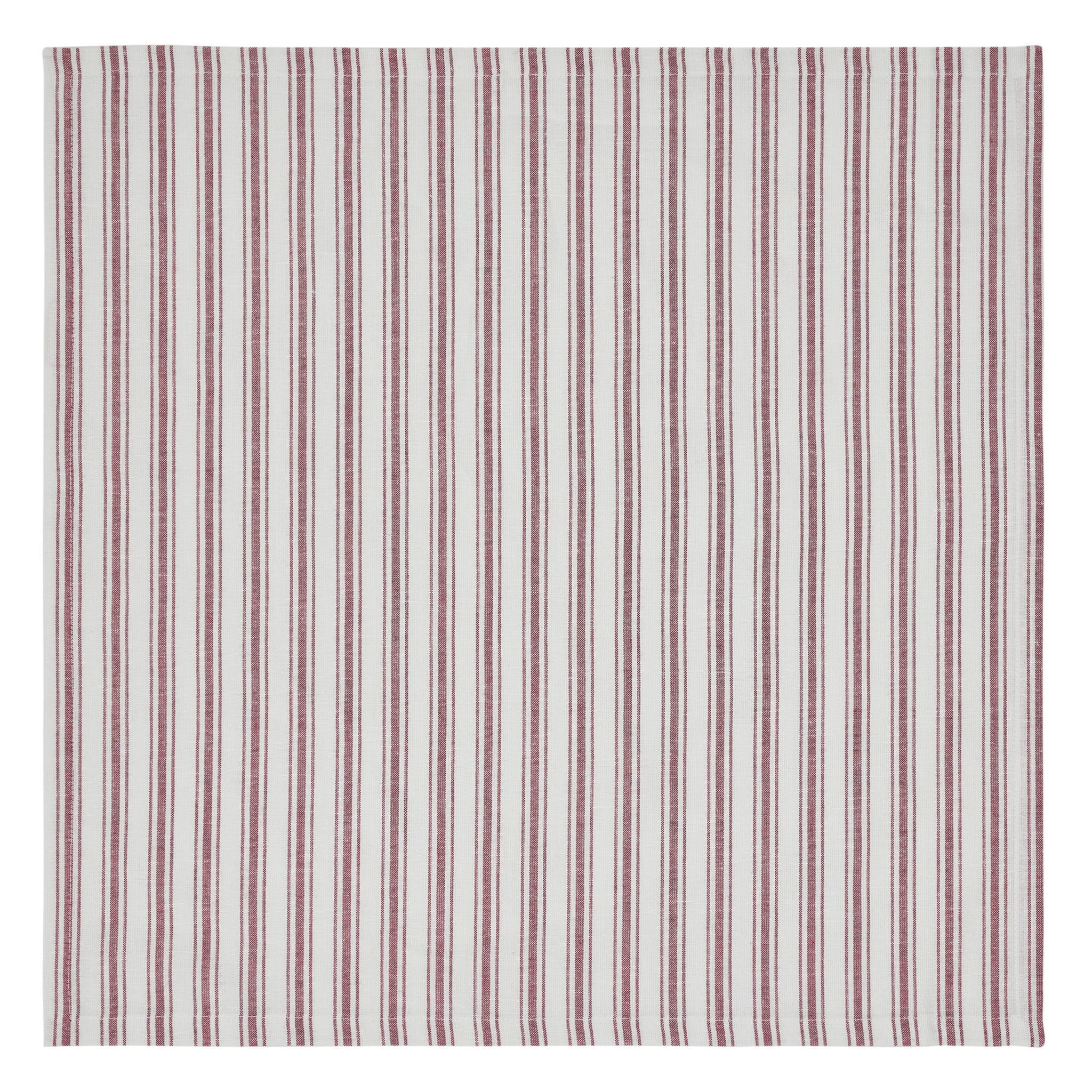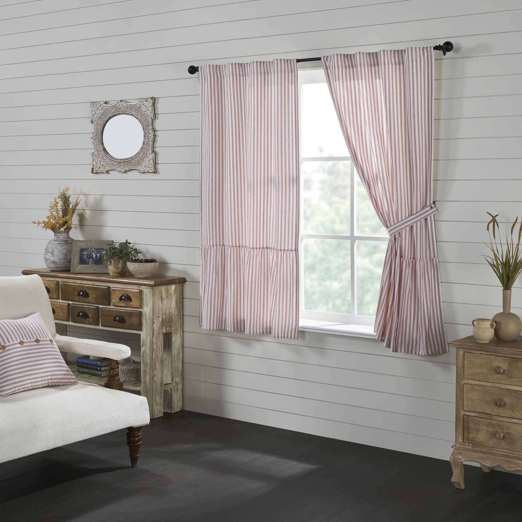 Nothing says farmhouse chic quite so well as the perfectly tailored stripes of our Timeless Ticking fabric. In this classic pattern, one stripe is flanked by thinner stripes on either side, “feathering” the look, to create a delicate and pleasing fade. True red combines with restful, creamy white in a familiar stripe pattern. You’ll be amazed at the instant transformation of your cozy farmhouse or vintage cottage by the softness and charm of these romantic ruffled curtains. The vertical stripes of the casually elegant fabric elongate your windows, creating a sense of height and lofty spaciousness. Fully lined, top to bottom, the drapes offer two layers of protection from the sun and the generous 24″ ruffle along the bottom adds dimension and flirty feminine appeal on a grand scale. A rod pocket and back tabs provide different hanging options and an extra layer of fabric at the top gives greater stability and reinforcement. Fabric curtain tiebacks are included, offering yet another display option. Set/2.