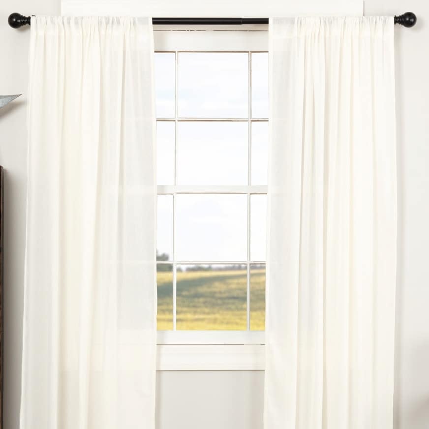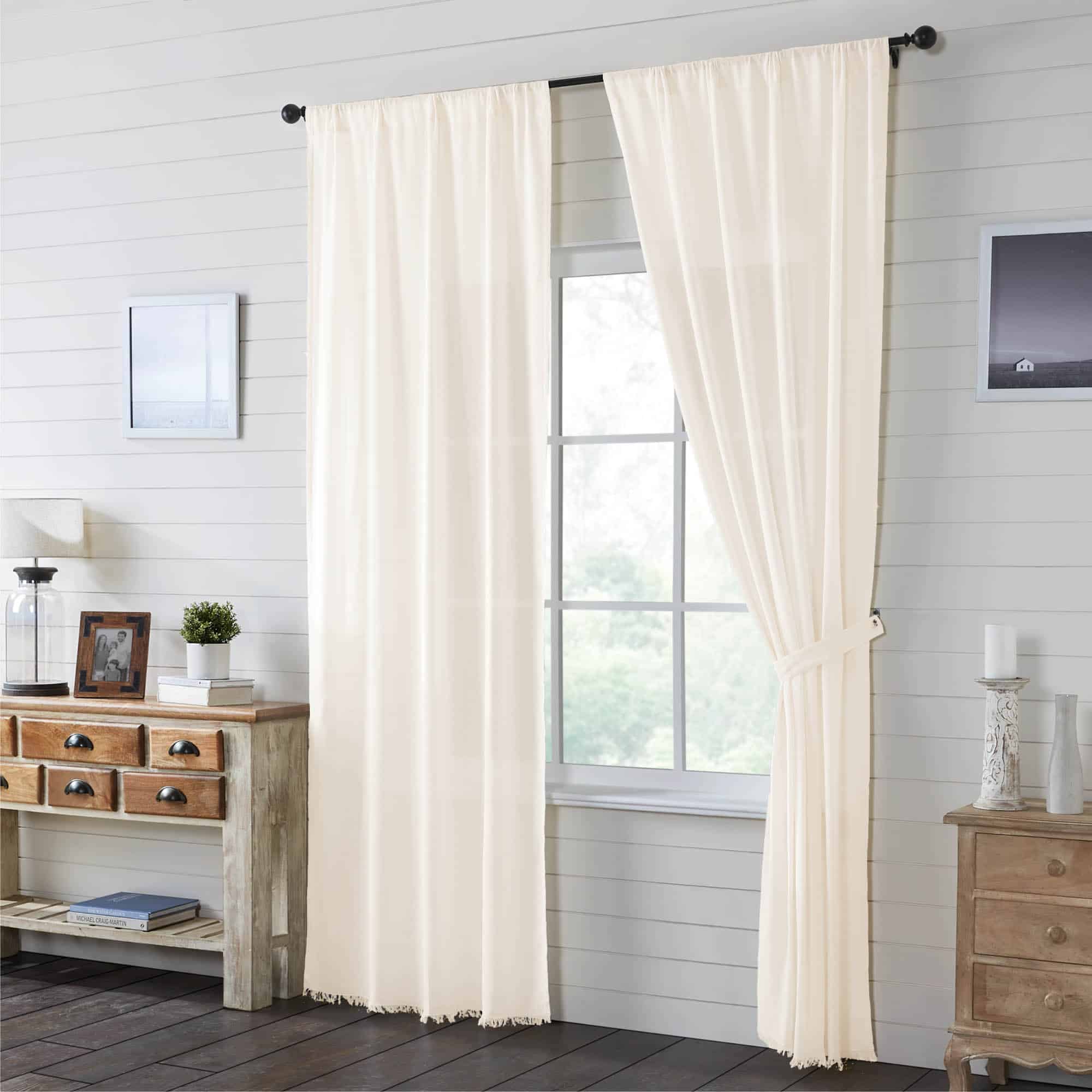 This panel has a sheer appearance for a light, transitional look to any room with lightweight tobacco cloth. The sheer fabric softly filters light creating a perfectly welcoming and bright environment. Features frayed edging and a rod pocket for easy hanging. With its neutral palette and simple texture, it can blend seamlessly with all your established Country Farmhouse, Modern Cottage, or Traditional decor. Includes two panels with matching tie-backs. Dry clean to preserve colors and minimize shrinkage or Spot Clean, Lay Flat to Dry, Iron Safe