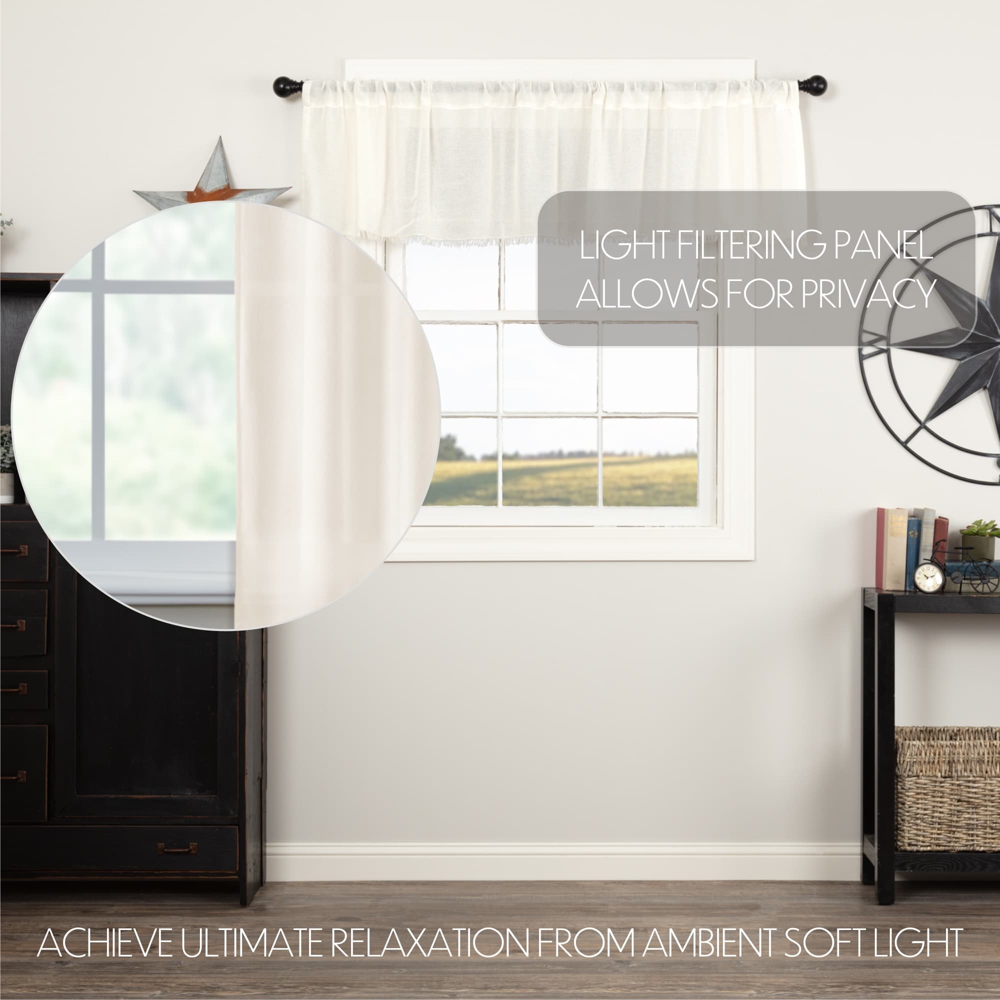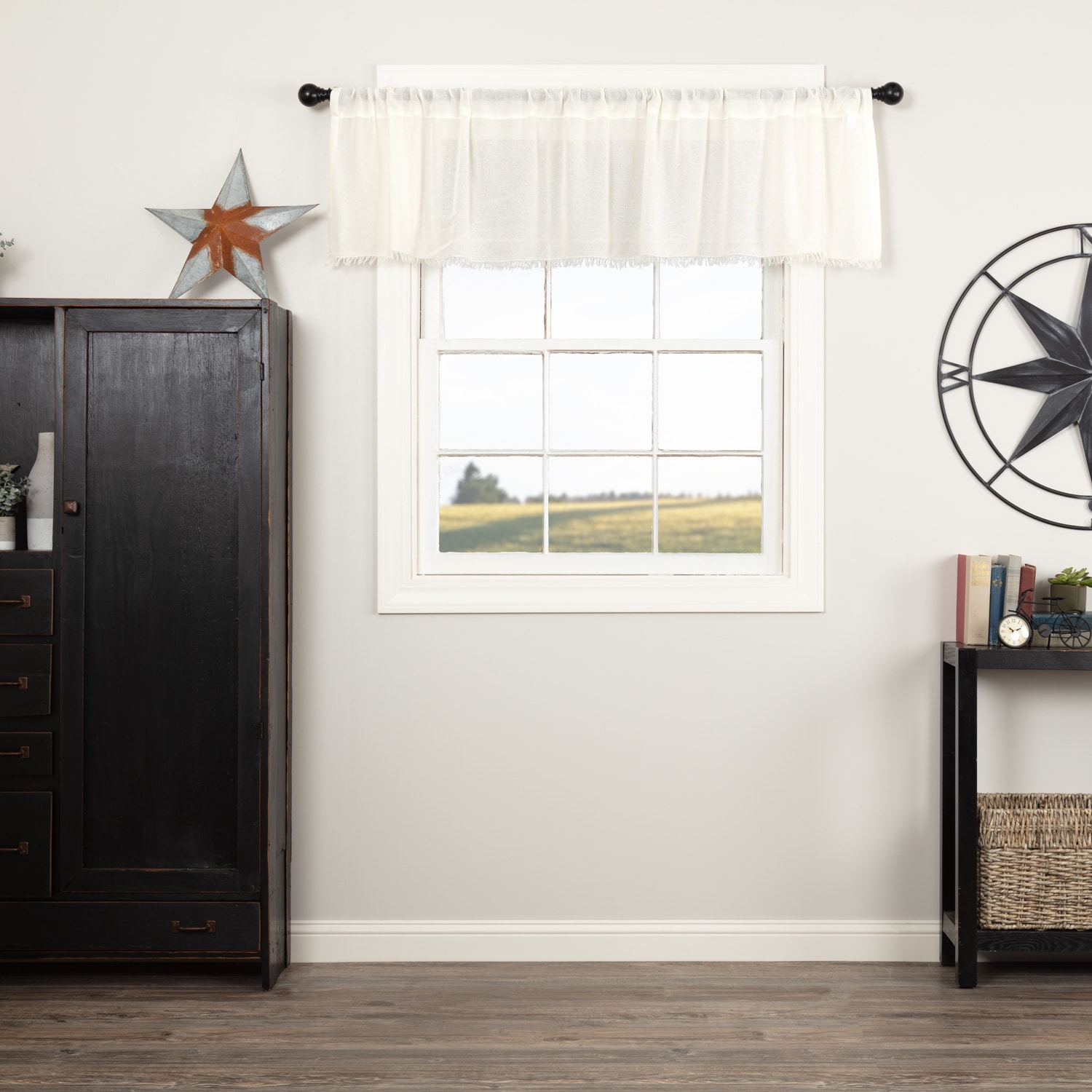 The Tobacco Cloth Antique White Valance Fringed brings a luxuriously upscale farmhouse look to your home or retreat. A lightweight antique white tobacco cloth drapes your window in sheer elegance with its soft and simple texture. The lightweight tobacco cloth offers a simple texture that compliments any decor. Dry Clean for best results and to avoid shrinkage. Or spot clean and Lay flat to dry.