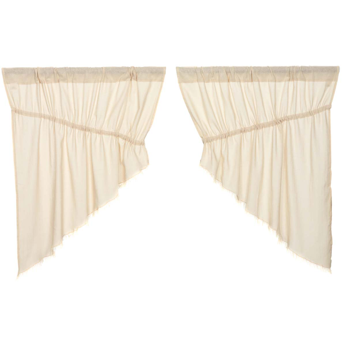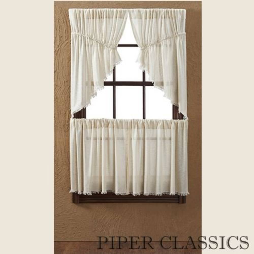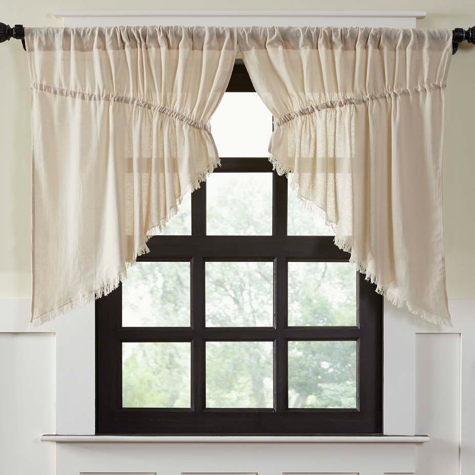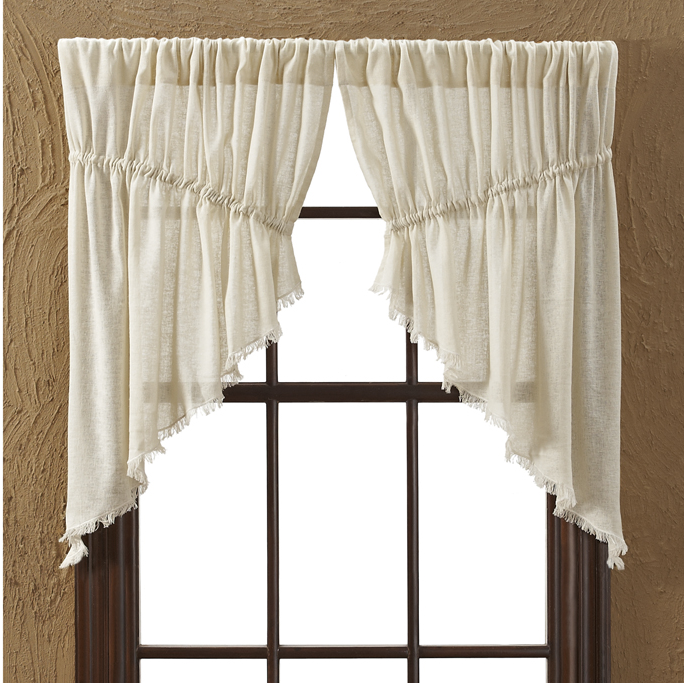 Tobacco Cloth Prairie Curtain lends a relaxed, casual feel to your decorating style, whether its Country, Farmhouse or Vintage. The airy, light cotton and gathered style creates a soft profile for your windows. Two mirrored swags per package (each 36″W) with drawstrings that adjust to most window widths. Dry clean for best results and to prevent shrinkage.